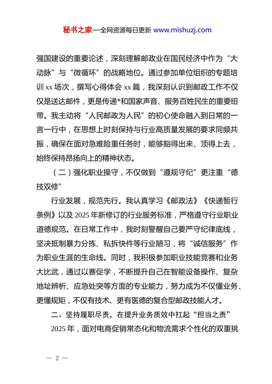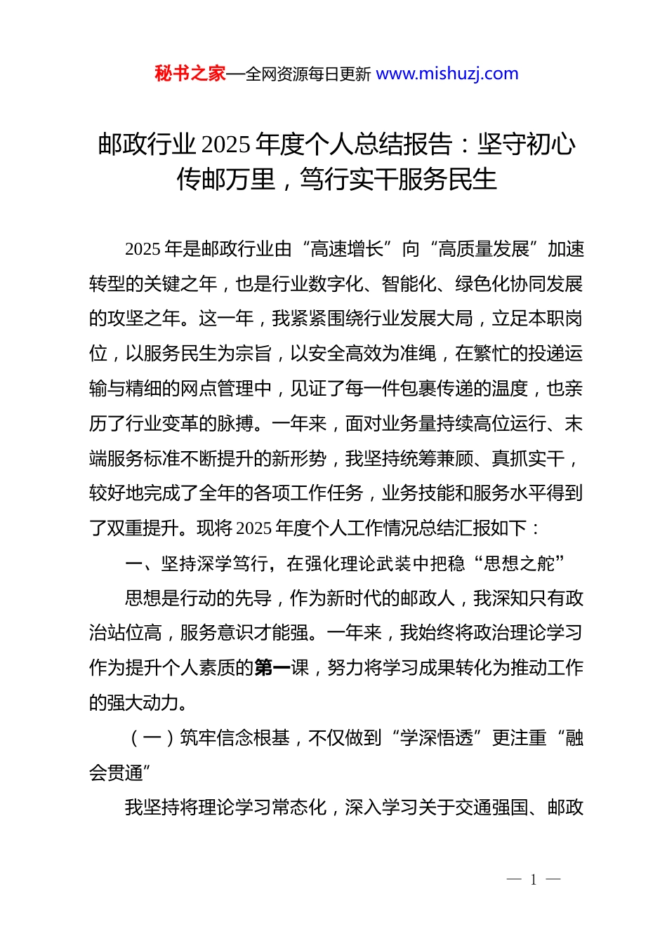 秘书之家—全网资源每日更新 www.mishuzj.com邮政行业 2025 年度个人总结报告:坚守初心传邮万里,笃行实干服务民生2025 年是邮政行业由“高速增长”向“高质量发展”加速转型的关键之年,也是行业数字化、智能化、绿色化协同发展的攻坚之年。这一年,我紧紧围绕行业发展大局,立足本职岗位,以服务民生为宗旨,以安全高效为准绳,在繁忙的投递运输与精细的网点管理中,见证了每一件包裹传递的温度,也亲历了行业变革的脉搏。一年来,面对业务量持续高位运行、末端服务标准不断提升的新形势,我坚持统筹兼顾、真抓实干,较好地完成了全年的各项工作任务,业务技能和服务水平得到了双重提升。现将 2025 年度个人工作情况总结汇报如下:一、坚持深学笃行,在强化理论武装中把稳“思想之舵”思想是行动的先导,作为新时代的邮政人,我深知只有政治站位高,服务意识才能强。一年来,我始终将政治理论学习作为提升个人素质的第一课,努力将学习成果转化为推动工作的强大动力。(一)筑牢信念根基,不仅做到“学深悟透”更注重“融会贯通”我坚持将理论学习常态化,深入学习关于交通强国、邮政— 1 —秘书之家—全网资源每日更新 www.mishuzj.com强国建设的重要论述,深刻理解邮政业在国民经济中作为“大动脉”与“微循环”的战略地位。通过参加单位组织的专题培训 xx 场次,撰写心得体会 xx 篇,我深刻认识到邮政工作不仅仅是送达邮件,更是传递*和国家声音、服务百姓民生的重要纽带。我主动将“人民邮政为人民”的初心使命融入到日常的一言一行中,在思想上时刻保持与行业高质量发展的要求同频共振,确保在面对急难险重任务时,能够豁得出来、顶得上去,始终保持昂扬向上的精神状态。(二)强化职业操守,不仅做到“遵规守纪”更注重“德技双修”行业发展,规范先行。我认真学习《邮政法》《快递暂行条例》以及 2025 年新修订的行业服务标准,严格遵守行业职业道德规范。在日常工作中,我时刻警醒自己要严守纪律底线,坚决抵制暴力分拣、私拆快件等行业陋习,将“诚信服务”作为职业生涯的生命线。同时,我积极参加职业技能竞赛和业务大比武,通过以赛促学,不断提升自己在智能设备操作、复杂地址辨析、应急处突等方面的专业能力,努力成为不仅懂业务、更懂规矩,不仅有技术、更有医德的复合型邮政技能人才。二、坚持履职尽责,在提升业务质效中扛起“担当之责”2025 年,面对电商促销常态化和物流需求个性化的双重挑— 2 —秘书之家—全网资源每日更新 www.mishuzj.com战,我立足岗位职责,聚焦主责主业,在提升投递速度、优化服务质量、保障寄递安全等方面不仅“做了”,而且“做好了”,用实际行动诠释了邮政人的责任与担当。(一)聚焦主业提速,在优化流程中跑出“邮政速度”效率是邮政行业的生命线。为了应对 2025 年日益增长的包裹量,特别是应对“618”、“双 11”等业务旺季的洪峰考验,我主动优化作业流程。首先,我利用业余时间对所负责区域的xx 个街道、xx 个小区进行了深度摸排,绘制了精准的“投递路线图”,通过科学规划路线,有效避开拥堵路段,平均每天节省路途时间 xx 分钟。其次,我熟练掌握了新一代智能终端 pda的使用技巧,实现了快件的秒级扫描、实时上传,大大缩短了分拣和录入时间。据统计,2025 年我个人累计处理各类邮件、快件 xx 万件,日均投递量达到 xx 件,妥投率保持在 xx%以上,特别是在旺季高峰期,我连续奋战,确保了责任区内邮件“零积压”、投递“零延误”,真正跑出了便民服务的加速度。(二)聚焦服务提质,在为民解忧中传递“邮政温度”服务质量是赢得客户口碑的关键。我始终坚持“用户至上”的服务理念,努力让每一次服务都充满温度。一方面,针对老年群体和行动不便的特殊客户,我建立了“爱心服务台账”,主动提供上门揽收、送货入户等延伸服务,累计为特殊— 3 —秘书之家—全网资源每日更新 www.mishuzj.com群体提供上门服务 xx 人次,切实解决了他们取件难的问题。另一方面,面对客户的咨询和投诉,我坚持实行“首问负责制”,做到件件有着落、事事有回音。在处理一起因地址模糊导致的疑难邮件投...