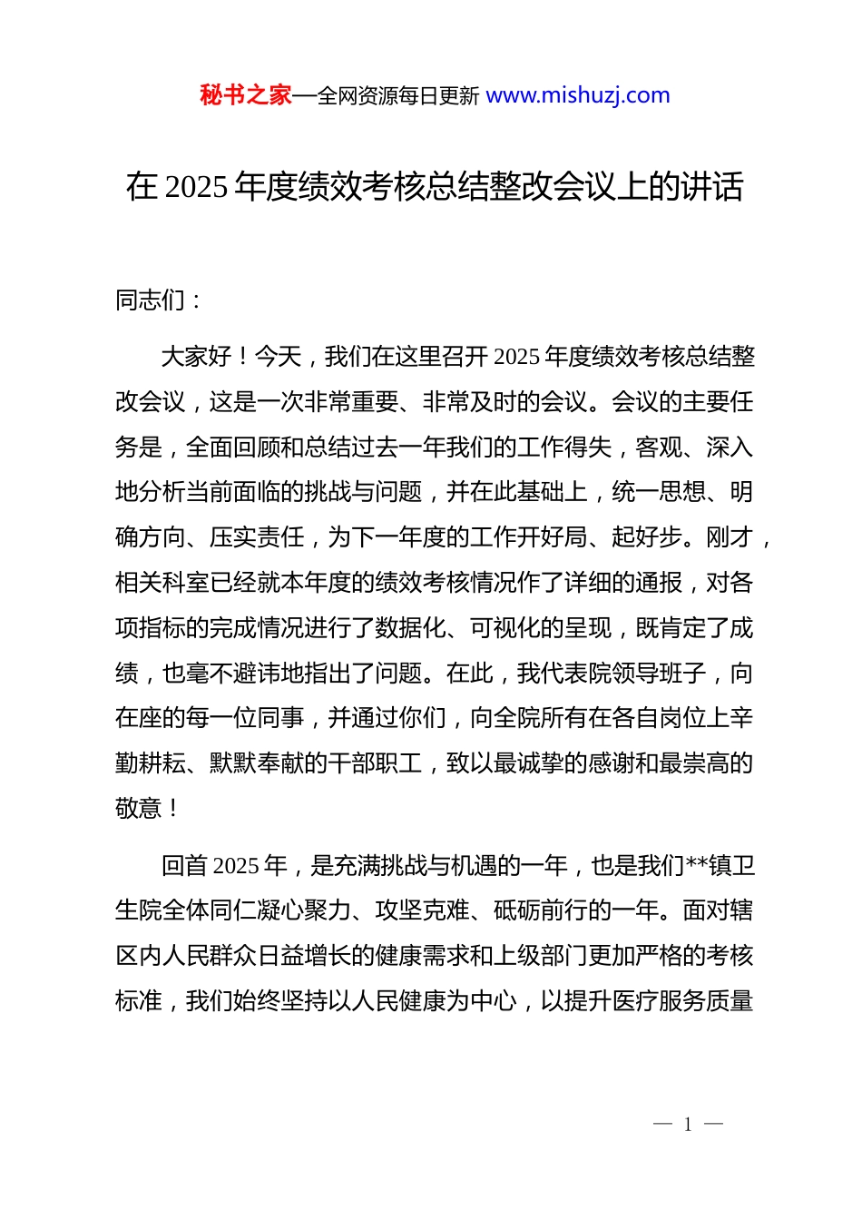 秘书之家—全网资源每日更新 www.mishuzj.com在 2025 年度绩效考核总结整改会议上的讲话同志们:大家好!今天,我们在这里召开 2025 年度绩效考核总结整改会议,这是一次非常重要、非常及时的会议。会议的主要任务是,全面回顾和总结过去一年我们的工作得失,客观、深入地分析当前面临的挑战与问题,并在此基础上,统一思想、明确方向、压实责任,为下一年度的工作开好局、起好步。刚才,相关科室已经就本年度的绩效考核情况作了详细的通报,对各项指标的完成情况进行了数据化、可视化的呈现,既肯定了成绩,也毫不避讳地指出了问题。在此,我代表院领导班子,向在座的每一位同事,并通过你们,向全院所有在各自岗位上辛勤耕耘、默默奉献的干部职工,致以最诚挚的感谢和最崇高的敬意!回首 2025 年,是充满挑战与机遇的一年,也是我们**镇卫生院全体同仁凝心聚力、攻坚克难、砥砺前行的一年。面对辖区内人民群众日益增长的健康需求和上级部门更加严格的考核标准,我们始终坚持以人民健康为中心,以提升医疗服务质量— 1 —秘书之家—全网资源每日更新 www.mishuzj.com为核心,扎实推进各项工作,取得了一系列来之不易的成绩。第一,我们的 dj 引领作用得到了新加强。我们始终坚持把*的建设放在首位,通过不断深化理论学习、规范组织生活、强化*员教育管理,将 dj 工作与业务工作深度融合。院*支部的战斗堡垒作用和*员的先锋模范作用在日常诊疗、公共卫生服务、疫情防控等急难险重任务中得到了充分体现。风清气正的政治生态,为我院各项事业的健康发展提供了坚强的政治保障和组织保障。第二,我们的核心业务能力实现了新提升。在基本医疗方面,我们优化了诊疗流程,加强了医疗质量控制,全年门诊服务人次保持稳健增长,群众就医体验和满意度评价持续向好。在公共卫生服务领域,我们不折不扣地完成了国家基本公共卫生服务项目,家庭医生签约服务的覆盖面和内涵质量稳步提升,特别是在慢性病管理上,我们构建了“筛查、干预、随访”一体化服务模式,管理质量在同级医疗机构中名列前茅。这些成绩的取得,离不开我们在座各位,特别是奋战在一线的医护人员夜以继日的辛勤付出。第三,我们的团队协作精神展现了新风貌。一年来,无论是日常的科室协作,还是应对突发公共卫生事件的应急联动,— 2 —秘书之家—全网资源每日更新 www.mishuzj.com全院上下都能做到心往一处想、劲往一处使,形成了强大的工作合力。宣传部门积极发声,有效提升了我院的社会形象和群众认知度;后勤保障部门恪尽职守,为临床一线提供了坚实可靠的支持。正是这种团结协作、甘于奉献的精神,构成了我们战胜一切困难、不断取得进步的最宝贵财富。在肯定成绩的同时,我们更要用一种审慎、严谨的态度,清醒地认识到工作中存在的短板和不足。绩效考核不仅是一张“成绩单”,更是一面“镜子”,它能照出我们工作中的亮点,更能清晰地反映出我们存在的弱点和盲点。刚才通报中提到的问题,字字句句都敲打在我们心上,必须引起我们高度的警惕和深刻的反思。这些问题,绝不是个别科室、个别人员的问题,而是我们全院在管理理念、工作机制、执行能力等方面存在的共性问题。我认为,当前我们主要面临以下三个层面的挑战:首先,是服务理念的“最后一公里”尚未完全打通。我们常说“以患者为中心”,但这句话是否真正内化于心、外化于行了?通报中提到“部分科室服务响应效率有待提高”,这背后反映的是什么?可能是流程设置不合理,也可能是岗位责任心不强,但归根结底,是我们还没有完全站在患者的角度去思考问题、优化服务。再比如,“慢病患者的知晓率较低”这一— 3 —秘书之家—全网资源每日更新 www.mishuzj.com问题,我们做了大量的随访和管理工作,数据上很漂亮,但患者对自己病情的了解程度、自我管理的能力却没有相应提升,这说明我们的健康教育模式还停留在“我讲你听”的单向灌输阶段,缺乏有效的互动和个体化的指导,我们的工作没有真正做到患者心里去。其次,是数据化、信息化管理的深度应用严重不足。我们投入了大量资源建设信息化系统,但“信息化系统应用深度不足”的问题却反复出现。我...