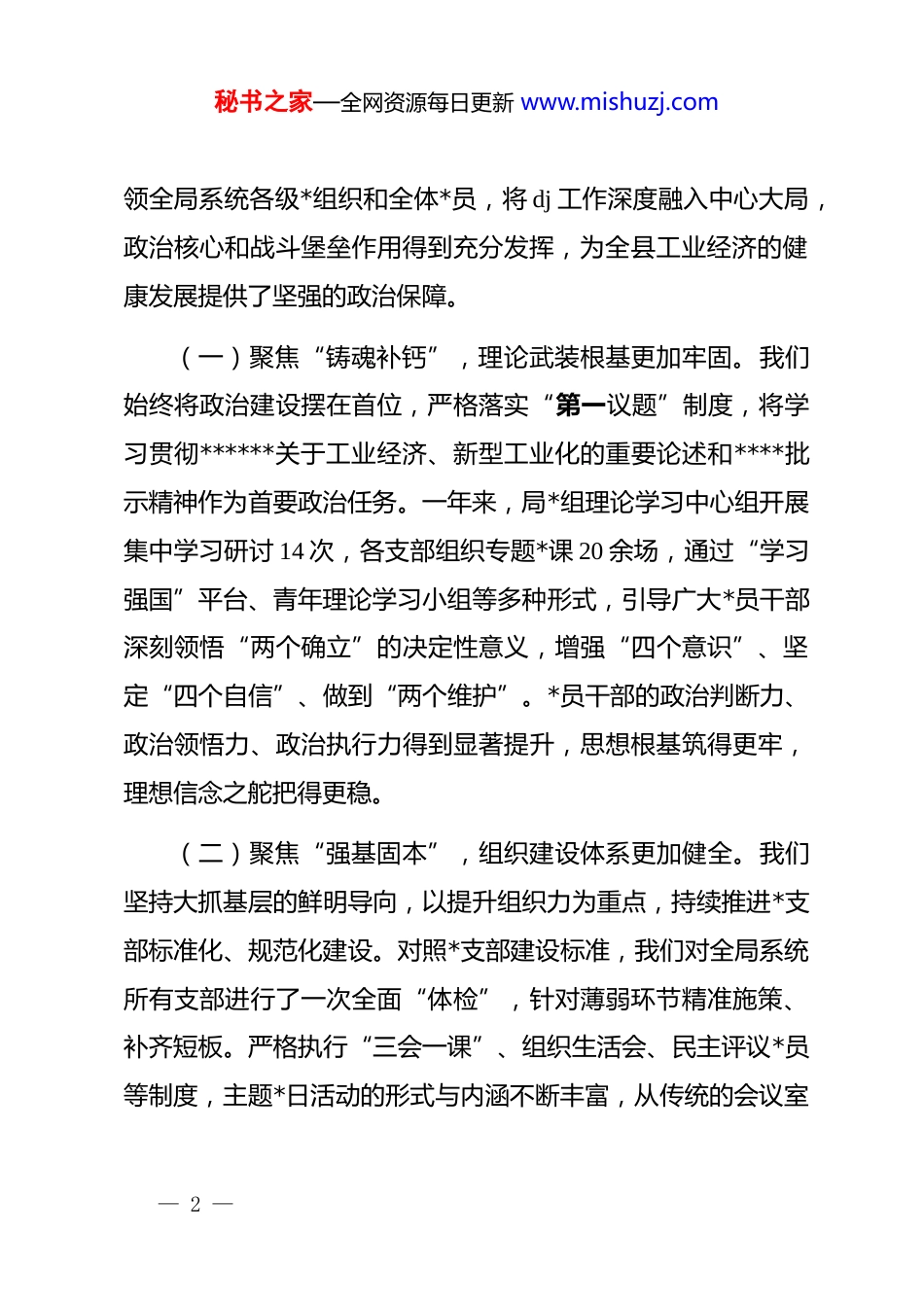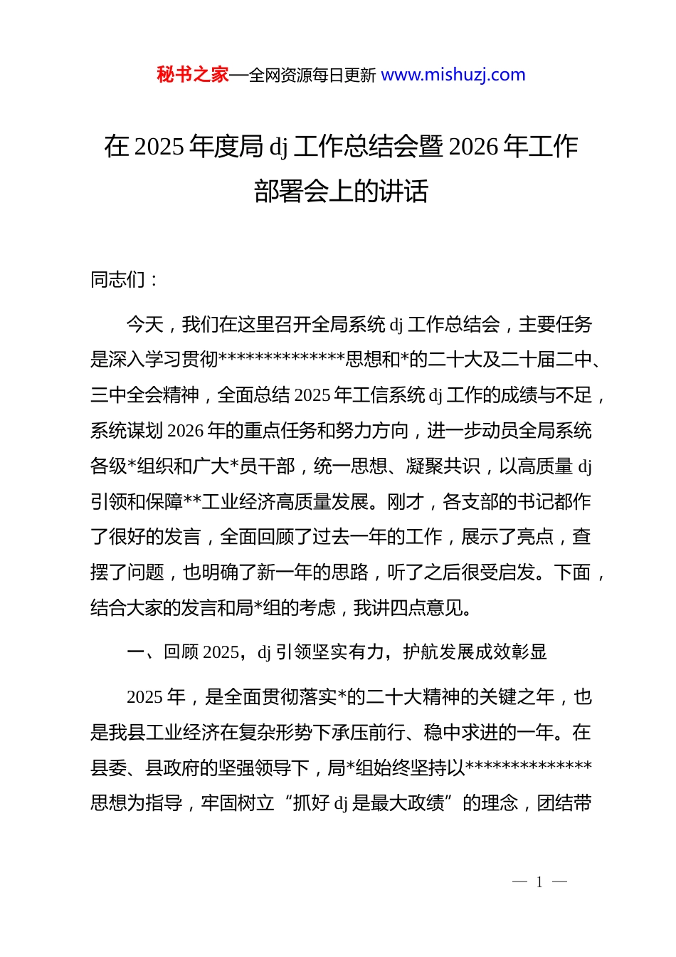 秘书之家—全网资源每日更新 www.mishuzj.com在 2025 年度局 dj 工作总结会暨 2026 年工作部署会上的讲话同志们:今天,我们在这里召开全局系统 dj 工作总结会,主要任务是深入学习贯彻**************思想和*的二十大及二十届二中、三中全会精神,全面总结 2025 年工信系统 dj 工作的成绩与不足,系统谋划 2026 年的重点任务和努力方向,进一步动员全局系统各级*组织和广大*员干部,统一思想、凝聚共识,以高质量 dj引领和保障**工业经济高质量发展。刚才,各支部的书记都作了很好的发言,全面回顾了过去一年的工作,展示了亮点,查摆了问题,也明确了新一年的思路,听了之后很受启发。下面,结合大家的发言和局*组的考虑,我讲四点意见。一、回顾 2025,dj 引领坚实有力,护航发展成效彰显2025 年,是全面贯彻落实*的二十大精神的关键之年,也是我县工业经济在复杂形势下承压前行、稳中求进的一年。在县委、县政府的坚强领导下,局*组始终坚持以**************思想为指导,牢固树立“抓好 dj 是最大政绩”的理念,团结带— 1 —秘书之家—全网资源每日更新 www.mishuzj.com领全局系统各级*组织和全体*员,将 dj 工作深度融入中心大局,政治核心和战斗堡垒作用得到充分发挥,为全县工业经济的健康发展提供了坚强的政治保障。(一)聚焦“铸魂补钙”,理论武装根基更加牢固。我们始终将政治建设摆在首位,严格落实“第一议题”制度,将学习贯彻******关于工业经济、新型工业化的重要论述和****批示精神作为首要政治任务。一年来,局*组理论学习中心组开展集中学习研讨 14 次,各支部组织专题*课 20 余场,通过“学习强国”平台、青年理论学习小组等多种形式,引导广大*员干部深刻领悟“两个确立”的决定性意义,增强“四个意识”、坚定“四个自信”、做到“两个维护”。*员干部的政治判断力、政治领悟力、政治执行力得到显著提升,思想根基筑得更牢,理想信念之舵把得更稳。(二)聚焦“强基固本”,组织建设体系更加健全。我们坚持大抓基层的鲜明导向,以提升组织力为重点,持续推进*支部标准化、规范化建设。对照*支部建设标准,我们对全局系统所有支部进行了一次全面“体检”,针对薄弱环节精准施策、补齐短板。严格执行“三会一课”、组织生活会、民主评议*员等制度,主题*日活动的形式与内涵不断丰富,从传统的会议室— 2 —秘书之家—全网资源每日更新 www.mishuzj.com学习,拓展到深入企业生产一线、项目建设现场开展“现场*课”,让组织生活更有“*味”、更接“地气”。同时,我们注重在业务骨干和青年人才中发展*员,今年共发展新*员 5 名,为*员队伍注入了新鲜血液,基层*组织的创造力、凝聚力和战斗力持续增强。(三)聚焦“正风肃纪”,干部队伍作风更加过硬。我们坚定不移推进全面从严治*,以刀刃向内的自我革命精神,持续深化作风建设。深入开展中央八项规定及其实施细则精神的学习教育,紧盯重要节点、关键岗位,加强廉政风险排查和警示教育,营造了风清气正的政治生态。我们集中力量整治工作中存在的“慵懒散漫拖”等顽瘴痼疾,引导*员干部在急难险重任务面前挺身而出、担当作为。在服务企业、推动项目建设的过程中,我们的*员干部展现出了过硬的专业素养和务实的工作作风,赢得了企业的信赖和好评,干事创业的精气神得到全面提振。(四)聚焦“同频共振”,dj 业务融合更加深入。破解 dj与业务“两张皮”问题,是我们常抓不懈的课题。今年,我们在这方面取得了新的突破。局机关*支部联合中小企业服务中心*支部,共同打造“dj 引领·助企先锋”dj 品牌,组建了多支由*— 3 —秘书之家—全网资源每日更新 www.mishuzj.com员骨干带队的“助企服务队”,全年累计深入 150 余家企业,开展政策宣讲、技术诊断、融资对接等服务超过 300 次,实实在在帮助**酒厂解决了包装材料供应链难题,协助**公司成功申报了省级技术创新项目。**盐业公司*支部设立“*员责任区”,将安全生产责任落实到每一位*员身上,实现了全年安全生产零事故。这些生动的实践,使*旗在工业发展一线高高飘扬,实现了 dj 成效与业务发展的双提升、双促...