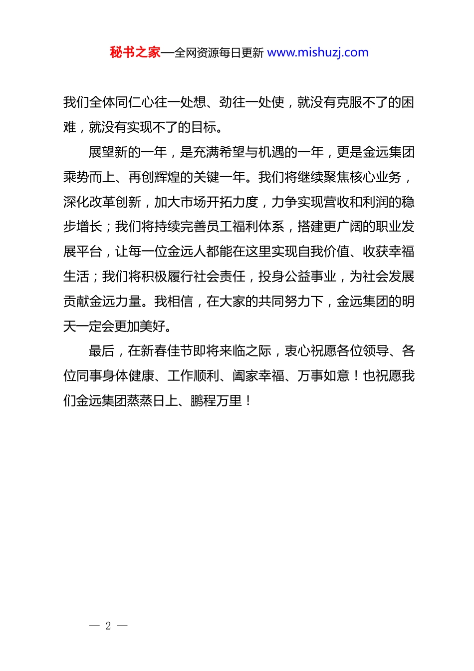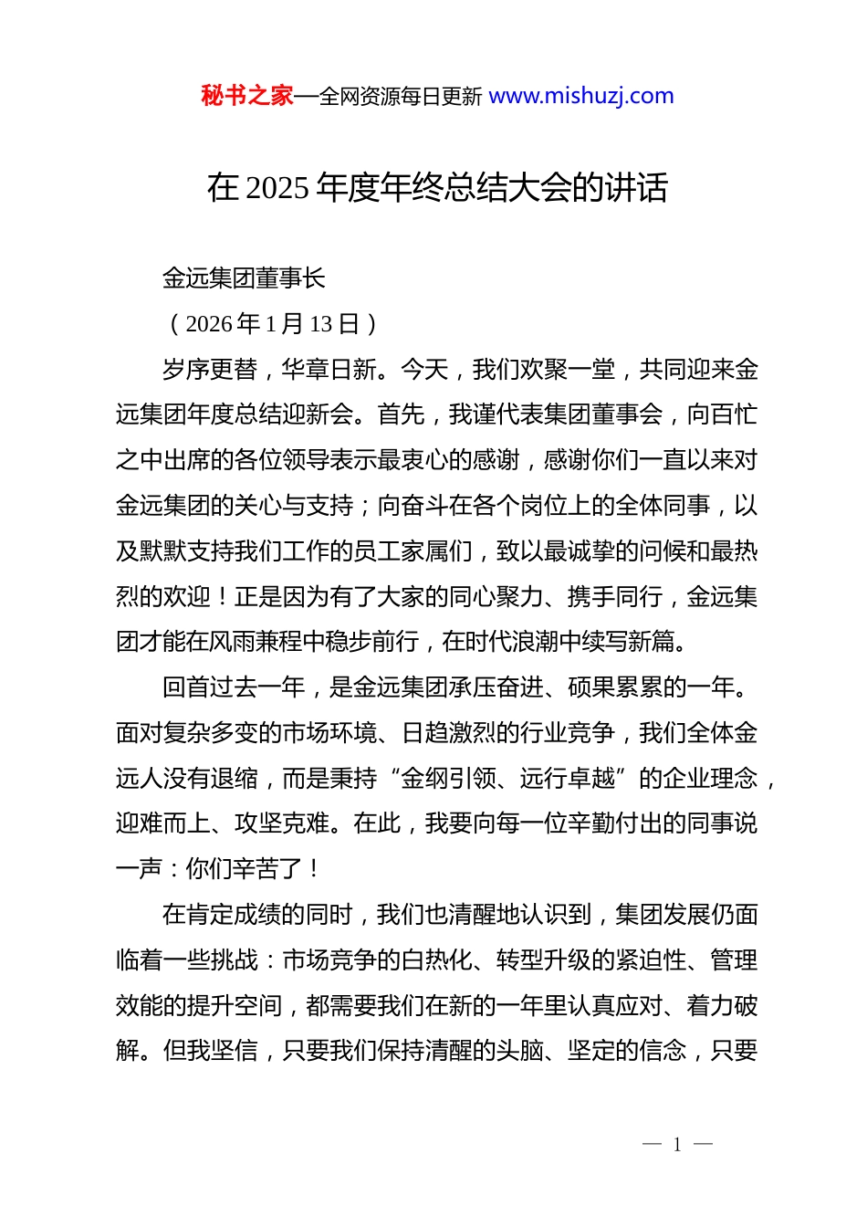 秘书之家—全网资源每日更新 www.mishuzj.com在 2025 年度年终总结大会的讲话金远集团董事长(2026 年 1 月 13 日)岁序更替,华章日新。今天,我们欢聚一堂,共同迎来金远集团年度总结迎新会。首先,我谨代表集团董事会,向百忙之中出席的各位领导表示最衷心的感谢,感谢你们一直以来对金远集团的关心与支持;向奋斗在各个岗位上的全体同事,以及默默支持我们工作的员工家属们,致以最诚挚的问候和最热烈的欢迎!正是因为有了大家的同心聚力、携手同行,金远集团才能在风雨兼程中稳步前行,在时代浪潮中续写新篇。回首过去一年,是金远集团承压奋进、硕果累累的一年。面对复杂多变的市场环境、日趋激烈的行业竞争,我们全体金远人没有退缩,而是秉持“金纲引领、远行卓越”的企业理念,迎难而上、攻坚克难。在此,我要向每一位辛勤付出的同事说一声:你们辛苦了!在肯定成绩的同时,我们也清醒地认识到,集团发展仍面临着一些挑战:市场竞争的白热化、转型升级的紧迫性、管理效能的提升空间,都需要我们在新的一年里认真应对、着力破解。但我坚信,只要我们保持清醒的头脑、坚定的信念,只要— 1 —秘书之家—全网资源每日更新 www.mishuzj.com我们全体同仁心往一处想、劲往一处使,就没有克服不了的困难,就没有实现不了的目标。展望新的一年,是充满希望与机遇的一年,更是金远集团乘势而上、再创辉煌的关键一年。我们将继续聚焦核心业务,深化改革创新,加大市场开拓力度,力争实现营收和利润的稳步增长;我们将持续完善员工福利体系,搭建更广阔的职业发展平台,让每一位金远人都能在这里实现自我价值、收获幸福生活;我们将积极履行社会责任,投身公益事业,为社会发展贡献金远力量。我相信,在大家的共同努力下,金远集团的明天一定会更加美好。最后,在新春佳节即将来临之际,衷心祝愿各位领导、各位同事身体健康、工作顺利、阖家幸福、万事如意!也祝愿我们金远集团蒸蒸日上、鹏程万里!— 2 —