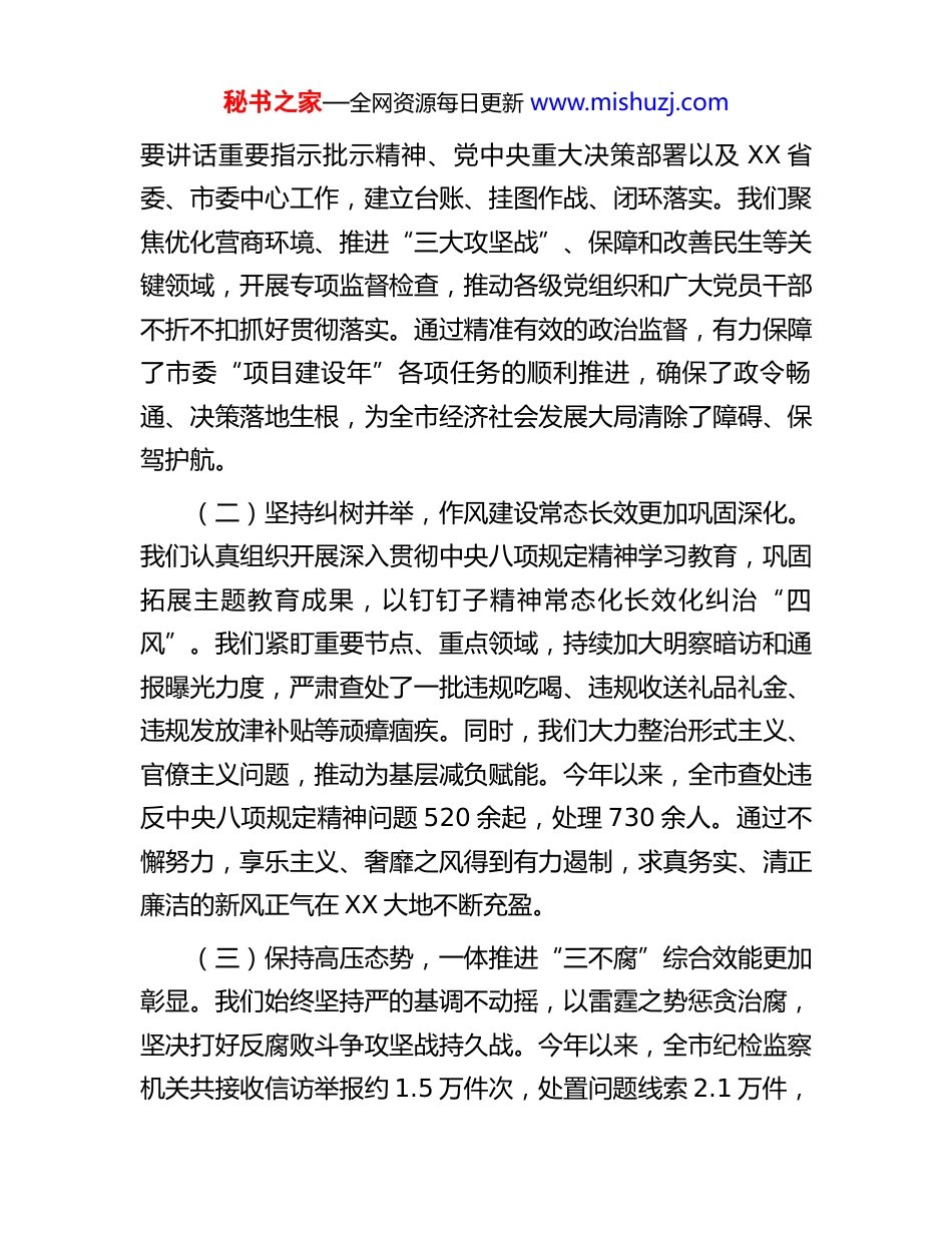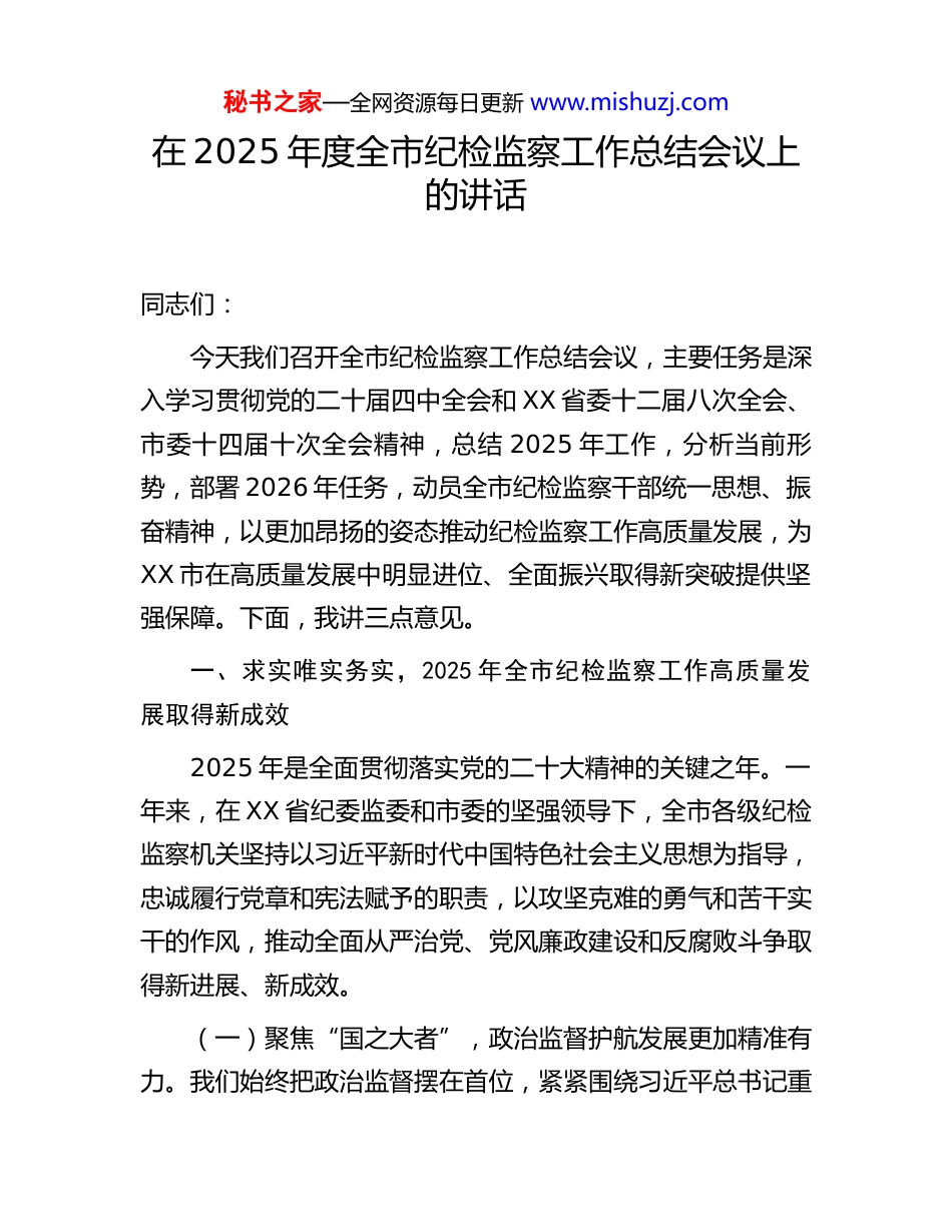 秘书之家—全网资源每日更新 www.mishuzj.com在 2025 年度全市纪检监察工作总结会议上的讲话同志们:今天我们召开全市纪检监察工作总结会议,主要任务是深入学习贯彻党的二十届四中全会和 XX 省委十二届八次全会、市委十四届十次全会精神,总结 2025 年工作,分析当前形势,部署 2026 年任务,动员全市纪检监察干部统一思想、振奋精神,以更加昂扬的姿态推动纪检监察工作高质量发展,为XX 市在高质量发展中明显进位、全面振兴取得新突破提供坚强保障。下面,我讲三点意见。一、求实唯实务实,2025 年全市纪检监察工作高质量发展取得新成效2025 年是全面贯彻落实党的二十大精神的关键之年。一年来,在 XX 省纪委监委和市委的坚强领导下,全市各级纪检监察机关坚持以习近平新时代中国特色社会主义思想为指导,忠诚履行党章和宪法赋予的职责,以攻坚克难的勇气和苦干实干的作风,推动全面从严治党、党风廉政建设和反腐败斗争取得新进展、新成效。(一)聚焦“国之大者”,政治监督护航发展更加精准有力。我们始终把政治监督摆在首位,紧紧围绕习近平总书记重秘书之家—全网资源每日更新 www.mishuzj.com要讲话重要指示批示精神、党中央重大决策部署以及 XX 省委、市委中心工作,建立台账、挂图作战、闭环落实。我们聚焦优化营商环境、推进“三大攻坚战”、保障和改善民生等关键领域,开展专项监督检查,推动各级党组织和广大党员干部不折不扣抓好贯彻落实。通过精准有效的政治监督,有力保障了市委“项目建设年”各项任务的顺利推进,确保了政令畅通、决策落地生根,为全市经济社会发展大局清除了障碍、保驾护航。(二)坚持纠树并举,作风建设常态长效更加巩固深化。我们认真组织开展深入贯彻中央八项规定精神学习教育,巩固拓展主题教育成果,以钉钉子精神常态化长效化纠治“四风”。我们紧盯重要节点、重点领域,持续加大明察暗访和通报曝光力度,严肃查处了一批违规吃喝、违规收送礼品礼金、违规发放津补贴等顽瘴痼疾。同时,我们大力整治形式主义、官僚主义问题,推动为基层减负赋能。今年以来,全市查处违反中央八项规定精神问题 520 余起,处理 730 余人。通过不懈努力,享乐主义、奢靡之风得到有力遏制,求真务实、清正廉洁的新风正气在 XX 大地不断充盈。(三)保持高压态势,一体推进“三不腐”综合效能更加彰显。我们始终坚持严的基调不动摇,以雷霆之势惩贪治腐,坚决打好反腐败斗争攻坚战持久战。今年以来,全市纪检监察机关共接收信访举报约 1.5 万件次,处置问题线索 2.1 万件,秘书之家—全网资源每日更新 www.mishuzj.com立案审查调查近 7500 件,给予党纪政务处分 7100 余人,其中涉及县处级干部 80 余人,移送司法机关近 200 人。通过办案为国家和集体挽回经济损失约 2.8 亿元。我们不仅注重查办案件的“后半篇文章”,更着力于“前半篇文章”的预防。针对金融、国企、政法、工程建设等重点领域暴露出的问题,我们深入剖析根源,制发纪检监察建议书 300 余份,推动相关单位堵塞制度漏洞、强化行业监管。通过强化不敢腐的震慑,扎牢不能腐的笼子,增强不想腐的自觉,标本兼治的综合效应持续放大。(四)站稳人民立场,整治群众身边“蝇贪蚁腐”更加深入人心。我们坚决贯彻以人民为中心的发展思想,纵深推进群众身边不正之风和腐败问题集中整治。聚焦教育医疗、养老社保、生态环保、安全生产、食品药品安全等民生领域的突出问题,我们重拳出击,严肃查处了一批群众反映强烈的“蝇贪”“蚁腐”。截至目前,全市在集中整治中立案查处相关问题3000 余件,处分 2800 余人。我们推动监督下沉、力量下沉,完善基层小微权力监督平台,让群众在家门口就能感受到公平正义。通过实实在在的整治成效,切实解决了群众的一批急难愁盼问题,人民群众的获得感、幸福感、安全感更加充实、更有保障、更可持续。(五)深化数字赋能,智慧监督助推正风反腐更加高效。我们顺应时代发展趋势,加快推进纪检监察工作信息化建设。秘书之家—全网资源每日更新 www.mishuzj.com市本级大数据中心已初步建成,整合了来自不同部门的监督数据资源,构...