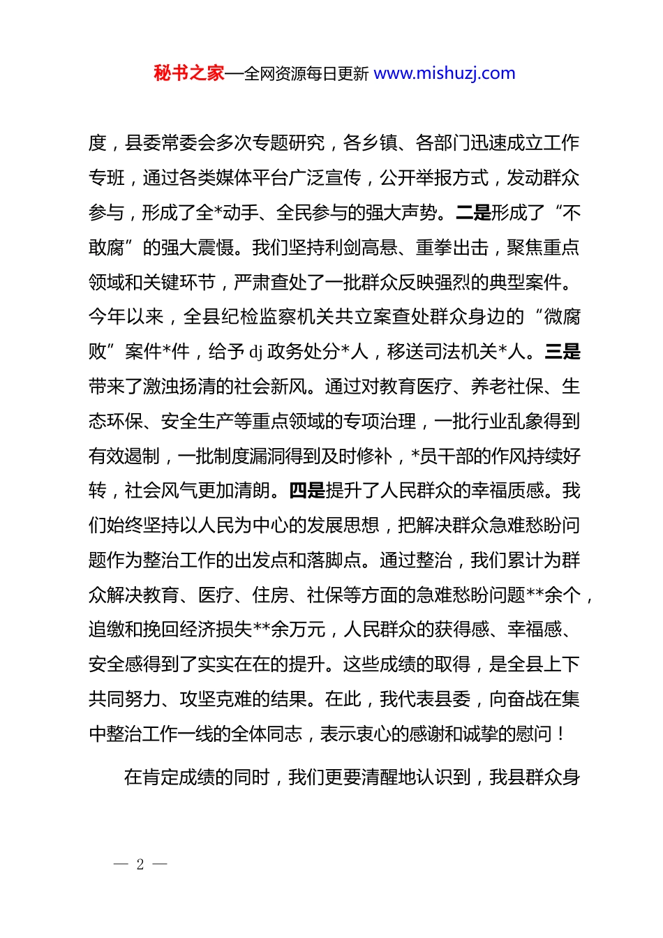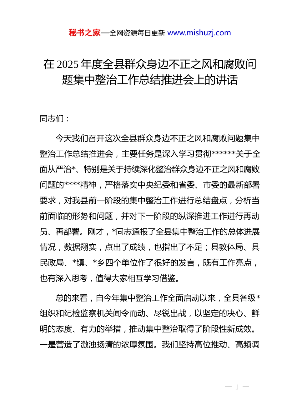 秘书之家—全网资源每日更新 www.mishuzj.com在 2025 年度全县群众身边不正之风和腐败问题集中整治工作总结推进会上的讲话同志们:今天我们召开这次全县群众身边不正之风和腐败问题集中整治工作总结推进会,主要任务是深入学习贯彻******关于全面从严治*、特别是关于持续深化整治群众身边不正之风和腐败问题的****精神,严格落实中央纪委和省委、市委的最新部署要求,对我县前一阶段的集中整治工作进行总结盘点,分析当前面临的形势和问题,并对下一阶段的纵深推进工作进行再动员、再部署。刚才,*同志通报了全县集中整治工作的总体进展情况,数据翔实,点出了成绩,也指出了不足;县教体局、县民政局、*镇、*乡四个单位作了很好的发言,既有工作亮点,也有深入思考,值得大家相互学习借鉴。总的来看,自今年集中整治工作全面启动以来,全县各级*组织和纪检监察机关闻令而动、尽锐出战,以坚定的决心、鲜明的态度、有力的举措,推动集中整治取得了阶段性新成效。一是营造了激浊扬清的浓厚氛围。我们坚持高位推动、高频调— 1 —秘书之家—全网资源每日更新 www.mishuzj.com度,县委常委会多次专题研究,各乡镇、各部门迅速成立工作专班,通过各类媒体平台广泛宣传,公开举报方式,发动群众参与,形成了全*动手、全民参与的强大声势。二是形成了“不敢腐”的强大震慑。我们坚持利剑高悬、重拳出击,聚焦重点领域和关键环节,严肃查处了一批群众反映强烈的典型案件。今年以来,全县纪检监察机关共立案查处群众身边的“微腐败”案件*件,给予 dj 政务处分*人,移送司法机关*人。三是带来了激浊扬清的社会新风。通过对教育医疗、养老社保、生态环保、安全生产等重点领域的专项治理,一批行业乱象得到有效遏制,一批制度漏洞得到及时修补,*员干部的作风持续好转,社会风气更加清朗。四是提升了人民群众的幸福质感。我们始终坚持以人民为中心的发展思想,把解决群众急难愁盼问题作为整治工作的出发点和落脚点。通过整治,我们累计为群众解决教育、医疗、住房、社保等方面的急难愁盼问题**余个,追缴和挽回经济损失**余万元,人民群众的获得感、幸福感、安全感得到了实实在在的提升。这些成绩的取得,是全县上下共同努力、攻坚克难的结果。在此,我代表县委,向奋战在集中整治工作一线的全体同志,表示衷心的感谢和诚挚的慰问!在肯定成绩的同时,我们更要清醒地认识到,我县群众身— 2 —秘书之家—全网资源每日更新 www.mishuzj.com边不正之风和腐败问题的形势依然严峻复杂,集中整治工作依然任重道远。一些深层次、顽固性的问题还没有从根本上解决。有的领域腐败存量尚未清底,增量仍在发生;有的地方和单位对整治工作的重要性认识不足,存在“上热下冷”、压力传导层层递减的现象;有的案件查办“后半篇文章”做得不深不实,“查改治”一体推进的效果不够理想;一些隐形变异的“四风”问题和新型腐败手段花样翻新,发现和查处的难度在加大。这些问题警示我们,全面从严治*永远在路上,反腐败斗争是一场输不起也决不能输的重大政治斗争。全县上下必须深刻认识深化集中整治的极端重要性和现实紧迫性,切实增强责任感和使命感,以更大的决心、更强的力度、更实的举措,将这场正风肃纪反腐的攻坚战、持久战、总体战进行到底。下面,我讲三点意见。一、提高政治站位,深化思想认识,切实增强纵深推进集中整治的政治自觉和行动自觉整治群众身边的不正之风和腐败问题,是******和*中央念兹在兹、反复强调的“国之大者”。*的十八大以来,******在一系列重要讲话、****中,都旗帜鲜明地表达了对整治“微腐败”的高度重视,强调“相对于‘远在天边’的‘老虎’,群— 3 —秘书之家—全网资源每日更新 www.mishuzj.com众对‘近在眼前’嗡嗡乱飞的‘苍蝇’感受更真切”,“要坚持‘老虎’、‘苍蝇’一起打”。这充分彰明了我们*以人民为中心的根本立场和坚定不移推进全面从严治*的顽强意志。(一)深化集中整治是践行“两个维护”的重大政治任务群众利益无小事,一枝一叶总关情。群众身边的不正之风和腐败问题,看似小事,但直接侵害的是群众的切身利益,啃食的是群众的获得感,挥...
