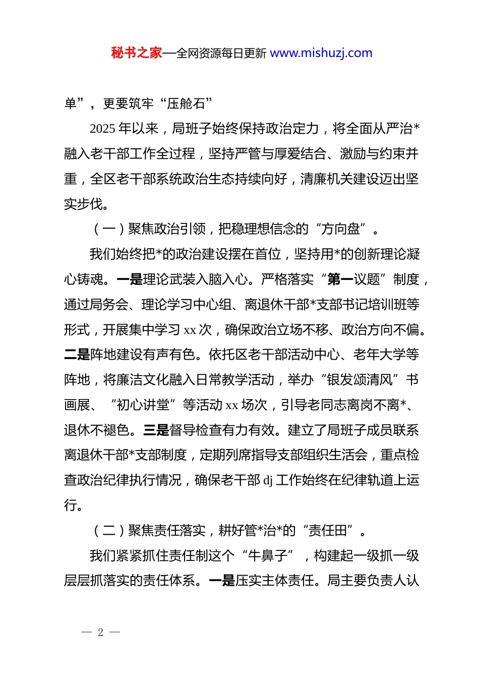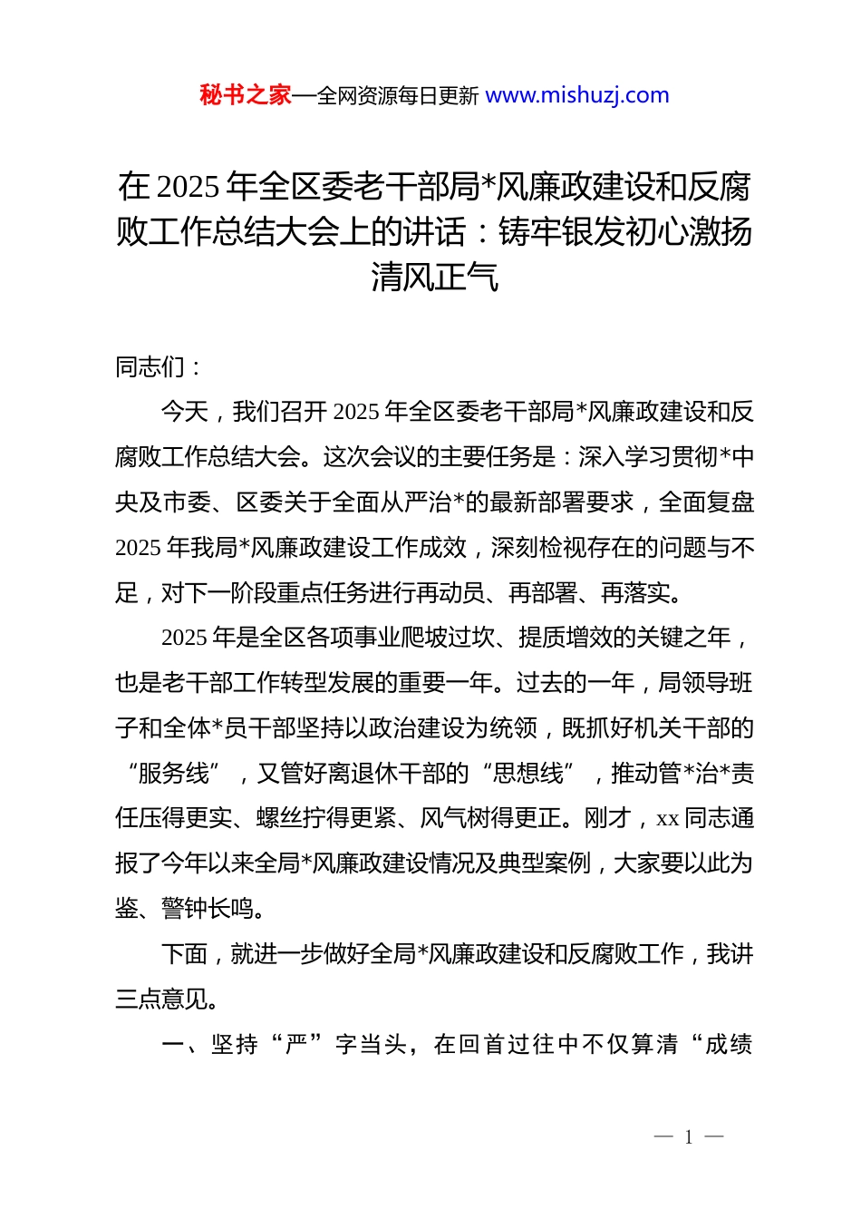 秘书之家—全网资源每日更新 www.mishuzj.com在 2025 年全区委老干部局*风廉政建设和反腐败工作总结大会上的讲话:铸牢银发初心激扬清风正气同志们:今天,我们召开 2025 年全区委老干部局*风廉政建设和反腐败工作总结大会。这次会议的主要任务是:深入学习贯彻*中央及市委、区委关于全面从严治*的最新部署要求,全面复盘2025 年我局*风廉政建设工作成效,深刻检视存在的问题与不足,对下一阶段重点任务进行再动员、再部署、再落实。2025 年是全区各项事业爬坡过坎、提质增效的关键之年,也是老干部工作转型发展的重要一年。过去的一年,局领导班子和全体*员干部坚持以政治建设为统领,既抓好机关干部的“服务线”,又管好离退休干部的“思想线”,推动管*治*责任压得更实、螺丝拧得更紧、风气树得更正。刚才,xx 同志通报了今年以来全局*风廉政建设情况及典型案例,大家要以此为鉴、警钟长鸣。下面,就进一步做好全局*风廉政建设和反腐败工作,我讲三点意见。一、坚持“严”字当头,在回首过往中不仅算清“成绩— 1 —秘书之家—全网资源每日更新 www.mishuzj.com单”,更要筑牢“压舱石”2025 年以来,局班子始终保持政治定力,将全面从严治*融入老干部工作全过程,坚持严管与厚爱结合、激励与约束并重,全区老干部系统政治生态持续向好,清廉机关建设迈出坚实步伐。(一)聚焦政治引领,把稳理想信念的“方向盘”。我们始终把*的政治建设摆在首位,坚持用*的创新理论凝心铸魂。一是理论武装入脑入心。严格落实“第一议题”制度,通过局务会、理论学习中心组、离退休干部*支部书记培训班等形式,开展集中学习 xx 次,确保政治立场不移、政治方向不偏。二是阵地建设有声有色。依托区老干部活动中心、老年大学等阵地,将廉洁文化融入日常教学活动,举办“银发颂清风”书画展、“初心讲堂”等活动 xx 场次,引导老同志离岗不离*、退休不褪色。三是督导检查有力有效。建立了局班子成员联系离退休干部*支部制度,定期列席指导支部组织生活会,重点检查政治纪律执行情况,确保老干部 dj 工作始终在纪律轨道上运行。(二)聚焦责任落实,耕好管*治*的“责任田”。我们紧紧抓住责任制这个“牛鼻子”,构建起一级抓一级层层抓落实的责任体系。一是压实主体责任。局主要负责人认— 2 —秘书之家—全网资源每日更新 www.mishuzj.com真履行第一责任人职责,做到重要工作亲自部署、重大问题亲自过问、重点环节亲自协调;班子成员严格落实“一岗双责”,定期与分管科室负责人开展廉政谈话,全年累计谈话 xx 人次。二是强化监督责任。主动接受派驻纪检监察组监督,全力配合开展专项检查,对反馈的 xx 个问题照单全收、立行立改,修订完善了《财务管理制度》《物资采购管理办法》等内控制度 xx项。三是延伸责任链条。将*风廉政建设纳入年度目标考核体系,与各科室、下属单位签订目标责任书,实行“一票否决”制,切实把压力传导到神经末梢。(三)聚焦作风建设,擦亮精准服务的“金名片”。我们坚持以优良作风提升服务效能,把廉洁自律体现在为老服务的点滴之中。一是纠治“四风”顽疾。深入开展形式主义、官僚主义专项整治,精简会议文件,规范督查检查,切实减轻基层负担;重点整治在落实老干部待遇中慢作为、不作为等问题,确保各项政策落地见效。二是优化服务流程。推行“适老化”办事流程,设立“*员先锋岗”,开展“上门办、预约办、代帮办”服务,全年解决老同志急难愁盼问题 xx 件,满意度持续提升。三是筑牢廉洁防线。紧盯节假日等重要节点,发送廉政短信,通报典型案例,开展警示教育,引导*员干部知敬畏、存戒惧、守底线,营造了风清气正的节日氛围。— 3 —秘书之家—全网资源每日更新 www.mishuzj.com二、坚持“实”字托底,在检视剖析中不仅找准“薄弱点”,更要敢碰“硬骨头”在肯定成绩的同时,我们必须保持清醒头脑,正视存在的问题。对照高标准严要求,对照老同志的新期待,我局在*风廉政建设方面还存在一些不容忽视的短板和弱项,必须引起高度重视。(一)思想认识存在“温差”,教育管理尚有“盲区”。部分*员干部对全面从严治*的长期性、艰...