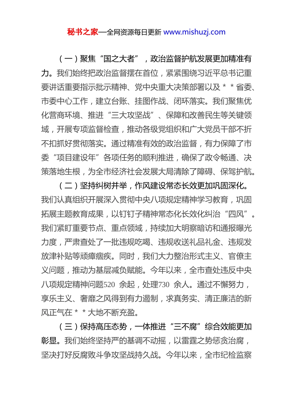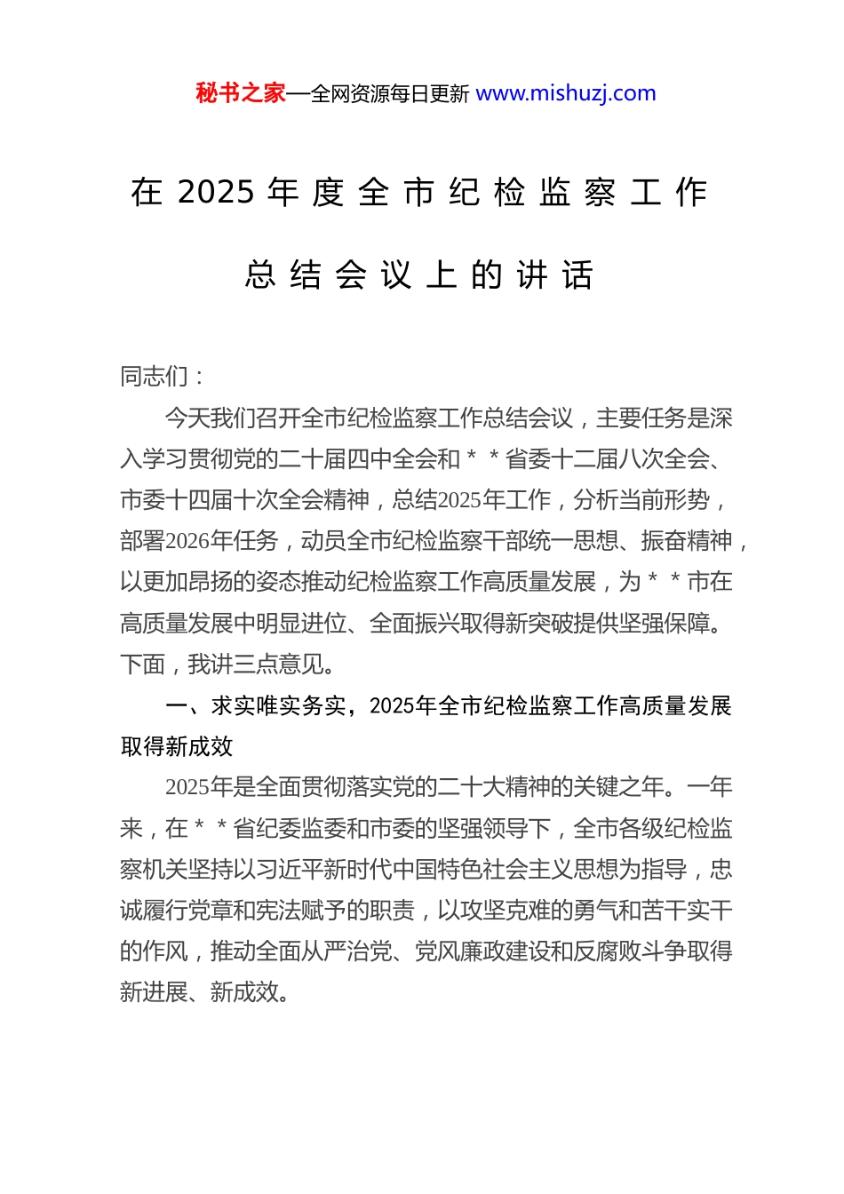 秘书之家—全网资源每日更新 www.mishuzj.com在 2025 年 度 全 市 纪 检 监 察 工 作总 结 会 议 上 的 讲 话同志们:今天我们召开全市纪检监察工作总结会议,主要任务是深入学习贯彻党的二十届四中全会和**省委十二届八次全会、市委十四届十次全会精神,总结2025年工作,分析当前形势,部署2026年任务,动员全市纪检监察干部统一思想、振奋精神,以更加昂扬的姿态推动纪检监察工作高质量发展,为**市在高质量发展中明显进位、全面振兴取得新突破提供坚强保障。下面,我讲三点意见。一、求实唯实务实,2025年全市纪检监察工作高质量发展取得新成效2025年是全面贯彻落实党的二十大精神的关键之年。一年来,在**省纪委监委和市委的坚强领导下,全市各级纪检监察机关坚持以习近平新时代中国特色社会主义思想为指导,忠诚履行党章和宪法赋予的职责,以攻坚克难的勇气和苦干实干的作风,推动全面从严治党、党风廉政建设和反腐败斗争取得新进展、新成效。秘书之家—全网资源每日更新 www.mishuzj.com(一)聚焦“国之大者”,政治监督护航发展更加精准有力。我们始终把政治监督摆在首位,紧紧围绕习近平总书记重要讲话重要指示批示精神、党中央重大决策部署以及**省委、市委中心工作,建立台账、挂图作战、闭环落实。我们聚焦优化营商环境、推进“三大攻坚战”、保障和改善民生等关键领域,开展专项监督检查,推动各级党组织和广大党员干部不折不扣抓好贯彻落实。通过精准有效的政治监督,有力保障了市委“项目建设年”各项任务的顺利推进,确保了政令畅通、决策落地生根,为全市经济社会发展大局清除了障碍、保驾护航。(二)坚持纠树并举,作风建设常态长效更加巩固深化。我们认真组织开展深入贯彻中央八项规定精神学习教育,巩固拓展主题教育成果,以钉钉子精神常态化长效化纠治“四风”。我们紧盯重要节点、重点领域,持续加大明察暗访和通报曝光力度,严肃查处了一批违规吃喝、违规收送礼品礼金、违规发放津补贴等顽瘴痼疾。同时,我们大力整治形式主义、官僚主义问题,推动为基层减负赋能。今年以来,全市查处违反中央八项规定精神问题520 余起,处理730 余人。通过不懈努力,享乐主义、奢靡之风得到有力遏制,求真务实、清正廉洁的新风正气在**大地不断充盈。(三)保持高压态势,一体推进“三不腐”综合效能更加彰显。我们始终坚持严的基调不动摇,以雷霆之势惩贪治腐,坚决打好反腐败斗争攻坚战持久战。今年以来,全市纪检监察秘书之家—全网资源每日更新 www.mishuzj.com机关共接收信访举报约1.5 万件次,处置问题线索2.1 万件,立案审查调查近7500件,给予党纪政务处分7100余人,其中涉及县处级干部80余人,移送司法机关近200 人。通过办案为国家和集体挽回经济损失约2.8 亿元。我们不仅注重查办案件的“后半篇文章”,更着力于“前半篇文章”的预防。针对金融、国企、政法、工程建设等重点领域暴露出的问题,我们深入剖析根源,制发纪检监察建议书300 余份,推动相关单位堵塞制度漏洞、强化行业监管。通过强化不敢腐的震慑,扎牢不能腐的笼子,增强不想腐的自觉,标本兼治的综合效应持续放大。(四)站稳人民立场,整治群众身边“蝇贪蚁腐”更加深入人心。我们坚决贯彻以人民为中心的发展思想,纵深推进群众身边不正之风和腐败问题集中整治。聚焦教育医疗、养老社保、生态环保、安全生产、食品药品安全等民生领域的突出问题,我们重拳出击,严肃查处了一批群众反映强烈的“蝇贪”“蚁腐”。截至目前,全市在集中整治中立案查处相关问题3000余件,处分2800余人。我们推动监督下沉、力量下沉,完善基层小微权力监督平台,让群众在家门口就能感受到公平正义。通过实实在在的整治成效,切实解决了群众的一批急难愁盼问题,人民群众的获得感、幸福感、安全感更加充实、更有保障、更可持续。(五)深化数字赋能,智慧监督助推正风反腐更加高效。我们顺应时代发展趋势,加快推进纪检监察工作信息化建设。秘书之家—全网资源每日更新 www.mishuzj.com市本级大数据中心已初步建成,整合了来自不同部门的监督数据资源,构建了多个监督模型,实...