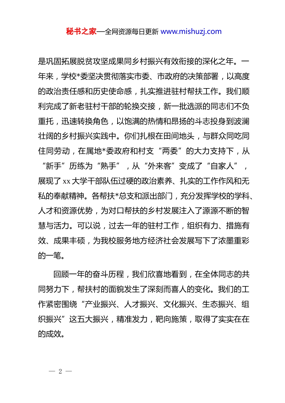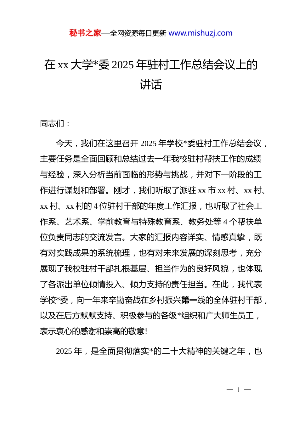 秘书之家—全网资源每日更新 www.mishuzj.com在 xx 大学*委 2025 年驻村工作总结会议上的讲话同志们:今天,我们在这里召开 2025 年学校*委驻村工作总结会议,主要任务是全面回顾和总结过去一年我校驻村帮扶工作的成绩与经验,深入分析当前面临的形势与挑战,并对下一阶段的工作进行谋划和部署。刚才,我们听取了派驻 xx 市 xx 村、xx 村、xx 村、xx 村的 4 位驻村干部的年度工作汇报,也听取了社会工作系、艺术系、学前教育与特殊教育系、教务处等 4 个帮扶单位负责同志的交流发言。大家的汇报内容详实、情感真挚,既有对实践成果的系统梳理,也有对未来发展的深刻思考,充分展现了我校驻村干部扎根基层、担当作为的良好风貌,也体现了各派出单位倾情投入、倾力支持的责任担当。在此,我代表学校*委,向一年来辛勤奋战在乡村振兴第一线的全体驻村干部,以及在后方默默支持、积极参与的各级*组织和广大师生员工,表示衷心的感谢和崇高的敬意!2025 年,是全面贯彻落实*的二十大精神的关键之年,也— 1 —秘书之家—全网资源每日更新 www.mishuzj.com是巩固拓展脱贫攻坚成果同乡村振兴有效衔接的深化之年。一年来,学校*委坚决贯彻落实市委、市政府的决策部署,以高度的政治责任感和历史使命感,扎实推进驻村帮扶工作。我们顺利完成了新老驻村干部的轮换交接,新一批选派的同志们不负重托,迅速转换角色,以饱满的热情和昂扬的斗志投身到波澜壮阔的乡村振兴实践中。你们扎根在田间地头,与群众同吃同住同劳动,在属地*委政府和村支“两委”的大力支持下,从“新手”历练为“熟手”,从“外来客”变成了“自家人”,展现了 xx 大学干部队伍过硬的政治素养、扎实的工作作风和无私的奉献精神。各帮扶*总支和派出部门,充分发挥学校的学科、人才和资源优势,为对口帮扶的乡村发展注入了源源不断的智慧与活力。可以说,过去一年的驻村工作,组织有力、措施有效、成果丰硕,为我校服务地方经济社会发展写下了浓墨重彩的一笔。回顾一年的奋斗历程,我们欣喜地看到,在全体同志的共同努力下,帮扶村的面貌发生了深刻而喜人的变化。我们的工作紧密围绕“产业振兴、人才振兴、文化振兴、生态振兴、组织振兴”这五大振兴,精准发力,靶向施策,取得了实实在在的成效。— 2 —秘书之家—全网资源每日更新 www.mishuzj.com第一,我们坚持 dj 引领,筑牢了乡村振兴的“战斗堡垒”,组织振兴根基更加坚实。基层*组织是*在农村全部工作和战斗力的基础。我们始终将建强村*组织作为驻村帮扶的首要任务。一年来,驻村工作队协助村“两委”严格落实“三会一课”制度,累计组织开展各类主题*日和*内政治生活达 xx 余次,让*的组织生活真正严起来、实起来。同志们化身“dj 指导员”,手把手地指导村级*务工作,规范发展*员流程,全年共悉心培养入*积极分子 xx 余名,新发展*员 xx 名,为村*组织注入了新鲜血液。同时,我们还依托学校马克思主义学院的理论优势,组织专家学者为村组干部和*员群众上*课、作宣讲超过 20 场次,覆盖*员干部 xx 余人次,有效提升了基层*员队伍的政治理论素养和履职能力。通过一系列扎实举措,帮扶村*组织的政治功能和组织功能显著增强,凝聚力、号召力和战斗力实现了质的飞跃,真正成为了带领群众奔向美好生活的坚强核心。第二,我们聚焦特色优势,激活了乡村发展的“内生动力”,产业振兴势头更加强劲。产业兴旺是解决农村一切问题的前提。我们的驻村干部和专业教师团队,深入调研各村资源禀赋,杜绝“一刀切”,因— 3 —秘书之家—全网资源每日更新 www.mishuzj.com村施策,为每个村量身打造产业发展规划。在 xx 村,那里有独特的生态旅游资源,但缺乏规划和创意。我校艺术系的师生们进驻后,将课堂搬到田野,协助该村进行整体视觉形象设计,打造了“旅居生活”网红打卡点,并与知名旅游平台成功签约,有效提升了该村民宿产业的品牌影响力和市场竞争力。在 xx 村,该村毗邻水源保护地,生态优势突出。我们的专家团队便指导村民发展林下养鸡、高山茶种植等生态循环农业,成功打造了“生态茶、放心鸡”等农产品品牌,并通过“校...