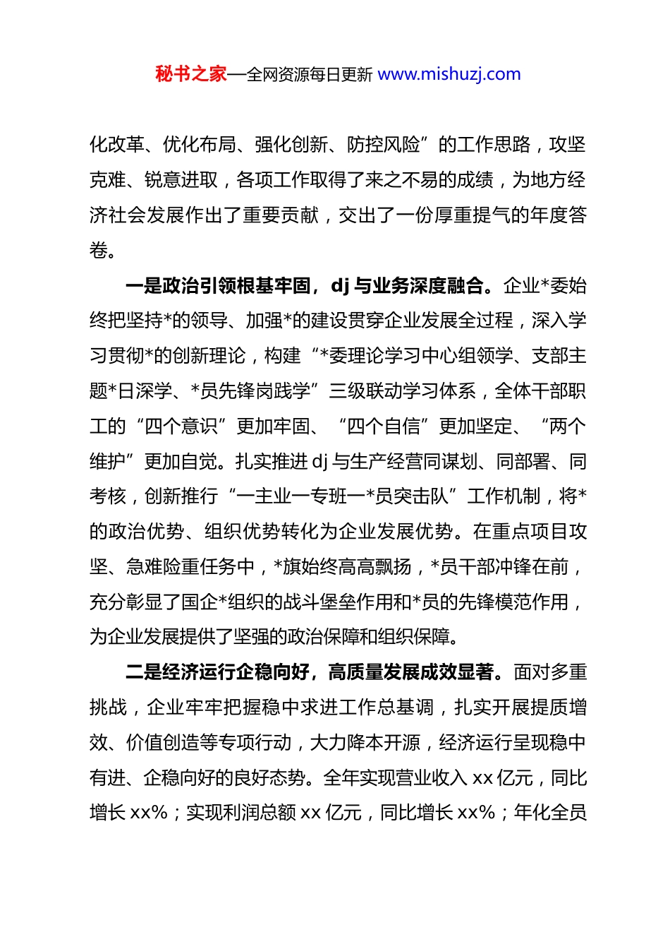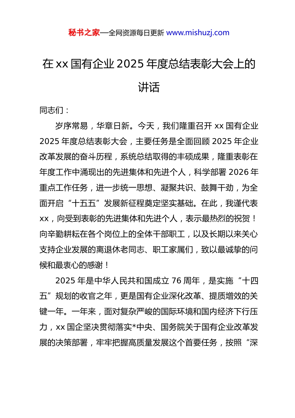 秘书之家—全网资源每日更新 www.mishuzj.com在 xx 国有企业 2025 年度总结表彰大会上的讲话同志们:岁序常易,华章日新。今天,我们隆重召开 xx 国有企业2025 年度总结表彰大会,主要任务是全面回顾 2025 年企业改革发展的奋斗历程,系统总结取得的丰硕成果,隆重表彰在年度工作中涌现出的先进集体和先进个人,科学部署 2026 年重点工作任务,进一步统一思想、凝聚共识、鼓舞干劲,为全面开启“十五五”发展新征程奠定坚实基础。在此,我谨代表xx,向受到表彰的先进集体和先进个人,表示最热烈的祝贺!向辛勤耕耘在各个岗位上的全体干部职工,以及长期以来关心支持企业发展的离退休老同志、职工家属们,致以最诚挚的问候和最衷心的感谢!2025 年是中华人民共和国成立 76 周年,是实施“十四五”规划的收官之年,更是国有企业深化改革、提质增效的关键一年。一年来,面对复杂严峻的国际环境和国内经济下行压力,xx 国企坚决贯彻落实*中央、国务院关于国有企业改革发展的决策部署,牢牢把握高质量发展这个首要任务,按照“深秘书之家—全网资源每日更新 www.mishuzj.com化改革、优化布局、强化创新、防控风险”的工作思路,攻坚克难、锐意进取,各项工作取得了来之不易的成绩,为地方经济社会发展作出了重要贡献,交出了一份厚重提气的年度答卷。一是政治引领根基牢固,dj 与业务深度融合。企业*委始终把坚持*的领导、加强*的建设贯穿企业发展全过程,深入学习贯彻*的创新理论,构建“*委理论学习中心组领学、支部主题*日深学、*员先锋岗践学”三级联动学习体系,全体干部职工的“四个意识”更加牢固、“四个自信”更加坚定、“两个维护”更加自觉。扎实推进 dj 与生产经营同谋划、同部署、同考核,创新推行“一主业一专班一*员突击队”工作机制,将*的政治优势、组织优势转化为企业发展优势。在重点项目攻坚、急难险重任务中,*旗始终高高飘扬,*员干部冲锋在前,充分彰显了国企*组织的战斗堡垒作用和*员的先锋模范作用,为企业发展提供了坚强的政治保障和组织保障。二是经济运行企稳向好,高质量发展成效显著。面对多重挑战,企业牢牢把握稳中求进工作总基调,扎实开展提质增效、价值创造等专项行动,大力降本开源,经济运行呈现稳中有进、企稳向好的良好态势。全年实现营业收入 xx 亿元,同比增长 xx%;实现利润总额 xx 亿元,同比增长 xx%;年化全员秘书之家—全网资源每日更新 www.mishuzj.com劳动生产率达到 xx 万元/人,同比提升 xx%,主要经营指标均超额完成年度目标。在资产运营方面,成功获评 aaa 主体信用评级,资产总额增长至 xx 亿元,资产结构持续优化,发展基础更加坚实。这些成绩的取得,充分彰显了国企的责任担当和过硬实力,为稳定区域经济大盘作出了积极贡献。三是创新驱动强劲有力,新质生产力加快培育。企业始终把创新作为引领发展的第一动力,以更大力度强化自主创新,研发投入同比增长 xx%,研发投入强度达到 xx%,远超行业平均水平。积极参与国家创新体系建设,依托国家级研发平台,在 xx 领域取得关键技术突破,成功推出 xx 项自主创新产品,其中 xx 产品性能领先行业 xx%,获得市场广泛认可。深化“ai+”专项行动,聚焦能源、制造等重点领域打造多个智能应用场景,推动数字化转型取得阶段性成效,业务流程线上化率达 xx%,管理效率显著提升。积极组建创新联合体,吸纳多家创新主体参与攻关,形成产学研用深度融合的创新格局,为企业高质量发展注入了强劲动能。四是布局优化持续深化,服务大局成效凸显。企业紧紧围绕国家战略和地方发展规划,持续优化国有经济布局,在重大基础设施建设、民生保障、乡村振兴等领域主动担当、积极作为。在城市更新方面,全力推进 xx 片区改造项目,完成老旧建秘书之家—全网资源每日更新 www.mishuzj.com筑拆除 xx 万平方米,改造老旧小区 xx 万平方米,惠及群众 xx万户,成功引入多个优质商业品牌,提升了城市品质和居民生活幸福感。在乡村振兴方面,创新片区开发模式,推进 xx 乡村振兴项目建设,打造特色民宿、智慧农场等新业态,带动当地农民增收致富,助力巩固...
