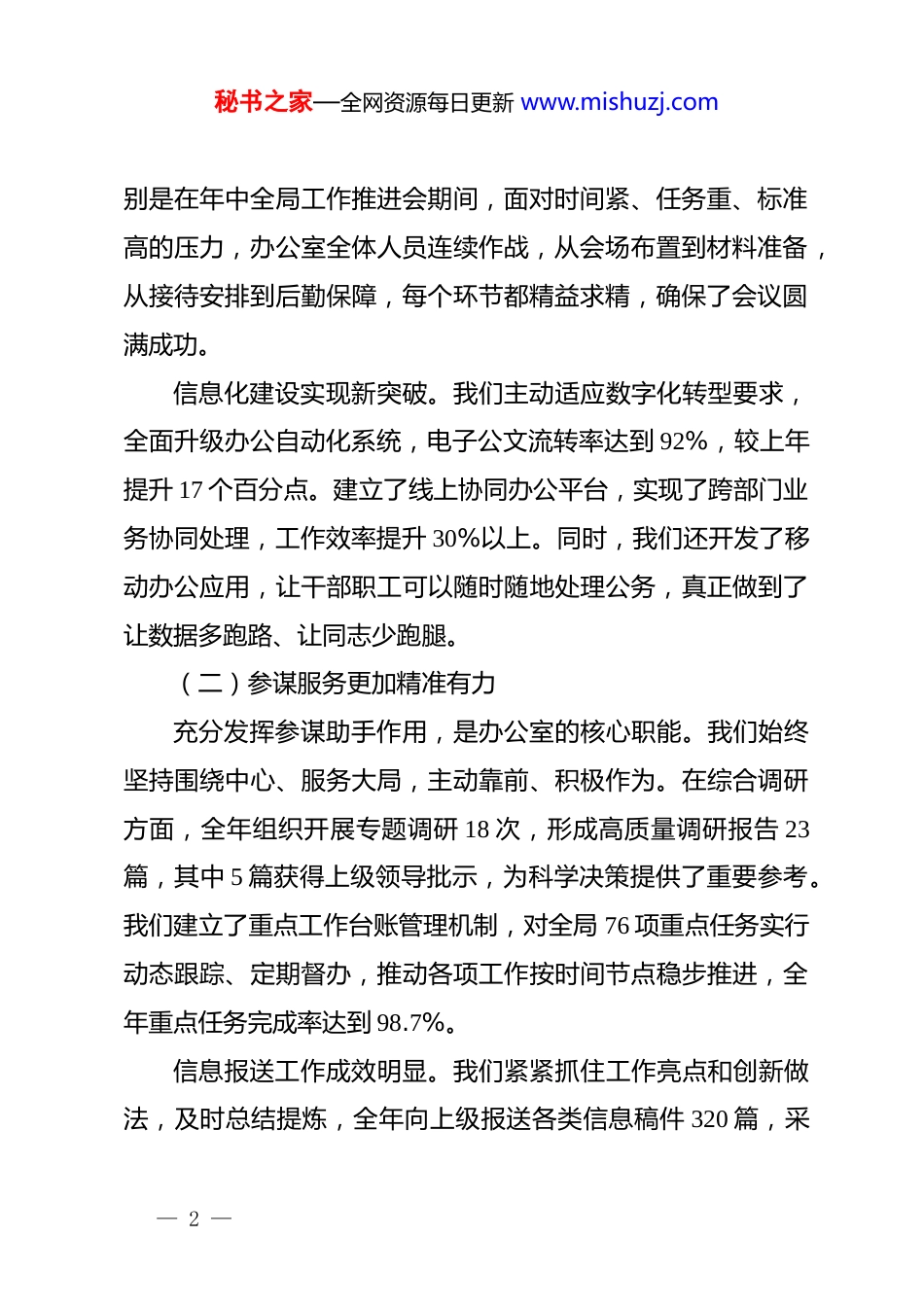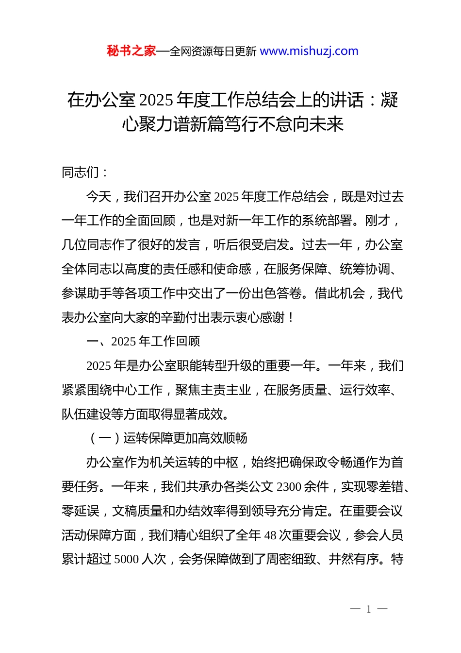 秘书之家—全网资源每日更新 www.mishuzj.com在办公室 2025 年度工作总结会上的讲话:凝心聚力谱新篇笃行不怠向未来同志们:今天,我们召开办公室 2025 年度工作总结会,既是对过去一年工作的全面回顾,也是对新一年工作的系统部署。刚才,几位同志作了很好的发言,听后很受启发。过去一年,办公室全体同志以高度的责任感和使命感,在服务保障、统筹协调、参谋助手等各项工作中交出了一份出色答卷。借此机会,我代表办公室向大家的辛勤付出表示衷心感谢!一、2025 年工作回顾2025 年是办公室职能转型升级的重要一年。一年来,我们紧紧围绕中心工作,聚焦主责主业,在服务质量、运行效率、队伍建设等方面取得显著成效。(一)运转保障更加高效顺畅办公室作为机关运转的中枢,始终把确保政令畅通作为首要任务。一年来,我们共承办各类公文 2300 余件,实现零差错、零延误,文稿质量和办结效率得到领导充分肯定。在重要会议活动保障方面,我们精心组织了全年 48 次重要会议,参会人员累计超过 5000 人次,会务保障做到了周密细致、井然有序。特— 1 —秘书之家—全网资源每日更新 www.mishuzj.com别是在年中全局工作推进会期间,面对时间紧、任务重、标准高的压力,办公室全体人员连续作战,从会场布置到材料准备,从接待安排到后勤保障,每个环节都精益求精,确保了会议圆满成功。信息化建设实现新突破。我们主动适应数字化转型要求,全面升级办公自动化系统,电子公文流转率达到 92%,较上年提升 17 个百分点。建立了线上协同办公平台,实现了跨部门业务协同处理,工作效率提升 30%以上。同时,我们还开发了移动办公应用,让干部职工可以随时随地处理公务,真正做到了让数据多跑路、让同志少跑腿。(二)参谋服务更加精准有力充分发挥参谋助手作用,是办公室的核心职能。我们始终坚持围绕中心、服务大局,主动靠前、积极作为。在综合调研方面,全年组织开展专题调研 18 次,形成高质量调研报告 23篇,其中 5 篇获得上级领导批示,为科学决策提供了重要参考。我们建立了重点工作台账管理机制,对全局 76 项重点任务实行动态跟踪、定期督办,推动各项工作按时间节点稳步推进,全年重点任务完成率达到 98.7%。信息报送工作成效明显。我们紧紧抓住工作亮点和创新做法,及时总结提炼,全年向上级报送各类信息稿件 320 篇,采— 2 —秘书之家—全网资源每日更新 www.mishuzj.com用率达到 65%,较上年提高 12 个百分点。特别是在重大活动、重要工作推进过程中,我们做到了第一时间跟进、第一时间报送,多篇信息被上级刊物采用,有效提升了单位影响力和美誉度。(三)制度建设更加科学规范制度是管根本、管长远的。我们坚持把制度建设作为提升办公室工作规范化水平的重要抓手。全年修订完善各类规章制度 27 项,新建制度 8 项,基本形成了覆盖公文处理、会议管理、督查督办、后勤保障等各方面的制度体系。在公文处理方面,我们严格执行收发登记、审核把关、归档管理等程序,确保每一份公文都有据可查、有迹可循。建立了公文质量定期评估机制,通过量化打分、排名通报等方式,倒逼各部门提升公文质量。档案管理实现规范化。我们按照档案管理标准要求,完成了近五年档案的系统整理,共整理归档文件资料 8600 余卷,电子档案扫描录入率达到 100%。建立了档案利用服务机制,全年提供档案查阅服务 230 余次,为各项工作开展提供了有力支撑。同时,我们还加强了档案安全管理,配备了专业的档案存储设备,确保档案资料安全完整。(四)队伍素质更加过硬扎实— 3 —秘书之家—全网资源每日更新 www.mishuzj.com办公室工作千头万绪,对干部综合素质要求很高。我们始终把队伍建设作为基础工程来抓,通过多种形式提升队伍整体素质。全年组织各类业务培训 16 次,参训人员达到 180 人次,培训内容涵盖公文写作、会务组织、信息技术应用等多个方面。我们还选派 8 名同志参加上级组织的专题培训班,开阔了视野,增长了才干。实践锻炼成效显著。我们坚持在实战中锻炼队伍,在重要任务面前让年轻同志挑大梁、担重担。全年有 12 名年轻同志独立承担...