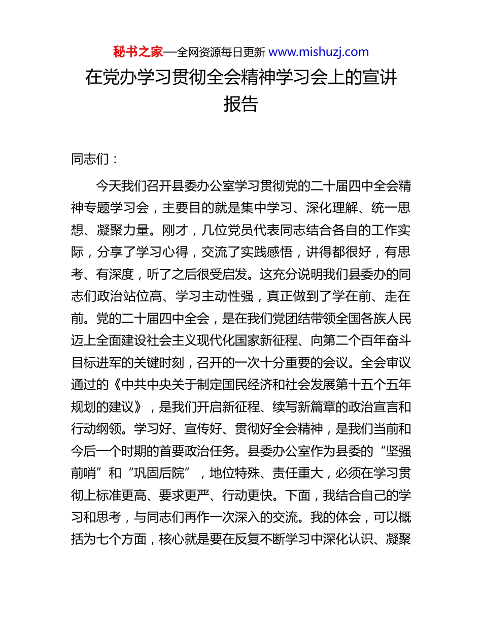 秘书之家—全网资源每日更新 www.mishuzj.com在党办学习贯彻全会精神学习会上的宣讲报告同志们:今天我们召开县委办公室学习贯彻党的二十届四中全会精神专题学习会,主要目的就是集中学习、深化理解、统一思想、凝聚力量。刚才,几位党员代表同志结合各自的工作实际,分享了学习心得,交流了实践感悟,讲得都很好,有思考、有深度,听了之后很受启发。这充分说明我们县委办的同志们政治站位高、学习主动性强,真正做到了学在前、走在前。党的二十届四中全会,是在我们党团结带领全国各族人民迈上全面建设社会主义现代化国家新征程、向第二个百年奋斗目标进军的关键时刻,召开的一次十分重要的会议。全会审议通过的《中共中央关于制定国民经济和社会发展第十五个五年规划的建议》,是我们开启新征程、续写新篇章的政治宣言和行动纲领。学习好、宣传好、贯彻好全会精神,是我们当前和今后一个时期的首要政治任务。县委办公室作为县委的“坚强前哨”和“巩固后院”,地位特殊、责任重大,必须在学习贯彻上标准更高、要求更严、行动更快。下面,我结合自己的学习和思考,与同志们再作一次深入的交流。我的体会,可以概括为七个方面,核心就是要在反复不断学习中深化认识、凝聚秘书之家—全网资源每日更新 www.mishuzj.com力量,在服务全县经济社会高质量发展中展现新担当、彰显新作为。第一,我们要在反复不断学习中跟核心、靠主心,筑牢绝对忠诚的政治品格。党的十八大以来,我们党和国家事业取得历史性成就、发生历史性变革,最根本的原因在于有习近平总书记作为党中央的核心、全党的核心掌舵领航,在于有习近平新时代中国特色社会主义思想科学指引。党的二十届四中全会取得的一系列重大成果,再一次雄辩地证明了“两个确立”的决定性意义。同志们,我们身在党边,离县委最近,对党中央的决策部署领会要最快、最深、最透。学习全会精神,首要的就是学出政治忠诚。我们要从内心深处深刻领悟“两个确立”的决定性意义,不断增强“四个意识”、坚定“四个自信”、做到“两个维护”。这绝不是一句空洞的口号,而是要体现在我们的一思一念、一言一行之中。具体到我们的工作中,就是要做到党中央提倡的坚决响应、党中央决定的坚决执行、党中央禁止的坚决不做,任何时候、任何情况下都自觉在思想上政治上行动上同以习近平同志为核心的党中央保持高度一致。要把总书记的指示、党中央的精神,不折不扣地落实到 X 的每一寸土地上,确保中央政令在 X 畅通无阻、落地生根。这就是党办干部最重要、最根本的政治纪律和政治规矩。第二,我们要在反复不断学习中提信心、强决心,保持战略清醒的定力。党的二十届四中全会和“十五五”规划建议,秘书之家—全网资源每日更新 www.mishuzj.com对当前和今后一个时期我国发展面临的内外环境作出了深刻洞察和重大战略判断。当前,世界百年未有之大变局加速演进,外部环境的复杂性、严峻性、不确定性上升,我们国内改革发展稳定任务也异常艰巨。但是,我们更要看到,我国发展仍然处于重要战略机遇期,经济韧性强、潜力足、长期向好的基本面没有改变。党中央作出的一系列重大决策部署,就是我们应对变局、开创新局的“定海神针”。我们学习全会精神,就是要从党中央的战略擘画中,准确把握经济发展的大势大局,看清主流、看到光明,切实把思想和行动统一到党中央对形势的科学判断和决策部署上来。大家要清醒地认识到,X 的发展不可能脱离全国、全省、全市的大环境。我们不能因为一时的数据波动而气馁,更不能因为外部的一些风言风语而迷茫。越是风高浪急,越要保持战略定力,增强必胜决心。说一千道一万,关键还是要集中精力办好自己的事。把 X 的事情办好了,就是对全国发展大局的最大贡献。我们必须坚定不移地按照党中央指明的方向,沿着高质量发展的道路奋勇前进,用我们 X 实实在在的发展成果,来印证党中央战略判断的无比正确。第三,我们要在反复不断学习中明方向、定方位,找准 X发展的时代坐标。党的二十届四中全会精神和“十五五”规划建议内容博大精深,我们学习不能浅尝辄止,必须紧密结合 X的工作实际来学,才能学深悟透,才能找到结...