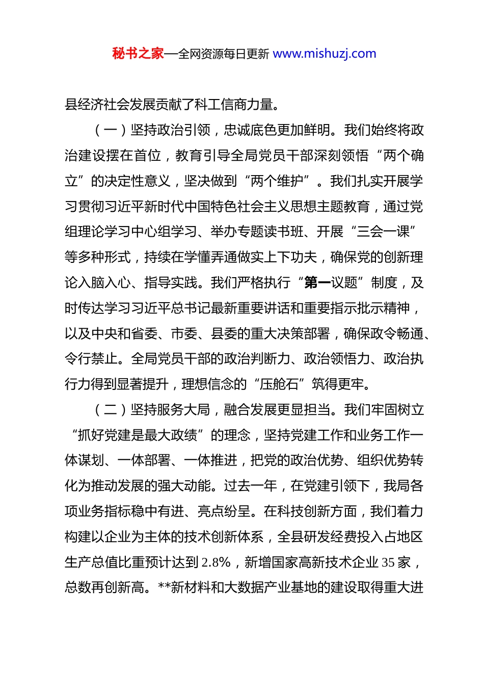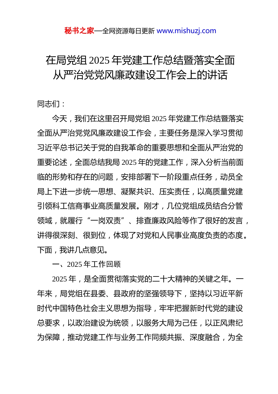 秘书之家—全网资源每日更新 www.mishuzj.com在局党组 2025 年党建工作总结暨落实全面从严治党党风廉政建设工作会上的讲话 同志们:今天,我们在这里召开局党组 2025 年党建工作总结暨落实全面从严治党党风廉政建设工作会,主要任务是深入学习贯彻习近平总书记关于党的自我革命的重要思想和全面从严治党的重要论述,全面总结我局 2025 年的党建工作,深入分析当前面临的形势和存在的问题,安排部署下一阶段重点任务,动员全局上下进一步统一思想、凝聚共识、压实责任,以高质量党建引领科工信商事业高质量发展。刚才,几位党组成员结合分管领域,就履行“一岗双责”、排查廉政风险等作了很好的发言,讲得很深刻、很到位,体现了对党和人民事业高度负责的态度。下面,我讲几点意见。一、2025 年工作回顾2025 年,是全面贯彻落实党的二十大精神的关键之年。一年来,局党组在县委、县政府的坚强领导下,坚持以习近平新时代中国特色社会主义思想为指导,牢牢把握新时代党的建设总要求,以政治建设为统领,以服务大局为己任,以正风肃纪为保障,推动党建工作与业务工作同频共振、深度融合,为全秘书之家—全网资源每日更新 www.mishuzj.com县经济社会发展贡献了科工信商力量。(一)坚持政治引领,忠诚底色更加鲜明。我们始终将政治建设摆在首位,教育引导全局党员干部深刻领悟“两个确立”的决定性意义,坚决做到“两个维护”。我们扎实开展学习贯彻习近平新时代中国特色社会主义思想主题教育,通过党组理论学习中心组学习、举办专题读书班、开展“三会一课”等多种形式,持续在学懂弄通做实上下功夫,确保党的创新理论入脑入心、指导实践。我们严格执行“第一议题”制度,及时传达学习习近平总书记最新重要讲话和重要指示批示精神,以及中央和省委、市委、县委的重大决策部署,确保政令畅通、令行禁止。全局党员干部的政治判断力、政治领悟力、政治执行力得到显著提升,理想信念的“压舱石”筑得更牢。(二)坚持服务大局,融合发展更显担当。我们牢固树立“抓好党建是最大政绩”的理念,坚持党建工作和业务工作一体谋划、一体部署、一体推进,把党的政治优势、组织优势转化为推动发展的强大动能。过去一年,在党建引领下,我局各项业务指标稳中有进、亮点纷呈。在科技创新方面,我们着力构建以企业为主体的技术创新体系,全县研发经费投入占地区生产总值比重预计达到 2.8%,新增国家高新技术企业 35 家,总数再创新高。**新材料和大数据产业基地的建设取得重大进秘书之家—全网资源每日更新 www.mishuzj.com展,为我县未来产业发展打下了坚实基础。在工业发展方面,我们全力以赴稳增长、促转型,全县规模以上工业增加值预计同比增长 6.5%,工业投资增长 8%。我们大力推动制造业数字化转型,超过 50 家企业成功实施“上云用数赋智”工程,产业竟争力持续增强。全年成功引进了 2 个投资超 10 亿元的智能制造项目,为工业经济注入了新的活力。在商务流通方面,我们积极培育消费新热点,全县社会消费品零售总额预计突破 500亿元,同比增长 7%。电子商务发展势头迅猛,网络零售额同比增长超过 15%。我们成功举办了“**优品”线上线下系列展销会,有效拓宽了本地产品的销售渠道,激发了市场活力。这些成绩的取得,是全局党员干部冲锋在前、实干担当的结果,充分彰显了党建工作的强大生命力和战斗力。(三)坚持固本强基,战斗堡垒更加坚固。我们深入推进党支部标准化规范化建设,不断优化组织设置,选优配强支部班子,基层党组织的政治功能和组织功能持续增强。我们严格党员教育管理,高质量落实“三会一课”、主题党日、组织生活会、民主评议党员等制度,党内政治生活更加严肃规范。我们注重在一线考察和发展党员,全年发展新党员 5 名,为党组织注入了新鲜血液。我们设立“党员先锋岗”“党员责任区”,组织党员干部在项目建设、企业服务、招商引资等急难险重任秘书之家—全网资源每日更新 www.mishuzj.com务中挑大梁、当先锋,让党旗在第一线高高飘扬。通过一系列扎实有效的工作,全局基层党组织的凝聚力、向心力和战斗力得到了全面提升。(四)坚持正风肃...