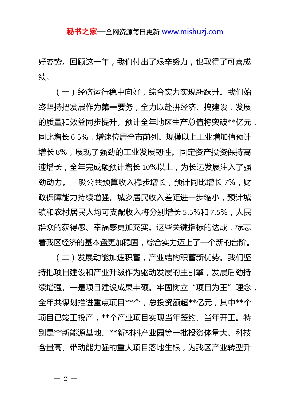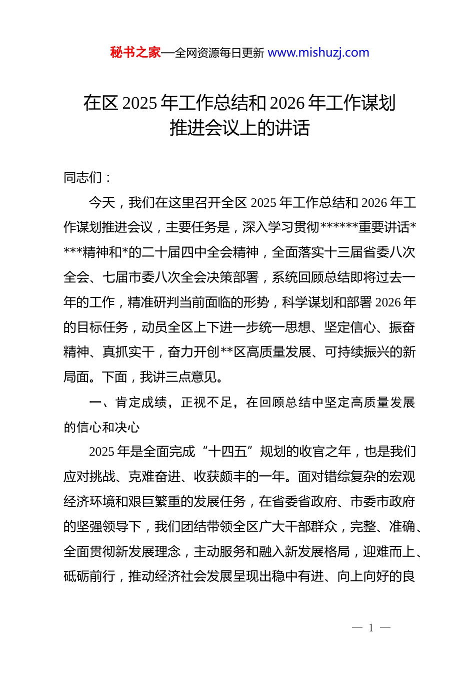 秘书之家—全网资源每日更新 www.mishuzj.com在区 2025 年工作总结和 2026 年工作谋划推进会议上的讲话同志们:今天,我们在这里召开全区 2025 年工作总结和 2026 年工作谋划推进会议,主要任务是,深入学习贯彻******重要讲话****精神和*的二十届四中全会精神,全面落实十三届省委八次全会、七届市委八次全会决策部署,系统回顾总结即将过去一年的工作,精准研判当前面临的形势,科学谋划和部署 2026 年的目标任务,动员全区上下进一步统一思想、坚定信心、振奋精神、真抓实干,奋力开创**区高质量发展、可持续振兴的新局面。下面,我讲三点意见。一、肯定成绩,正视不足,在回顾总结中坚定高质量发展的信心和决心2025 年是全面完成“十四五”规划的收官之年,也是我们应对挑战、克难奋进、收获颇丰的一年。面对错综复杂的宏观经济环境和艰巨繁重的发展任务,在省委省政府、市委市政府的坚强领导下,我们团结带领全区广大干部群众,完整、准确、全面贯彻新发展理念,主动服务和融入新发展格局,迎难而上、砥砺前行,推动经济社会发展呈现出稳中有进、向上向好的良— 1 —秘书之家—全网资源每日更新 www.mishuzj.com好态势。回顾这一年,我们付出了艰辛努力,也取得了可喜成绩。(一)经济运行稳中向好,综合实力实现新跃升。我们始终坚持把发展作为第一要务,全力以赴拼经济、搞建设,发展的质量和效益同步提升。预计全年地区生产总值将突破**亿元,同比增长 6.5%,增速位居全市前列。规模以上工业增加值预计增长 8%,展现了强劲的工业发展韧性。固定资产投资保持高速增长,全年完成额预计增长 10%以上,为长远发展注入了强劲动力。一般公共预算收入稳步增长,预计同比增长 7%,财政保障能力持续增强。城乡居民收入差距进一步缩小,预计城镇和农村居民人均可支配收入将分别增长 5.5%和 7.5%,人民群众的获得感、幸福感更加充实。这些关键指标的达成,标志着我区经济的基本盘更加稳固,综合实力迈上了一个新的台阶。(二)发展动能加速积蓄,产业结构积蓄新优势。我们坚持把项目建设和产业升级作为驱动发展的主引擎,发展后劲持续增强。一是项目建设成果丰硕。牢固树立“项目为王”理念,全年共谋划推进重点项目**个,总投资额超**亿元,其中**个项目已竣工投产,**个产业项目实现当年签约、当年开工。特别是**新能源基地、**新材料产业园等一批投资体量大、科技含量高、带动能力强的重大项目落地生根,为我区产业转型升— 2 —秘书之家—全网资源每日更新 www.mishuzj.com级提供了有力支撑。二是招商引资精准有效。我们组建了**支专业招商队伍,围绕主导产业和战略性新兴产业,奔赴**、**等重点区域开展叩门招商、产业链招商,全年新签约引进项目**个,协议引资额达**亿元,招商引资的“源头活水”充分涌流。三是产业集群初具雏形。立足资源禀赋和产业基础,大力发展现代农业、绿色食品、先进制造、跨境物流四大主导产业。**绿色食品加工产业园的规模效应逐步显现,入驻企业已达**家;**智能制造基地的技术改造取得突破,数字化、智能化水平显著提升,产业集聚效应和竞争力不断增强。(三)乡村振兴全面推进,城乡面貌展现新气象。我们坚持农业农村优先发展,统筹推进乡村发展、乡村建设、乡村治理,一幅业兴、村美、民富的现代版“富春山居图”正在**大地徐徐展开。一是现代农业提质增效。粮食生产再获丰收,总产量达到**万吨,实现“二十二连丰”。大力发展特色农业,**黑大豆、**特色浆果等地理标志产品品牌影响力持续扩大,建成高标准农田**万亩,培育家庭农场、农民合作社等新型农业经营主体**家,农业产业化水平不断提高。二是和美乡村建设扎实推进。深入实施农村人居环境整治提升行动,完成**个村庄的污水处理设施建设和**个乡镇的生活垃圾中转站升级改造,卫生厕所普及率达到 95%以上。成功创建省级美丽宜居村庄**— 3 —秘书之家—全网资源每日更新 www.mishuzj.com个、市级示范村**个,乡村“颜值”和“内涵”双提升。三是农民收入渠道持续拓宽。大力发展乡村旅游、农村电商等新业态,打造了以**民俗村、**生态旅游区为代表的乡村旅游精品...