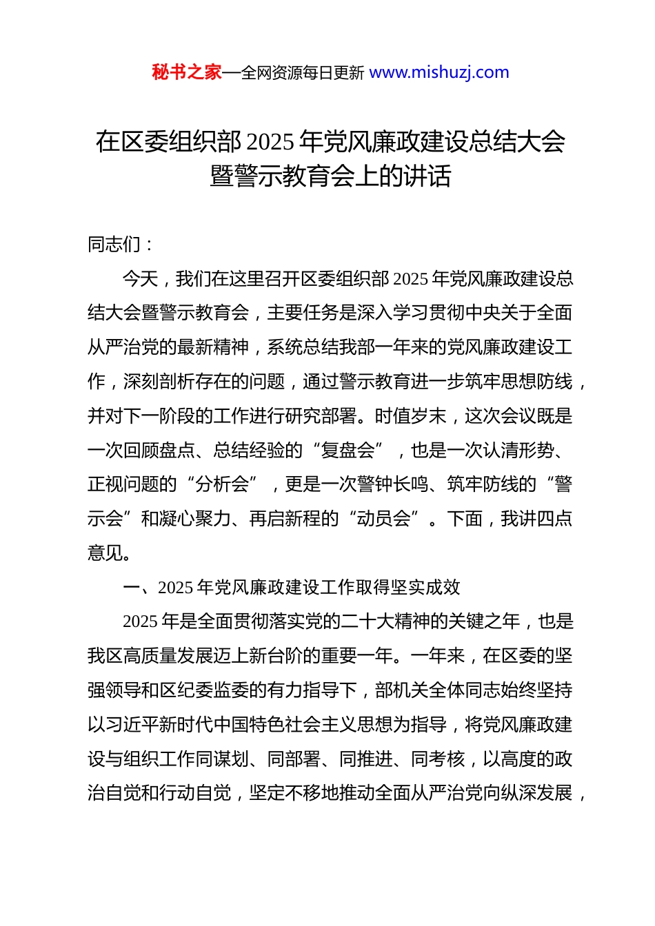 秘书之家—全网资源每日更新 www.mishuzj.com在区委组织部 2025 年党风廉政建设总结大会暨警示教育会上的讲话 同志们:今天,我们在这里召开区委组织部 2025 年党风廉政建设总结大会暨警示教育会,主要任务是深入学习贯彻中央关于全面从严治党的最新精神,系统总结我部一年来的党风廉政建设工作,深刻剖析存在的问题,通过警示教育进一步筑牢思想防线,并对下一阶段的工作进行研究部署。时值岁末,这次会议既是一次回顾盘点、总结经验的“复盘会”,也是一次认清形势、正视问题的“分析会”,更是一次警钟长鸣、筑牢防线的“警示会”和凝心聚力、再启新程的“动员会”。下面,我讲四点意见。一、2025 年党风廉政建设工作取得坚实成效2025 年是全面贯彻落实党的二十大精神的关键之年,也是我区高质量发展迈上新台阶的重要一年。一年来,在区委的坚强领导和区纪委监委的有力指导下,部机关全体同志始终坚持以习近平新时代中国特色社会主义思想为指导,将党风廉政建设与组织工作同谋划、同部署、同推进、同考核,以高度的政治自觉和行动自觉,坚定不移地推动全面从严治党向纵深发展,秘书之家—全网资源每日更新 www.mishuzj.com为全区组织工作高质量发展提供了坚强的纪律保障。(一)深化政治建设,忠诚之魂更加坚定。我们始终将政治建设摆在首位,把旗帜鲜明讲政治贯穿于组织工作全过程、各方面。我们第一时间组织传达学习了《中共中央政治局召开会议研究部署党风廉-政建设和反腐败工作》的重要精神,深刻领会习近平总书记的重要讲话要求,确保中央的决策部署在组织部门不折不扣地得到落实。通过理论学习中心组学习、“三会一课”、主题党日等多种形式,我们组织全体组工干部深入学习党的创新理论,累计开展集中学习 30 余次,专题研讨 8 次,不断增强“四个意识”、坚定“四个自信”、做到“两个维护”。我们坚持把对党忠诚作为组工干部的首要政治品质,通过开展政治忠诚教育和党性分析活动,引导大家深刻领悟“两个确立”的决定性意义,确保组织部门在任何时候、任何情况下都绝对忠诚、绝对纯洁、绝对可靠。(二)压实责任链条,“两个责任”一体落实。我们深刻认识到,抓好党风廉政建设是组织部门的应尽之责、分内之事。部务会坚持将党风廉政建设工作纳入重要议事日程,年内先后4 次召开专题会议进行研究部署,制定并印发了《2025 年党风廉政建设工作要点》和《责任清单》,将责任细化分解到每位班子成员、每个科室和每位干部。我作为常务副部长,认真履秘书之家—全网资源每日更新 www.mishuzj.com行“第一责任人”职责,对重要工作亲自部署、重大问题亲自过问、重点环节亲自协调。部班子其他成员严格履行“一岗双责”,切实加强对分管领域和科室人员的日常教育、提醒和监督管理,形成了主要领导负总责、分管领导各负其责、科室负责人“一岗双责”、全体干部共同参与的齐抓共管工作格局。(三)强化日常监督,纪律防线更加牢固。我们坚持抓早抓小、防微杜渐,将监督的探头延伸到干部日常工作的“八小时之内”和社交生活的“八小时之外”。一年来,我们综合运用谈心谈话、廉政提醒、函询诫勉等多种方式,强化对干部的日常监督。基于逻辑合理推断,2025 年全年,我们共开展各类廉政谈话提醒 80 余人次,其中对新提拔、新入职干部进行集体廉政谈话 3 次,覆盖 25 人;处理信访举报和问题线索 5 件,对苗头性、倾向性问题及时“咬耳扯袖”,防止小问题演变成大错误。我们严格执行干部选拔任用监督制度,坚决落实“凡提四必”和廉政意见“双签字”制度,全年共对 120 余名拟提拔或进一步使用的干部进行了廉政审核,坚决防止“带病提拔”。同时,我们注重发挥巡察利剑作用,积极配合区委巡察工作,对巡察反馈涉及组织部门的问题,坚持立行立改、真改实改,确保件件有着落、事事有回音。(四)狠抓作风纠治,模范形象更加彰显。作为管党治吏秘书之家—全网资源每日更新 www.mishuzj.com的重要部门,我们深知自身作风建设的重要性,始终以更高标准、更严要求锤炼过硬作风。我们带头严格执行中央八项规定及其实施细则精神,对违规收送礼品礼金、违规吃喝、公...