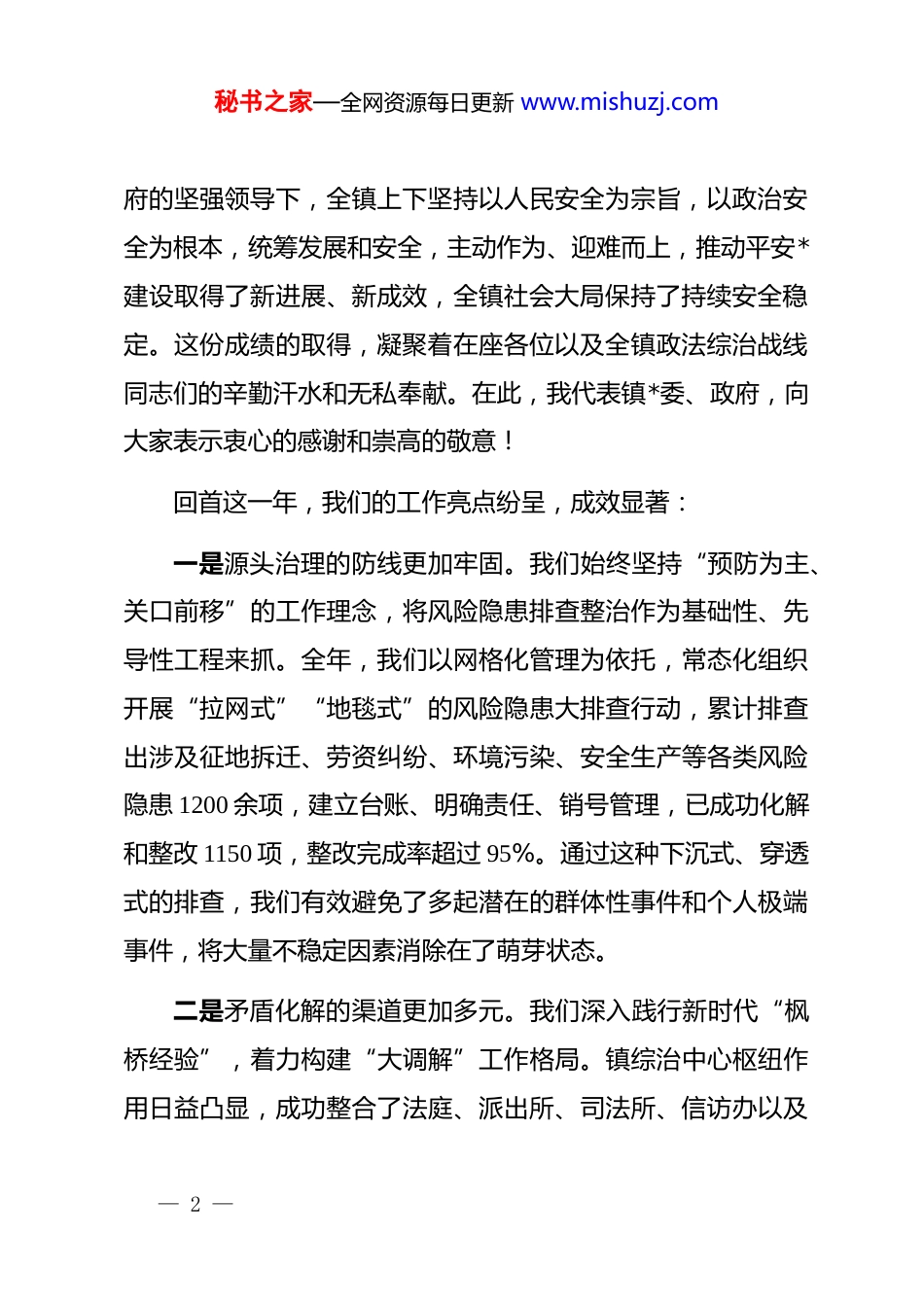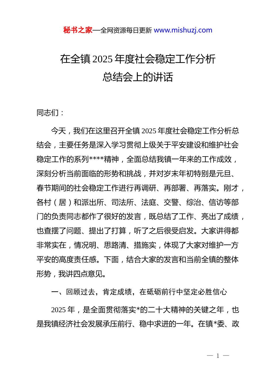 秘书之家—全网资源每日更新 www.mishuzj.com在全镇 2025 年度社会稳定工作分析总结会上的讲话同志们:今天,我们在这里召开全镇 2025 年度社会稳定工作分析总结会,主要任务是深入学习贯彻上级关于平安建设和维护社会稳定工作的系列****精神,全面总结我镇一年来的工作成效,深刻分析当前面临的形势和挑战,并对岁末年初特别是元旦、春节期间的社会稳定工作进行再调研、再部署、再落实。刚才,各村(居)和派出所、司法所、法庭、交警、综治、信访等部门的负责同志都作了很好的发言,既总结了工作、亮出了成绩,也查摆了问题、提出了打算,听了之后很受启发。大家讲得都非常实在,情况明、思路清、措施实,体现了大家对维护一方平安的高度责任感。下面,结合大家的发言和当前全镇的整体形势,我讲四点意见。一、回顾过去,肯定成绩,在砥砺前行中坚定必胜信心2025 年,是全面贯彻落实*的二十大精神的关键之年,也是我镇经济社会发展承压前行、稳中求进的一年。在镇*委、政— 1 —秘书之家—全网资源每日更新 www.mishuzj.com府的坚强领导下,全镇上下坚持以人民安全为宗旨,以政治安全为根本,统筹发展和安全,主动作为、迎难而上,推动平安*建设取得了新进展、新成效,全镇社会大局保持了持续安全稳定。这份成绩的取得,凝聚着在座各位以及全镇政法综治战线同志们的辛勤汗水和无私奉献。在此,我代表镇*委、政府,向大家表示衷心的感谢和崇高的敬意!回首这一年,我们的工作亮点纷呈,成效显著:一是源头治理的防线更加牢固。我们始终坚持“预防为主、关口前移”的工作理念,将风险隐患排查整治作为基础性、先导性工程来抓。全年,我们以网格化管理为依托,常态化组织开展“拉网式”“地毯式”的风险隐患大排查行动,累计排查出涉及征地拆迁、劳资纠纷、环境污染、安全生产等各类风险隐患 1200 余项,建立台账、明确责任、销号管理,已成功化解和整改 1150 项,整改完成率超过 95%。通过这种下沉式、穿透式的排查,我们有效避免了多起潜在的群体性事件和个人极端事件,将大量不稳定因素消除在了萌芽状态。二是矛盾化解的渠道更加多元。我们深入践行新时代“枫桥经验”,着力构建“大调解”工作格局。镇综治中心枢纽作用日益凸显,成功整合了法庭、派出所、司法所、信访办以及— 2 —秘书之家—全网资源每日更新 www.mishuzj.com行业性专业性调解组织的力量。全年共受理并成功调处各类矛盾纠纷 487 起,调解成功率达到 98.2%,其中超过 85%的纠纷在村(居)一级就得到了妥善解决,“小事不出村、大事不出镇、矛盾不上交”的目标正在从愿景变为现实。特别是*村的“百姓评理堂”、*社区的“法律服务角”等一批基层治理品牌,在化解邻里纠纷、家庭矛盾方面发挥了不可替代的作用。三是社会治安的掌控更加有力。我们始终保持对各类违法犯罪活动的高压态势,严打方针不动摇。派出所同志们不辞辛劳,持续深化扫黑除恶斗争,严厉打击盗抢骗、黄赌毒、食药环等突出违法犯罪,特别是针对群众反映强烈的电信网络诈骗犯罪,我们开展了多轮次的专项宣传和打击行动,有效遏制了案件高发势头。数据显示,2025 年我镇刑事案件、治安案件发案率同比分别下降 15.3%和 18.6%,社会治安环境得到了显著净化。四是平安建设的根基更加坚实。我们广泛动员社会各界力量参与平安建设,形成了齐抓共管、共建共享的良好局面。“平安家庭”“平安校园”“平安企业”等“平安细胞”工程创建活动深入开展,基层组织的战斗堡垒作用和*员的先锋模范作用得到充分发挥。全镇群众的安全感和对政法工作的满意度— 3 —秘书之家—全网资源每日更新 www.mishuzj.com持续攀升,在最新的第三方测评中,我镇群众安全感满意度达到了 98.7%,创下了历史新高。这些成绩来之不易,是我们坚决贯彻上级决策部署的结果是全镇上下团结一心、奋力拼搏的结果。但成绩只能代表过去,我们必须清醒地认识到,维护社会稳定是一项长期而艰巨的任务,容不得我们有丝毫的自满和懈怠。二、认清形势,正视问题,在深刻洞察中保持高度清醒在肯定成绩的同时,我们更要用辩证的、发展的眼光审视当前面临的形势,用“放...