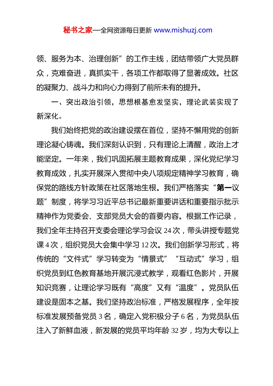 秘书之家—全网资源每日更新 www.mishuzj.com在社区 2025 年度党建工作总结会议上的讲话 同志们:大家好!今天,我们怀着庄重而务实的心情,在这里召开社区党委 2025 年度党建工作总结会议。这次会议,既是一次回顾过去、总结经验的“复盘会”,更是一次分析形势、明确任务的“动员会”,还是一次凝心聚力、再启新程的“誓师会”。主要任务是,全面总结 2025 年社区党建工作的成绩与不足,深刻分析当前我们面临的新形势与新挑战,系统部署 2026 年的重点工作和奋斗目标,动员社区全体党员干部以更加饱满的热情、更加昂扬的斗志、更加务实的作风,共同开创我们社区发展的美好新图景。在此,我谨代表社区党委,向一年来辛勤工作在各个岗位上的全体党员同志、社区工作者以及默默支持我们工作的家属们,表示最衷心的感谢和最崇高的敬意!第一部分:回顾 2025——砥砺奋进,党建引领结出累累硕果2025 年,是全面贯彻落实党的二十大精神的关键之年,也是我们社区在高质量发展道路上攻坚克难、奋勇前行的一年。一年来,在街道党工委的坚强领导下,社区党委始终坚持以习近平新时代中国特色社会主义思想为指导,紧紧围绕“党建引秘书之家—全网资源每日更新 www.mishuzj.com领、服务为本、治理创新”的工作主线,团结带领广大党员群众,克难奋进,真抓实干,各项工作都取得了显著成效。社区的凝聚力、战斗力和向心力得到了前所未有的提升。一、突出政治引领,思想根基愈发坚实,理论武装实现了新深化。我们始终把党的政治建设摆在首位,坚持不懈用党的创新理论凝心铸魂。我们深刻认识到,只有理论上清醒,政治上才能坚定。一年来,我们巩固拓展主题教育成果,深化党纪学习教育成效,扎实开展深入贯彻中央八项规定精神学习教育,确保党的路线方针政策在社区落地生根。我们严格落实“第一议题”制度,将学习习近平总书记最新重要讲话和重要指示批示精神作为党委会、支部党员大会的首要内容。根据工作记录,我们全年主持召开支委会理论学习会议 24 次,带头讲授专题党课 4 次,组织党员大会集中学习 12 次。我们创新学习形式,将传统的“文件式”学习转变为“情景式”“互动式”学习,组织党员到红色教育基地开展沉浸式教学,观看红色影片,开展知识竞赛,让理论学习既有“高度”又有“温度”。党员队伍建设是固本之基。我们坚持政治标准,严格发展程序,全年按标准发展预备党员 3 名,确定入党积极分子 6 名,为党员队伍注入了新鲜血液,新发展的党员平均年龄 32 岁,均为大专以上秘书之家—全网资源每日更新 www.mishuzj.com学历,进一步优化了党员队伍的年龄结构和知识结构。二、深化基层治理,社区画卷焕然一新,治理效能取得了新突破。我们坚持和发展新时代“枫桥经验”,以党建引领基层治理为主线,积极探索“党建+网格”的精细化治理模式。我们将社区划分为若干个网格,每个网格配备一名网格员、一名党员中心户,形成“支部建在网格上、党小组设在楼栋里、党员责任落到户”的组织体系。这种体系让党组织的触角延伸到社区的每一个角落,实现了服务群众“零距离”。在矛盾化解方面,我们创新设立了“睦邻议事厅”协商平台,邀请党员代表、居民代表、物业代表等多方参与,共同协商解决社区公共事务。2025 年,我们成功调解邻里矛盾、物业纠纷等各类问题 28 件,其中通过“睦邻议事厅”平台协商解决的就有 10 件。同时,我们建立了党员联系群众、结对帮扶制度,12 对党员与困难群众结成对子,帮助他们解决实际困难 26 件,真正把党的温暖送到了群众心坎上。社区的平安与和谐,离不开志愿服务的无私奉献。我们大力弘扬志愿精神,成立了“红马甲”党员志愿服务队,全年新增志愿者 80 余人,常态化开展环境整治、扶老助残、政策宣传等活动,让“有时间做志愿者、有困难找志愿者”在社区蔚然成风。秘书之家—全网资源每日更新 www.mishuzj.com三、聚焦民生福祉,服务温度持续提升,群众幸福感获得了新增强。我们始终牢记“人民对美好生活的向往,就是我们的奋斗目标”,将“我为群众办实事”实践活动贯穿全年工作始终,用心用情用力解决群众的急难愁盼问题...