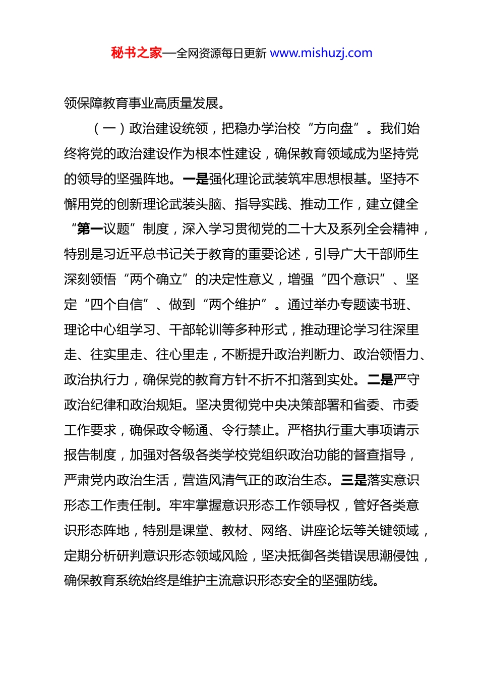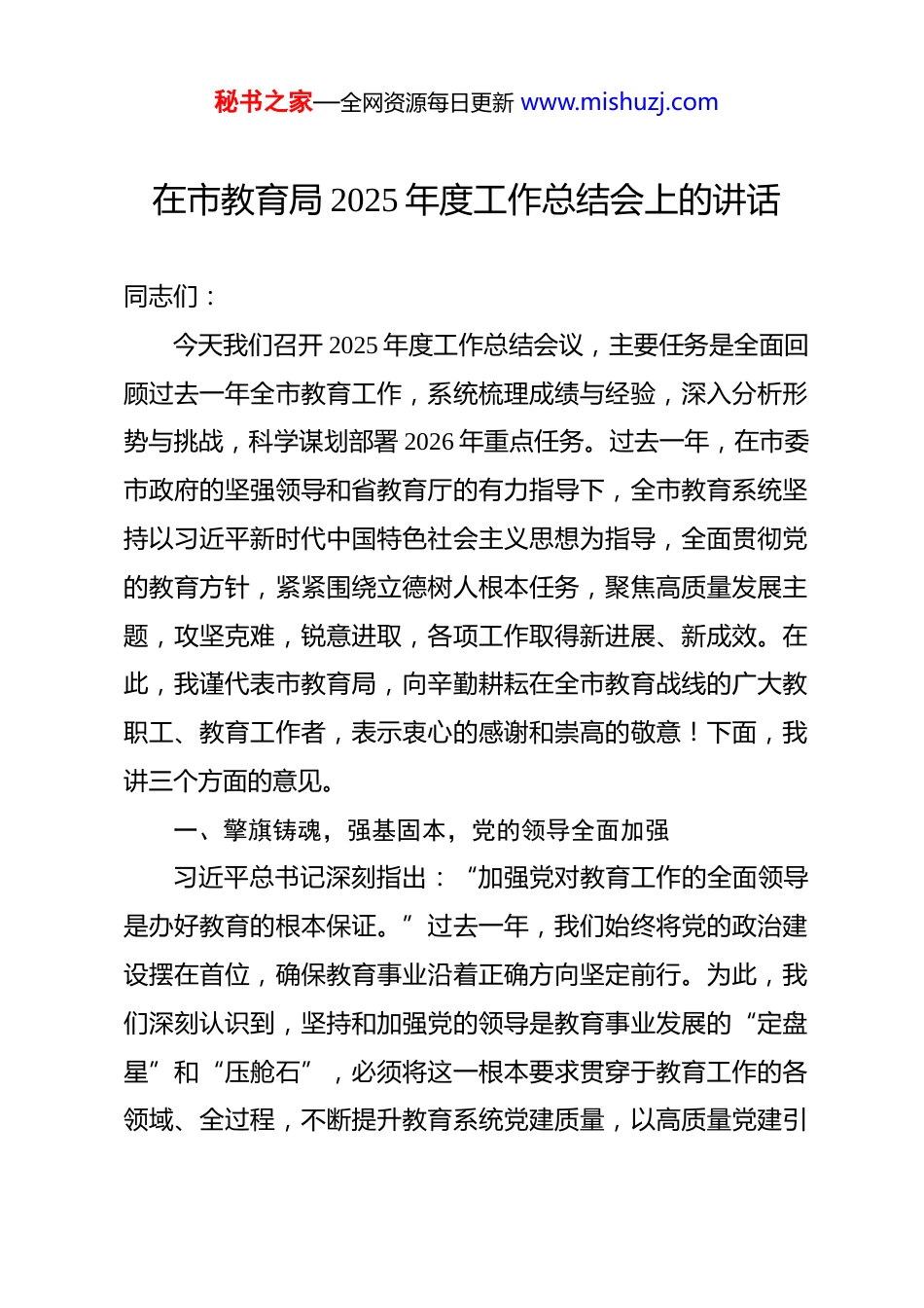 秘书之家—全网资源每日更新 www.mishuzj.com在市教育局 2025 年度工作总结会上的讲话 同志们:今天我们召开 2025 年度工作总结会议,主要任务是全面回顾过去一年全市教育工作,系统梳理成绩与经验,深入分析形势与挑战,科学谋划部署 2026 年重点任务。过去一年,在市委市政府的坚强领导和省教育厅的有力指导下,全市教育系统坚持以习近平新时代中国特色社会主义思想为指导,全面贯彻党的教育方针,紧紧围绕立德树人根本任务,聚焦高质量发展主题,攻坚克难,锐意进取,各项工作取得新进展、新成效。在此,我谨代表市教育局,向辛勤耕耘在全市教育战线的广大教职工、教育工作者,表示衷心的感谢和崇高的敬意!下面,我讲三个方面的意见。一、擎旗铸魂,强基固本,党的领导全面加强习近平总书记深刻指出:“加强党对教育工作的全面领导是办好教育的根本保证。”过去一年,我们始终将党的政治建设摆在首位,确保教育事业沿着正确方向坚定前行。为此,我们深刻认识到,坚持和加强党的领导是教育事业发展的“定盘星”和“压舱石”,必须将这一根本要求贯穿于教育工作的各领域、全过程,不断提升教育系统党建质量,以高质量党建引秘书之家—全网资源每日更新 www.mishuzj.com领保障教育事业高质量发展。(一)政治建设统领,把稳办学治校“方向盘”。我们始终将党的政治建设作为根本性建设,确保教育领域成为坚持党的领导的坚强阵地。一是强化理论武装筑牢思想根基。坚持不懈用党的创新理论武装头脑、指导实践、推动工作,建立健全“第一议题”制度,深入学习贯彻党的二十大及系列全会精神,特别是习近平总书记关于教育的重要论述,引导广大干部师生深刻领悟“两个确立”的决定性意义,增强“四个意识”、坚定“四个自信”、做到“两个维护”。通过举办专题读书班、理论中心组学习、干部轮训等多种形式,推动理论学习往深里走、往实里走、往心里走,不断提升政治判断力、政治领悟力、政治执行力,确保党的教育方针不折不扣落到实处。二是严守政治纪律和政治规矩。坚决贯彻党中央决策部署和省委、市委工作要求,确保政令畅通、令行禁止。严格执行重大事项请示报告制度,加强对各级各类学校党组织政治功能的督查指导,严肃党内政治生活,营造风清气正的政治生态。三是落实意识形态工作责任制。牢牢掌握意识形态工作领导权,管好各类意识形态阵地,特别是课堂、教材、网络、讲座论坛等关键领域,定期分析研判意识形态领域风险,坚决抵御各类错误思潮侵蚀,确保教育系统始终是维护主流意识形态安全的坚强防线。秘书之家—全网资源每日更新 www.mishuzj.com(二)思想建设铸魂,凝聚立德树人“向心力”。我们坚持以科学理论滋养初心、引领使命,筑牢广大师生团结奋斗的共同思想基础。一是深化理想信念教育。将习近平新时代中国特色社会主义思想作为思想政治教育的核心内容,推进党的创新理论进教材、进课堂、进头脑。围绕重大主题和时间节点,精心组织开展内容丰富、形式多样的主题宣传教育活动,引导青少年学生坚定理想信念,厚植爱国情怀,传承红色基因,争做担当民族复兴大任的时代新人。二是培育和践行社会主义核心价值观。将社会主义核心价值观融入教育教学和管理服务各环节,贯穿基础教育、职业教育、高等教育等各领域。加强中华优秀传统文化、革命文化和社会主义先进文化教育,深化“扣好人生第一粒扣子”主题教育实践活动,发挥好思政课关键课程作用,推动课程思政与思政课程同向同行,构建全员、全过程、全方位育人格局。三是加强师生思想政治工作。建立健全教职工政治理论学习制度,关注师生思想动态,加强人文关怀和心理疏导,提升思想政治工作的针对性、实效性。加强师德师风建设,将思想政治表现和师德素养作为教师评价的首要标准,引导广大教师争做“四有”好老师。(三)组织建设夯基,锻造教育发展“主心骨”。我们着力建强教育系统党的组织体系,提升党组织的凝聚力和战斗力。秘书之家—全网资源每日更新 www.mishuzj.com一是健全党的组织体系。优化市教育局机关和直属单位党组织设置,指导推动各级各类学校建立健全党组织,实现党的组织和党的工作全覆盖。选优...