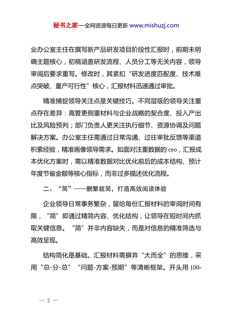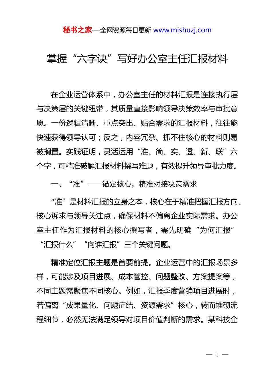 秘书之家—全网资源每日更新 www.mishuzj.com掌握“六字诀”写好办公室主任汇报材料在企业运营体系中,办公室主任的材料汇报是连接执行层与决策层的关键纽带,其质量直接影响领导决策效率与审批意愿。一份逻辑清晰、重点突出、贴合需求的汇报材料,往往能快速获得领导认可;反之,内容冗杂、抓不住核心的材料则易被搁置。实践证明,灵活运用“准、简、实、透、新、联”六个字,可精准破解汇报材料撰写难题,有效提升领导审批力度。一、“准”——锚定核心,精准对接决策需求“准”是材料汇报的立身之本,核心在于精准把握汇报方向、核心诉求与领导关注点,确保材料不偏离企业实际需求。办公室主任作为汇报材料的核心撰写者,需先明确“为何汇报”“汇报什么”“向谁汇报”三个关键问题。精准定位汇报主题是首要前提。企业运营中的汇报场景多样,可能涉及项目进展、成本管控、问题整改、方案提案等,不同主题需聚焦不同核心。例如,汇报季度营销项目进展时,若偏离“成果量化、问题症结、资源需求”核心,转而堆砌流程细节,必然无法满足领导对项目价值判断的需求。某科技企— 1 —秘书之家—全网资源每日更新 www.mishuzj.com业办公室主任在撰写新产品研发项目阶段性汇报时,前期未明确主题核心,初稿涵盖研发流程、人员分工等无关内容,领导审阅后要求重写。修改时,其紧扣“研发进度匹配度、技术难点突破、量产可行性”核心,汇报材料迅速通过审批。精准捕捉领导关注点是关键技巧。不同层级的领导关注重点存在差异:高管更侧重材料与企业战略的契合度、投入产出比及风险预判;部门负责人更关注执行细节、资源协调及问题解决方案。办公室主任需通过日常沟通、过往审批反馈等渠道积累经验,精准画像领导需求。如面对注重数据的 ceo,汇报成本优化方案时,需以精准数据对比优化前后的成本结构、预计年度节省金额等核心指标,而非过多描述优化流程。二、“简”——删繁就简,打造高效阅读体验企业领导日常事务繁杂,留给每份汇报材料的审阅时间有限,“简”即通过精简内容、优化结构,让领导在短时间内抓取关键信息。“简”并非内容缺失,而是对信息的精准筛选与高效呈现。结构简化是基础。汇报材料需摒弃“大而全”的思维,采用“总-分-总”“问题-方案-预期”等清晰框架。开头用 100-— 2 —秘书之家—全网资源每日更新 www.mishuzj.com200 字概括核心内容,包括背景、核心问题、主要结论或请求;中间分点阐述支撑内容,每个部分聚焦一个核心要点;结尾重申关键诉求或预期成果。某制造企业办公室主任撰写设备更新申请汇报时,初期采用冗长的行业背景铺垫,领导翻阅三页仍未找到核心诉求。修改后,开头直接点明“现有设备老化导致产能下降 15%,申请更新 3 台核心设备,预计投入 200 万元,年增产值 500 万元”,后续仅用数据说明产能影响、设备选型依据及投资回报周期,材料当天即获审批。语言精简是关键。需避免空话、套话及专业术语堆砌,用直白、准确的语言表达核心意思。如描述库存问题时,“库存积压情况较为严重,对资金流转产生一定负面影响”可简化为“库存积压达 800 万元,占用流动资金周期超 90 天,影响原材料采购付款”。同时,善用图表替代文字描述,对于数据对比、流程梳理等内容,柱状图、折线图、流程图等可视化形式能大幅降低阅读成本,提升信息传递效率。三、“实”——立足实际,夯实汇报可信度企业决策依赖真实、可靠的信息支撑,“实”即材料内容立足企业实际,数据真实、案例具体、方案可行,这是获得领导信任与审批的核心前提。— 3 —秘书之家—全网资源每日更新 www.mishuzj.com数据真实是底线。汇报材料中涉及的产值、成本、进度、效率等数据,必须源于企业财务系统、业务台账等官方渠道,经反复核对确认无误后再呈现。对暂未明确的数据,需标注“预估”“待核实”等字样,并说明估算依据,坚决杜绝虚构数据、夸大成果或隐瞒问题。某零售企业办公室主任在汇报门店拓张成效时,为凸显业绩,虚报新开门店月销售额,后续财务核查时发现数据不实,不仅该汇报被驳回,其个人专业可信度也受到严重影响。反之,某物流企业办公室主任在...