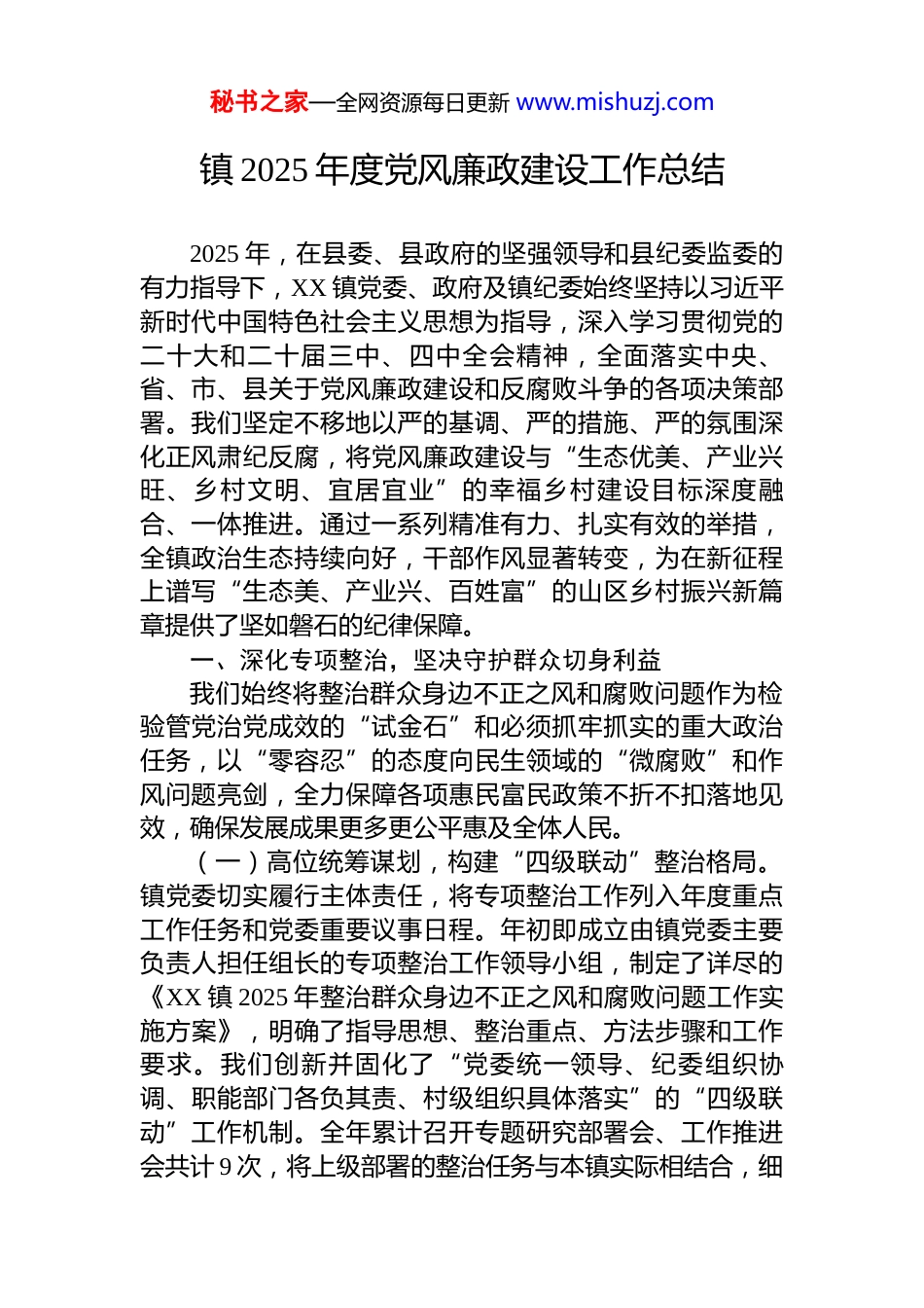 秘书之家—全网资源每日更新 www.mishuzj.com镇 2025 年度党风廉政建设工作总结2025 年,在县委、县政府的坚强领导和县纪委监委的有力指导下,XX 镇党委、政府及镇纪委始终坚持以习近平新时代中国特色社会主义思想为指导,深入学习贯彻党的二十大和二十届三中、四中全会精神,全面落实中央、省、市、县关于党风廉政建设和反腐败斗争的各项决策部署。我们坚定不移地以严的基调、严的措施、严的氛围深化正风肃纪反腐,将党风廉政建设与“生态优美、产业兴旺、乡村文明、宜居宜业”的幸福乡村建设目标深度融合、一体推进。通过一系列精准有力、扎实有效的举措,全镇政治生态持续向好,干部作风显著转变,为在新征程上谱写“生态美、产业兴、百姓富”的山区乡村振兴新篇章提供了坚如磐石的纪律保障。一、深化专项整治,坚决守护群众切身利益我们始终将整治群众身边不正之风和腐败问题作为检验管党治党成效的“试金石”和必须抓牢抓实的重大政治任务,以“零容忍”的态度向民生领域的“微腐败”和作风问题亮剑,全力保障各项惠民富民政策不折不扣落地见效,确保发展成果更多更公平惠及全体人民。(一)高位统筹谋划,构建“四级联动”整治格局。镇党委切实履行主体责任,将专项整治工作列入年度重点工作任务和党委重要议事日程。年初即成立由镇党委主要负责人担任组长的专项整治工作领导小组,制定了详尽的《XX 镇 2025 年整治群众身边不正之风和腐败问题工作实施方案》,明确了指导思想、整治重点、方法步骤和工作要求。我们创新并固化了“党委统一领导、纪委组织协调、职能部门各负其责、村级组织具体落实”的“四级联动”工作机制。全年累计召开专题研究部署会、工作推进会共计 9 次,将上级部署的整治任务与本镇实际相结合,细秘书之家—全网资源每日更新 www.mishuzj.com化分解为 3 大类 15 项具体指标,实行清单化、台账式管理,确保每一项任务都有人抓、有人管、有节点、有反馈,形成了上下贯通、左右协同、齐抓共管的强大合力。(二)坚持开门整治,畅通拓宽问题线索渠道。我们深知,群众的眼睛是雪亮的,专项整治必须依靠群众、发动群众。为此,我们构建了线上线下相结合、传统现代相补充的立体化宣传监督网络。线上,充分利用政务公众号等新媒体平台,定期推送惠民政策解读、专项整治动态以及典型案例通报,提升群众的政策知晓率和监督意识。线下,组织镇村干部、网格员深入田间地头、农户家中,发放宣传资料,在交通要道、村组公告栏等显眼位置悬挂宣传标语。特别是在各村(社区)党群服务中心及人流密集处张贴“一键举报”二维码,群众通过手机扫码即可匿名反映问题、提出建议,极大地方便了群众监督。同时,我们从各村(社区)中聘请了党性强、威望高、敢于直言的老党员、退休干部和乡贤能人担任义务监督员,赋予他们监督权和建议权,构建起“信、访、网、电”四位一体的监督举报体系。全年累计收集群众各类意见建议,经过梳理研判,形成有效问题线索,做到了民有所呼、我有所应。(三)聚焦关键领域,靶向施治民生痛点难点。我们坚持问题导向,紧盯乡村振兴、惠农补贴、特困供养、农村“三资”管理等重点领域,结合本镇产业发展和民生实际,精准确定整治的“靶心”。在巩固拓展脱贫攻坚成果同乡村振兴有效衔接方面,我们严查产业帮扶、就业扶持、小额信贷等政策落实中的形式主义、官僚主义问题。围绕我镇“八有”山地立体农业发展规划,镇纪委联合农业农村、财政等部门,对生态放养鸡、中蜂养殖、道地药材种植等特色产业的补助资金、项目资金管理使用情况开展了 2 轮专项督查,重点核查是否存在虚报冒领、截留挪用、优亲厚友等行为,确保每年数百万的产业效益真正惠秘书之家—全网资源每日更新 www.mishuzj.com及广大农户,为群众的“钱袋子”加上“安全锁”。二、夯实“三化”建设,着力提升纪检履职能力乡镇纪委是全面从严治党向基层延伸的“前哨”和“尖兵”。一年来,XX 镇纪委以县纪委监委开展的纪检监察工作规范化、法治化、正规化建设为契机,全面加强自身建设,不断提升履职尽责的能力和水平。(一)推进制度化建设,实现用制度管权管事。我们...