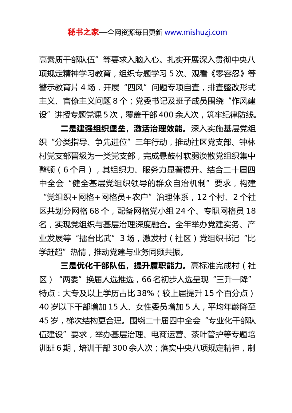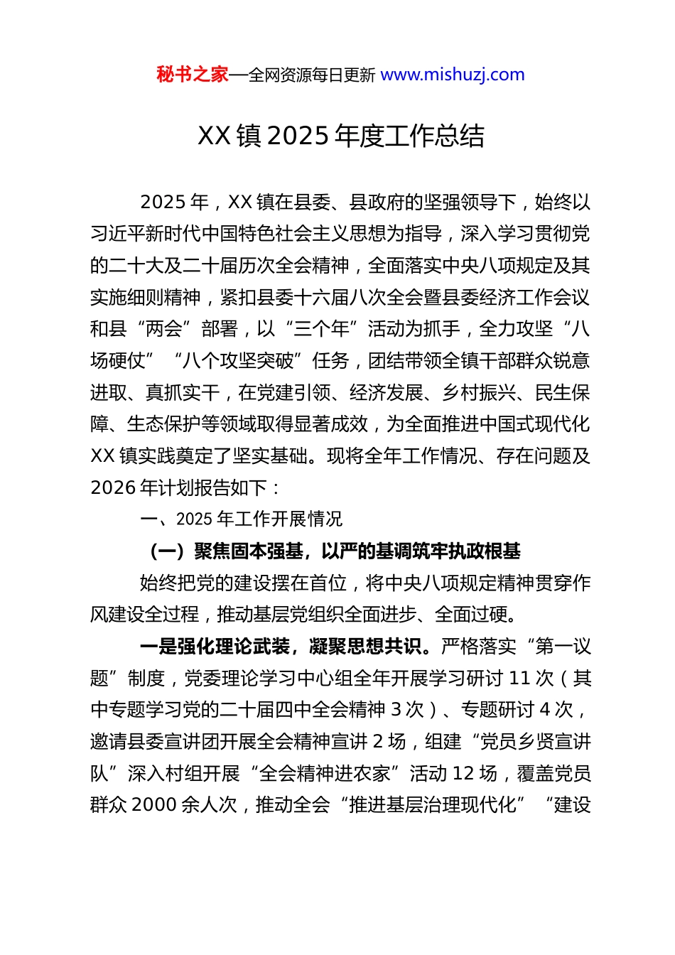 秘书之家—全网资源每日更新 www.mishuzj.comXX 镇 2025 年度工作总结2025 年,XX 镇在县委、县政府的坚强领导下,始终以习近平新时代中国特色社会主义思想为指导,深入学习贯彻党的二十大及二十届历次全会精神,全面落实中央八项规定及其实施细则精神,紧扣县委十六届八次全会暨县委经济工作会议和县“两会”部署,以“三个年”活动为抓手,全力攻坚“八场硬仗”“八个攻坚突破”任务,团结带领全镇干部群众锐意进取、真抓实干,在党建引领、经济发展、乡村振兴、民生保障、生态保护等领域取得显著成效,为全面推进中国式现代化XX 镇实践奠定了坚实基础。现将全年工作情况、存在问题及2026 年计划报告如下:一、2025 年工作开展情况(一)聚焦固本强基,以严的基调筑牢执政根基始终把党的建设摆在首位,将中央八项规定精神贯穿作风建设全过程,推动基层党组织全面进步、全面过硬。一是强化理论武装,凝聚思想共识。严格落实“第一议题”制度,党委理论学习中心组全年开展学习研讨 11 次(其中专题学习党的二十届四中全会精神 3 次)、专题研讨 4 次,邀请县委宣讲团开展全会精神宣讲 2 场,组建“党员乡贤宣讲队”深入村组开展“全会精神进农家”活动 12 场,覆盖党员群众 2000 余人次,推动全会“推进基层治理现代化”“建设秘书之家—全网资源每日更新 www.mishuzj.com高素质干部队伍”等要求入脑入心。扎实开展深入贯彻中央八项规定精神学习教育,组织专题学习 5 次、观看《零容忍》等警示教育片 4 场,开展“四风”问题专项自查,排查整改形式主义、官僚主义问题 8 个;党委书记及班子成员围绕“作风建设”讲授专题党课 5 次,覆盖干部 400 余人次,筑牢纪律防线。二是建强组织堡垒,激活治理效能。深入实施基层党组织“分类指导、争先进位”三年行动,推动社区党支部、钟林村党支部晋级为一类党支部,完成悬鼓村软弱涣散党组织集中整顿(6 个月),其组织力、服务力显著提升。结合二十届四中全会“健全基层党组织领导的群众自治机制”要求,构建“党组织+网格+网格员+农户”治理体系,12 个村、2 个社区共划分网格 68 个,配备网格党小组 24 个、专职网格员 18名,实现党组织与基层治理深度融合。全年举办党建实务、产业发展等“擂台比武”3 场,激发村(社区)党组织书记“比学赶超”热情,推动党建与业务同频共振。三是优化干部队伍,提升履职能力。高标准完成村(社区)“两委”换届人选推选,66 名初步人选呈现“三升一降”特点:大专及以上学历占比 38%(较上届提升 15 个百分点)40 岁以下干部增加 15 人、女性委员增加 5 人,平均年龄降至45 岁,梯次结构更合理。围绕二十届四中全会“专业化干部队伍建设”要求,举办基层治理、电商运营、茶叶管护等专题培训班 6 期,培训干部 300 余人次;落实中央八项规定精神,制秘书之家—全网资源每日更新 www.mishuzj.com定《XX 镇干部日常行为规范》,开展干部作风评议 2 次,对 3名评议靠后的干部进行约谈提醒,推动干部作风持续转变。(二)聚力稳进提质,以实的举措增强发展动能紧扣党的二十届四中全会“构建高水平社会主义市场经济体制”要求,统筹投资、工业、招商协同发力,推动经济运行稳中快进。一是狠抓项目投资,夯实增长基础。紧盯年度固定资产投资目标,建立“项目专班+定期调度”机制,全年完成固定资产投资 1.1 亿元(完成率 86.4%)。5 个年度重点项目中,集镇功能提升、产业道路硬化等 3 个项目竣工投用,有效改善集镇承载能力和产业发展条件;申报纳统入库项目 3 个(总投资 3300 万元),超额完成全年任务,为经济增长积蓄后劲。在项目推进中,严格落实中央八项规定精神,杜绝项目审批“吃拿卡要”,优化要素保障(用地、资金等),推动项目早落地、早见效。二是稳住工业基本盘,提升发展质效。面对宏观经济压力,建立“一企一策”精准服务机制,为 3 家在库规模以上工业企业解决生产原料短缺、产品销路狭窄等问题 6 个。1-11 月,3 家企业实现工业产值 7750.8 万元,同比增长 21%(增速居全县前 3 位),其中 2 家企...