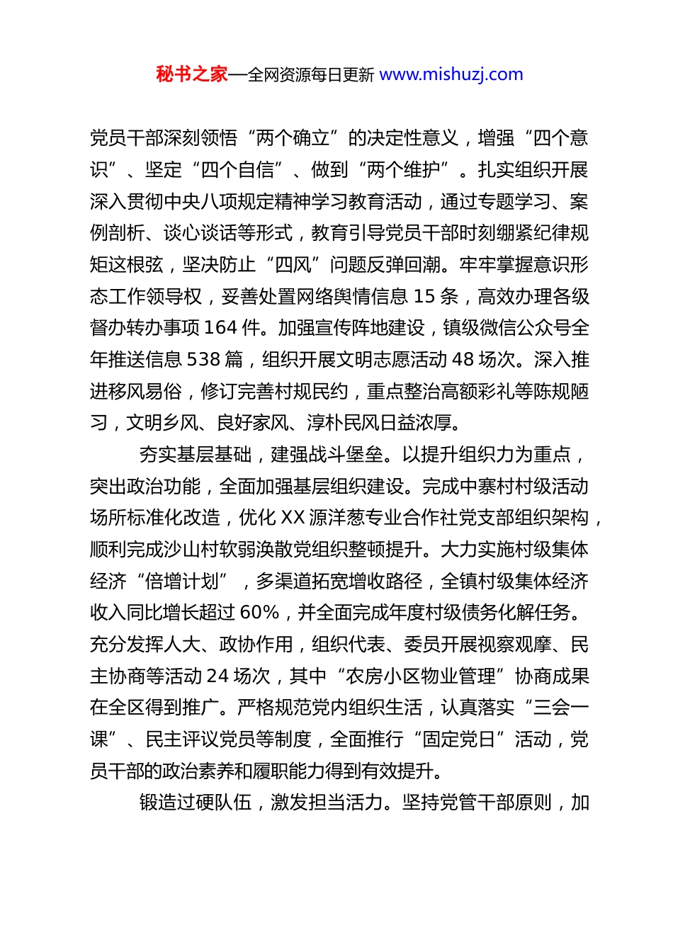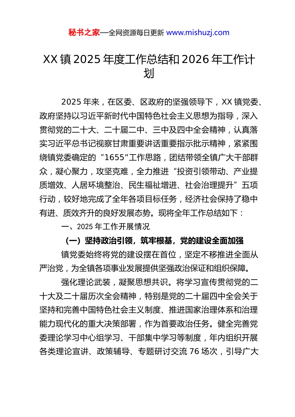 秘书之家—全网资源每日更新 www.mishuzj.comXX 镇 2025 年度工作总结和 2026 年工作计划2025 年来,在区委、区政府的坚强领导下,XX 镇党委、政府坚持以习近平新时代中国特色社会主义思想为指导,深入贯彻党的二十大、二十届二中、三中及四中全会精神,认真落实习近平总书记视察甘肃重要讲话重要指示批示精神,紧紧围绕镇党委确定的“1655”工作思路,团结带领全镇广大干部群众,凝心聚力,攻坚克难,全力推进“投资引领带动、产业提质增效、人居环境整治、民生福祉增进、社会治理提升”五项行动,较好地完成了全年各项目标任务,经济社会保持了稳中有进、质效齐升的良好发展态势。现将全年工作总结如下:一、2025 年工作开展情况(一)坚持政治引领,筑牢根基,党的建设全面加强镇党委始终将党的建设摆在首位,坚定不移推进全面从严治党,为全镇各项事业发展提供坚强政治保证和组织保障。强化理论武装,凝聚思想共识。将学习宣传贯彻党的二十大及二十届历次全会精神,特别是党的二十届四中全会关于坚持和完善中国特色社会主义制度、推进国家治理体系和治理能力现代化的重大决策部署,作为首要政治任务。健全完善党委理论学习中心组学习、干部集中学习等制度,年内组织开展各类理论宣讲、政策辅导、专题研讨交流 76 场次,引导广大秘书之家—全网资源每日更新 www.mishuzj.com党员干部深刻领悟“两个确立”的决定性意义,增强“四个意识”、坚定“四个自信”、做到“两个维护”。扎实组织开展深入贯彻中央八项规定精神学习教育活动,通过专题学习、案例剖析、谈心谈话等形式,教育引导党员干部时刻绷紧纪律规矩这根弦,坚决防止“四风”问题反弹回潮。牢牢掌握意识形态工作领导权,妥善处置网络舆情信息 15 条,高效办理各级督办转办事项 164 件。加强宣传阵地建设,镇级微信公众号全年推送信息 538 篇,组织开展文明志愿活动 48 场次。深入推进移风易俗,修订完善村规民约,重点整治高额彩礼等陈规陋习,文明乡风、良好家风、淳朴民风日益浓厚。夯实基层基础,建强战斗堡垒。以提升组织力为重点,突出政治功能,全面加强基层组织建设。完成中寨村村级活动场所标准化改造,优化 XX 源洋葱专业合作社党支部组织架构,顺利完成沙山村软弱涣散党组织整顿提升。大力实施村级集体经济“倍增计划”,多渠道拓宽增收路径,全镇村级集体经济收入同比增长超过 60%,并全面完成年度村级债务化解任务。充分发挥人大、政协作用,组织代表、委员开展视察观摩、民主协商等活动 24 场次,其中“农房小区物业管理”协商成果在全区得到推广。严格规范党内组织生活,认真落实“三会一课”、民主评议党员等制度,全面推行“固定党日”活动,党员干部的政治素养和履职能力得到有效提升。锻造过硬队伍,激发担当活力。坚持党管干部原则,加秘书之家—全网资源每日更新 www.mishuzj.com强镇村干部队伍建设。年内向区委推荐表现优秀的干部 7 名,储备具有大专以上学历的村级后备干部 14 名。严格党员发展程序,新发展预备党员 5 名,按期转正 9 名,培养入党积极分子 37 名。加强党员干部教育培训和管理监督,着力打造一支忠诚干净担当的高素质干部队伍。深化正风肃纪,涵养政治生态。严格落实全面从严治党主体责任和监督责任,持之以恒正风肃纪。年内组织召开警示教育大会 4 场次,开展廉政谈话、约谈提醒 400 余人次,镇党委班子成员讲授廉政党课 13 场次。深入开展农村党员酒驾醉驾、赌博等突出问题专项整治,严肃查处群众身边的不正之风和“微腐败”问题。扎实推进上级巡视巡察反馈意见整改落实,涉及 4 个方面的 50 项具体问题,整改完成率达到 85%,全面从严治党不断向纵深发展、向基层延伸。(二)聚焦产业升级,提质增效,发展动能持续增强紧紧围绕产业强镇目标,坚持项目为王、产业为重,着力构建现代化产业体系,发展基础更加坚实。现代农业提质增效,基础地位不断巩固。坚决扛牢粮食安全政治责任,完成粮食播种面积 6.72 万亩,小麦、玉米制种面积均超额完成目标任务。大力推进高标准农田建设,新建高标准农田 6000 亩,配套建设斗渠 28...
