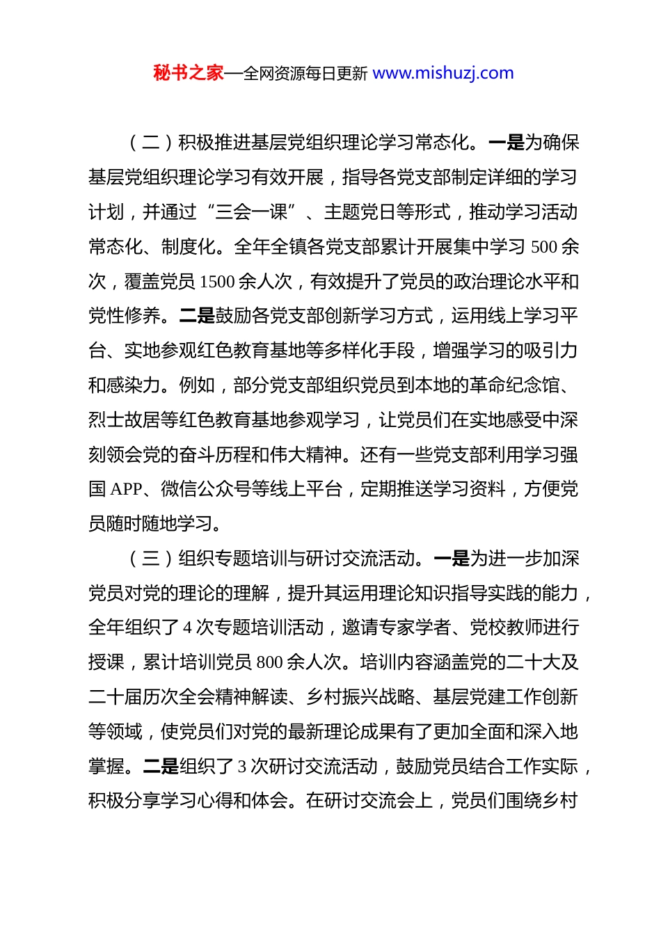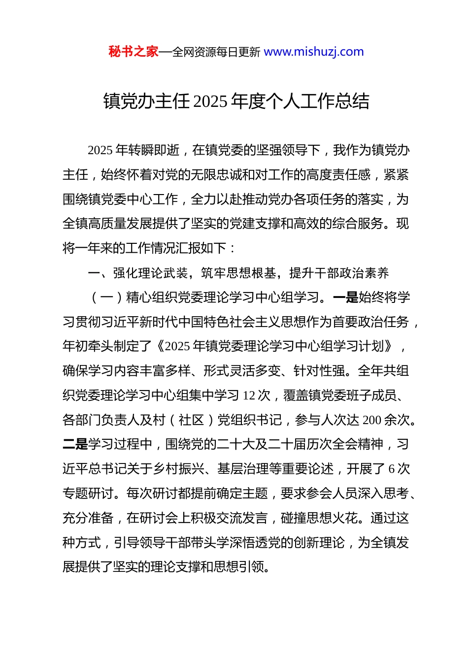 秘书之家—全网资源每日更新 www.mishuzj.com镇党办主任 2025 年度个人工作总结 2025 年转瞬即逝,在镇党委的坚强领导下,我作为镇党办主任,始终怀着对党的无限忠诚和对工作的高度责任感,紧紧围绕镇党委中心工作,全力以赴推动党办各项任务的落实,为全镇高质量发展提供了坚实的党建支撑和高效的综合服务。现将一年来的工作情况汇报如下:一、强化理论武装,筑牢思想根基,提升干部政治素养(一)精心组织党委理论学习中心组学习。一是始终将学习贯彻习近平新时代中国特色社会主义思想作为首要政治任务,年初牵头制定了《2025 年镇党委理论学习中心组学习计划》,确保学习内容丰富多样、形式灵活多变、针对性强。全年共组织党委理论学习中心组集中学习 12 次,覆盖镇党委班子成员、各部门负责人及村(社区)党组织书记,参与人次达 200 余次。二是学习过程中,围绕党的二十大及二十届历次全会精神,习近平总书记关于乡村振兴、基层治理等重要论述,开展了 6 次专题研讨。每次研讨都提前确定主题,要求参会人员深入思考、充分准备,在研讨会上积极交流发言,碰撞思想火花。通过这种方式,引导领导干部带头学深悟透党的创新理论,为全镇发展提供了坚实的理论支撑和思想引领。秘书之家—全网资源每日更新 www.mishuzj.com(二)积极推进基层党组织理论学习常态化。一是为确保基层党组织理论学习有效开展,指导各党支部制定详细的学习计划,并通过“三会一课”、主题党日等形式,推动学习活动常态化、制度化。全年全镇各党支部累计开展集中学习 500 余次,覆盖党员 1500 余人次,有效提升了党员的政治理论水平和党性修养。二是鼓励各党支部创新学习方式,运用线上学习平台、实地参观红色教育基地等多样化手段,增强学习的吸引力和感染力。例如,部分党支部组织党员到本地的革命纪念馆、烈士故居等红色教育基地参观学习,让党员们在实地感受中深刻领会党的奋斗历程和伟大精神。还有一些党支部利用学习强国 APP、微信公众号等线上平台,定期推送学习资料,方便党员随时随地学习。(三)组织专题培训与研讨交流活动。一是为进一步加深党员对党的理论的理解,提升其运用理论知识指导实践的能力,全年组织了 4 次专题培训活动,邀请专家学者、党校教师进行授课,累计培训党员 800 余人次。培训内容涵盖党的二十大及二十届历次全会精神解读、乡村振兴战略、基层党建工作创新等领域,使党员们对党的最新理论成果有了更加全面和深入地掌握。二是组织了 3 次研讨交流活动,鼓励党员结合工作实际,积极分享学习心得和体会。在研讨交流会上,党员们围绕乡村秘书之家—全网资源每日更新 www.mishuzj.com产业发展、基层治理等热点问题展开热烈讨论,提出了许多富有建设性的意见和建议。通过这些活动,有效促进了党员间的思想交流和经验分享,推动了理论学习成果的转化和应用。二、深化党建引领,夯实基层基础,增强党组织战斗力(一)推进基层党组织标准化规范化建设。一是以提升组织力为核心,大力推进基层党组织标准化规范化建设。牵头开展了党支部星级评定工作,对照“班子建设、党员管理、组织生活、作用发挥”等 8 项核心指标,对全镇 20 个村(社区)党支部进行了全面、细致的检查。二通过评定,共评选出“五星级党支部”3 个、“四星级党支部”5 个,为其他党支部树立了榜样。同时,针对评定过程中发现的薄弱环节,制定了详细的整改清单,共计 30 条,明确了整改责任人和整改时限,持续跟踪整改情况。定期对整改情况进行检查评估,对整改不力的党支部进行督促指导,推动基层党组织全面进步、全面过硬,有效提升了基层党组织的凝聚力和战斗力。(二)严格执行党员教育管理监督制度。一是在党员教育管理监督方面,坚持严格遵循党员发展程序,全年成功发展新党员 10 名,为党组织注入了新鲜血液。办理转正党员 15 名,进一步壮大了党员队伍。组织入党积极分子培训 2 期,培训人数达 50 余人,帮助入党积极分子深入学习党的基本知识和理论,秘书之家—全网资源每日更新 www.mishuzj.com端正了入党动机。二是认真落实谈心谈话制度,镇党委班子成员与...