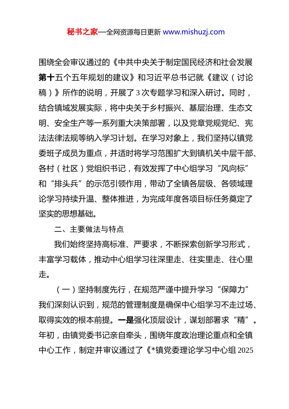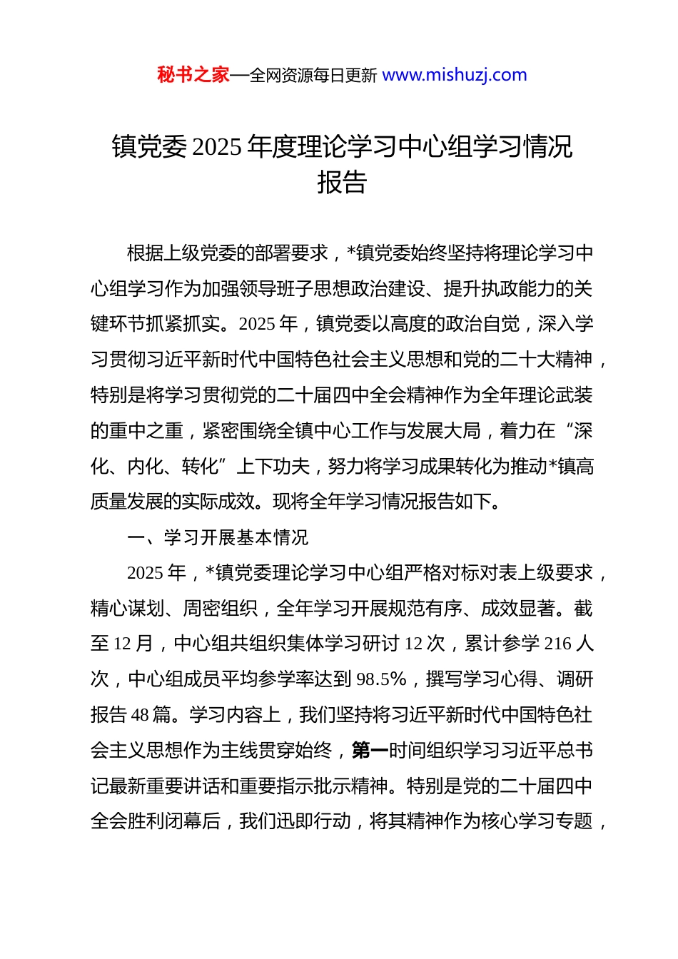 秘书之家—全网资源每日更新 www.mishuzj.com镇党委 2025 年度理论学习中心组学习情况报告 根据上级党委的部署要求,*镇党委始终坚持将理论学习中心组学习作为加强领导班子思想政治建设、提升执政能力的关键环节抓紧抓实。2025 年,镇党委以高度的政治自觉,深入学习贯彻习近平新时代中国特色社会主义思想和党的二十大精神,特别是将学习贯彻党的二十届四中全会精神作为全年理论武装的重中之重,紧密围绕全镇中心工作与发展大局,着力在“深化、内化、转化”上下功夫,努力将学习成果转化为推动*镇高质量发展的实际成效。现将全年学习情况报告如下。一、学习开展基本情况2025 年,*镇党委理论学习中心组严格对标对表上级要求,精心谋划、周密组织,全年学习开展规范有序、成效显著。截至 12 月,中心组共组织集体学习研讨 12 次,累计参学 216 人次,中心组成员平均参学率达到 98.5%,撰写学习心得、调研报告 48 篇。学习内容上,我们坚持将习近平新时代中国特色社会主义思想作为主线贯穿始终,第一时间组织学习习近平总书记最新重要讲话和重要指示批示精神。特别是党的二十届四中全会胜利闭幕后,我们迅即行动,将其精神作为核心学习专题,秘书之家—全网资源每日更新 www.mishuzj.com围绕全会审议通过的《中共中央关于制定国民经济和社会发展第十五个五年规划的建议》和习近平总书记就《建议(讨论稿)》所作的说明,开展了 3 次专题学习和深入研讨。同时,结合镇域发展实际,将中央关于乡村振兴、基层治理、生态文明、安全生产等一系列重大决策部署,以及党章党规党纪、宪法法律法规等纳入学习计划。在学习对象上,我们坚持以镇党委班子成员为重点,并适时将学习范围扩大到镇机关中层干部、各村(社区)党组织书记,有效发挥了中心组学习“风向标”和“排头兵”的示范引领作用,带动了全镇各层级、各领域理论学习持续升温、整体推进,为完成年度各项目标任务奠定了坚实的思想基础。二、主要做法与特点我们始终坚持高标准、严要求,不断探索创新学习形式,丰富学习载体,推动中心组学习往深里走、往实里走、往心里走。(一)坚持制度先行,在规范严谨中提升学习“保障力”我们深刻认识到,规范的管理制度是确保中心组学习不走过场、取得实效的根本前提。一是强化顶层设计,谋划部署求“精”。年初,由镇党委书记亲自牵头,围绕年度政治理论重点和全镇中心工作,制定并审议通过了《*镇党委理论学习中心组 2025秘书之家—全网资源每日更新 www.mishuzj.com年度学习计划》,明确了全年学习的总体要求、专题设置、时间安排和责任分工。计划制定过程中,充分征求班子成员意见,确保学习内容既紧扣“国之大者”,又紧密联系我镇发展实际。二是规范流程管理,组织运行求“严”。严格执行学习考勤、补学、档案管理等制度,每次集中学习前均制定详细方案,明确学习主题、领学人、重点发言人和研讨方向。全年学习签到记录完整,对因故缺席的成员均按规定进行了补学,确保学习全员覆盖、不留死角。三是压实主体责任,示范引领求“实”。明确镇党委书记是中心组学习第一责任人,带头审定方案、带头领学解读、带头交流发言、带头调查研究。班子成员严格落实“一岗双责”,将抓好分管领域理论学习与业务工作同部署、同检查,形成了“一把手”负总责、班子成员齐抓共管、全体成员积极参与的良好学习格局。(二)坚持内容为王,在深学细悟中把准政治“方向盘”我们始终将学习内容的政治性、理论性和时代性摆在首位,确保学习方向不偏、焦点不散。一是聚焦核心要义,在“跟进学”上保持热度。建立“第一议题”制度,对习近平总书记发表的最新重要讲话、党中央作出的最新决策部署,均在第一时间组织传达学习,深刻领会其核心要义、精神实质和实践要求。全年围绕习近平总书记在不同场合的重要讲话精神组织专题学秘书之家—全网资源每日更新 www.mishuzj.com习 5 次,确保思想与行动始终同党中央保持高度一致。二是聚焦战略蓝图,在“系统学”上拓展深度。将党的二十届四中全会精神作为年度学习的重中之重,原原本本学习全会公报、《建议》及说明,深刻理解“十五五”时期我国...