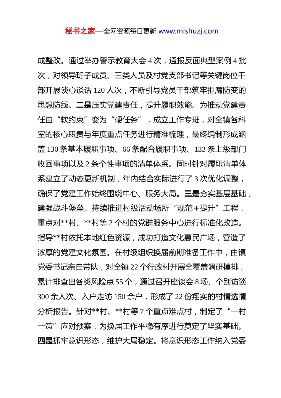 秘书之家—全网资源每日更新 www.mishuzj.com镇党委 2025 年度领导班子工作总结报告 2025 年是全面贯彻落实党的二十大精神的关键之年,是实施“十四五”规划的攻坚之年。一年来,**镇党委领导班子在县委、县政府的坚强领导下,坚持以习近平新时代中国特色社会主义思想为指导,深入学习宣传贯彻党的二十大和二十届历次全会精神,全面贯彻落实习近平总书记来陕考察重要讲话重要指示精神,紧密围绕党中央重大决策部署、省市工作要求和县委工作安排,团结带领全镇广大党员干部群众,锐意进取、攻坚克难,奋力推动全镇经济社会高质量发展取得新成效。一、2025 年主要工作成效(一)坚持思想引领党的政治建设全面加强始终将政治建设摆在首位,以理论上的清醒保证政治上的坚定。一是深化理论武装,筑牢思想根基。坚持将学习作为党委会议的第一议题,系统学习《习近平关于加强党的作风建设论述摘编》等重要理论文献,深刻领会党的二十大和二十届历次全会精神的核心要义。全年组织镇党委理论学习中心组专题学习研讨 12 次,指导各党支部开展集中学习 6 次,教育培训覆盖党员干部达 800 余人次。扎实开展深入贯彻中央八项规定精神学习教育,学查改一体推进,查摆各类问题 12 条,已全部完秘书之家—全网资源每日更新 www.mishuzj.com成整改。通过举办警示教育大会 4 次,通报反面典型案例 4 批次,对领导班子成员、三类人员及村党支部书记等关键岗位干部开展谈心谈话 120 人次,不断引导党员干部筑牢拒腐防变的思想防线。二是压实党建责任,提升履职效能。为推动党建责任由“软约束”变为“硬任务”,成立工作专班,对全镇各科室的核心职责与年度重点任务进行精准梳理,最终编制形成涵盖 130 条基本履职事项、66 条配合履职事项、133 条上级部门收回事项以及 2 条个性事项的清单体系。同时针对履职清单体系建立了动态更新机制,年内结合实际进行了 3 次优化调整,确保了党建工作始终围绕中心、服务大局。三是夯实基层基础,建强战斗堡垒。持续推进村级活动场所“规范+提升”工程,重点对**村、**村等 2 个村的党群服务中心进行标准化改造。指导**村依托本地红色资源,成功打造文化惠民广场,营造了浓厚的党建文化氛围。在村级组织换届前期准备工作中,由镇党委书记亲自带队,对全镇 22 个行政村开展全覆盖调研摸排,累计排查出各类风险点 55 个,通过召开座谈会 8 场、个别访谈300 余人次、入户走访 150 余户,形成了 22 份翔实的村情选情分析报告。针对**村、**村等 7 个重点难点村,制定了“一村一策”应对预案,为换届工作平稳有序进行奠定了坚实基础。四是抓牢意识形态,维护大局稳定。将意识形态工作纳入党委秘书之家—全网资源每日更新 www.mishuzj.com重要议事日程和党建工作考核范畴,与业务工作同部署、同落实。对全镇 22 个村的民间信仰场所开展常态化消防安全巡查,并完成了对**教会的深入调研,协助其设立对公账户并顺利完成换届,有效防范化解了统战和意识形态领域的风险隐患。(二)聚焦高质量发展经济实力稳步提升领导班子深刻领会习近平总书记来陕考察时关于推动经济高质量发展的重要指示精神将其作为谋划项目、推动发展的根本遵循,全力以赴抓项目、强产业、增后劲。一是重大项目建设取得突破。全年成功争跑并完成了投资 215 万元的革命老区项目——**村至**村道路建设工程。利用中央彩票专项公益金231 万元,建成了**寺至**交道路。争取市级财政投入 56 万元,对**村主街道进行了全面改造升级。总投资额巨大的 150MW光伏发电项目和 208MW 风电项目**片区工程已顺利竣工。**村的实体蛋鸡养殖项目也已完成统计入库,成为乡域经济新的增长点。二是特色产业发展提质增效。在**村、**村等 7 个村新发展连翘种植 3100 亩,并于**村配套建设了连翘烘干房,初步形成“种植+加工”的产业链条。在**村发展红薯种植 100亩,制作菌棒 12.45 万棒,并创新性地打造助农直播间,有效拓宽了农产品线上销售渠道。在**村,通过配合风光电项目流转土地 200 亩,发展中药材种植 500 亩,预计每年可为村集体秘书之家—全网资...