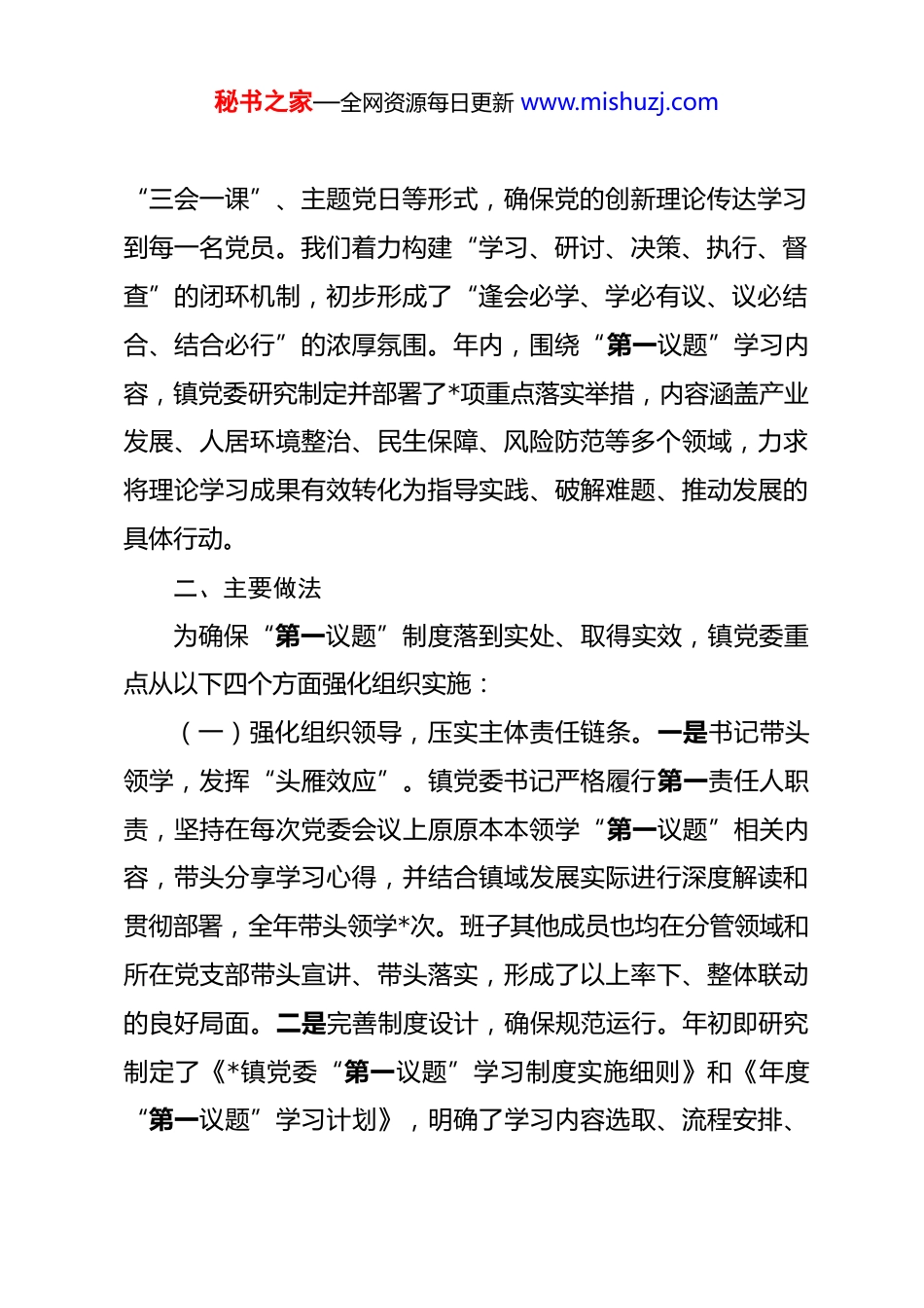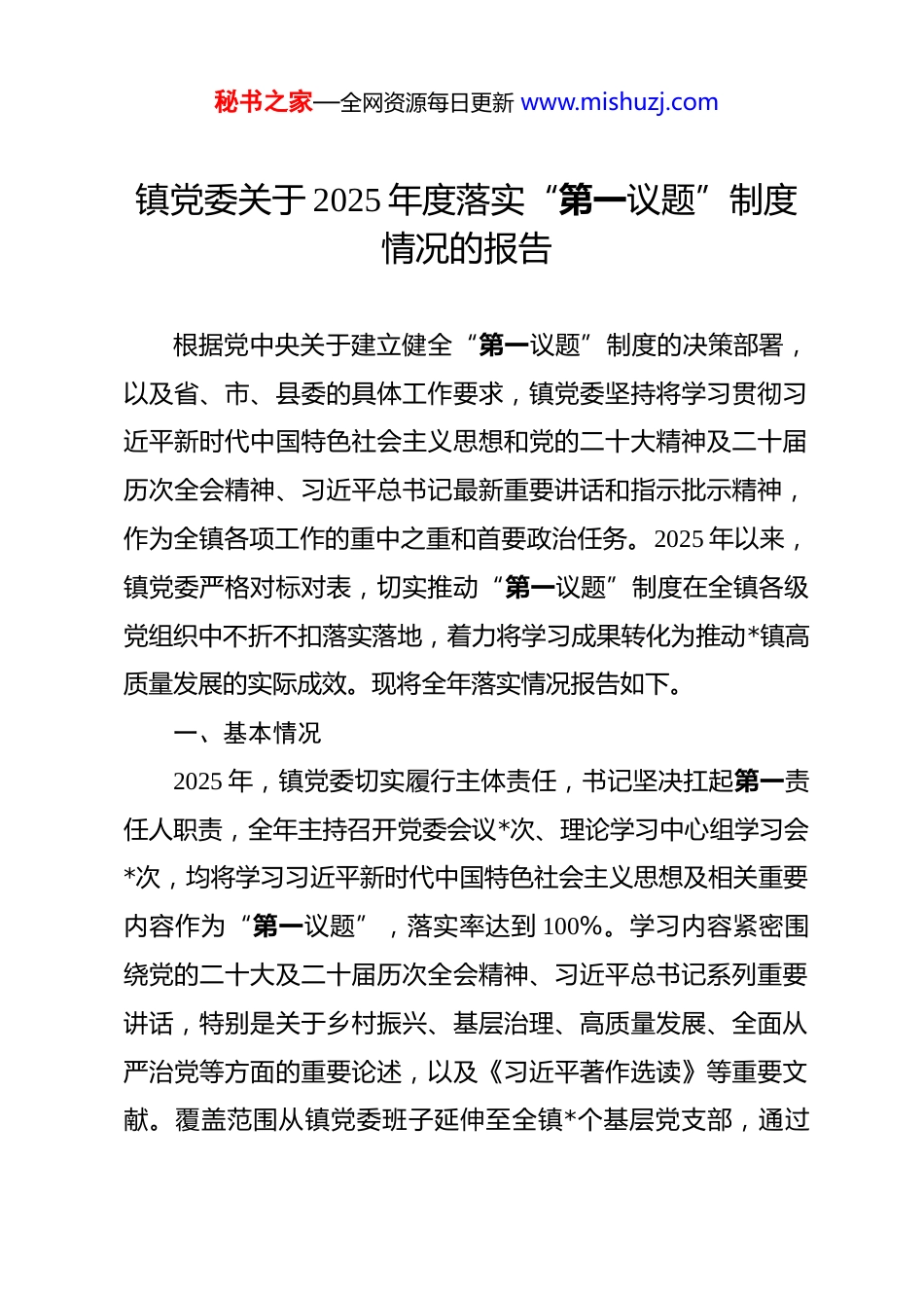秘书之家—全网资源每日更新 www.mishuzj.com镇党委关于 2025 年度落实“第一议题”制度情况的报告 根据党中央关于建立健全“第一议题”制度的决策部署,以及省、市、县委的具体工作要求,镇党委坚持将学习贯彻习近平新时代中国特色社会主义思想和党的二十大精神及二十届历次全会精神、习近平总书记最新重要讲话和指示批示精神,作为全镇各项工作的重中之重和首要政治任务。2025 年以来,镇党委严格对标对表,切实推动“第一议题”制度在全镇各级党组织中不折不扣落实落地,着力将学习成果转化为推动*镇高质量发展的实际成效。现将全年落实情况报告如下。一、基本情况2025 年,镇党委切实履行主体责任,书记坚决扛起第一责任人职责,全年主持召开党委会议*次、理论学习中心组学习会*次,均将学习习近平新时代中国特色社会主义思想及相关重要内容作为“第一议题”,落实率达到 100%。学习内容紧密围绕党的二十大及二十届历次全会精神、习近平总书记系列重要讲话,特别是关于乡村振兴、基层治理、高质量发展、全面从严治党等方面的重要论述,以及《习近平著作选读》等重要文献。覆盖范围从镇党委班子延伸至全镇*个基层党支部,通过秘书之家—全网资源每日更新 www.mishuzj.com“三会一课”、主题党日等形式,确保党的创新理论传达学习到每一名党员。我们着力构建“学习、研讨、决策、执行、督查”的闭环机制,初步形成了“逢会必学、学必有议、议必结合、结合必行”的浓厚氛围。年内,围绕“第一议题”学习内容,镇党委研究制定并部署了*项重点落实举措,内容涵盖产业发展、人居环境整治、民生保障、风险防范等多个领域,力求将理论学习成果有效转化为指导实践、破解难题、推动发展的具体行动。二、主要做法为确保“第一议题”制度落到实处、取得实效,镇党委重点从以下四个方面强化组织实施:(一)强化组织领导,压实主体责任链条。一是书记带头领学,发挥“头雁效应”。镇党委书记严格履行第一责任人职责,坚持在每次党委会议上原原本本领学“第一议题”相关内容,带头分享学习心得,并结合镇域发展实际进行深度解读和贯彻部署,全年带头领学*次。班子其他成员也均在分管领域和所在党支部带头宣讲、带头落实,形成了以上率下、整体联动的良好局面。二是完善制度设计,确保规范运行。年初即研究制定了《*镇党委“第一议题”学习制度实施细则》和《年度“第一议题”学习计划》,明确了学习内容选取、流程安排、秘书之家—全网资源每日更新 www.mishuzj.com研讨要求、成果转化等各环节标准。制度规定,会前须提前*天发放学习资料,会后*个工作日内形成贯彻落实意见清单,确保了学习的计划性、严肃性和实效性。三是构建责任体系,推动压力传导。将“第一议题”制度落实情况纳入各村(社区)党支部书记抓基层党建述职评议考核和年度绩效考核的核心指标,权重占比不低于*%。建立班子成员分片包干督导机制,每季度至少深入联系点督导检查*次,对落实不力、流于形式的进行约谈提醒,确保制度压力传导至“神经末梢”。(二)深化学习机制,提升领悟践行精度。一是坚持及时跟进,确保学习时效。建立由镇党政办牵头,专人负责的“第一议题”内容动态筛选机制,密切关注《求是》杂志、共产党员网等权威平台,对习近平总书记最新重要讲话、重要文章、重要指示批示,做到第一时间收集、第一时间纳入学习计划、第一时间组织传达。年内,共及时跟进学习党中央最新决策部署和习近平总书记最新指示精神*项。二是创新形式载体,增强学习引力。坚决摒弃“一念了之”的简单模式,积极探索“领学+研讨”、“原文学习+案例分析”、“理论学习+实地调研”等多种形式。年内组织专题研讨*场,赴红色教育基地、产业示范点开展现场教学*次,利用“学习强国”等平台组织线上测试*次,参与党员达**人次,有效提升了学习的吸引力和感染秘书之家—全网资源每日更新 www.mishuzj.com力。三是聚焦关键少数,抓实中心组学习。将党委理论学习中心组作为深化“第一议题”学习的重要平台,每年举办习近平新时代中国特色社会主义思想读书班。严格执行中心组学习规则,要求中心组成员每年至少撰写高质量学习心得*...