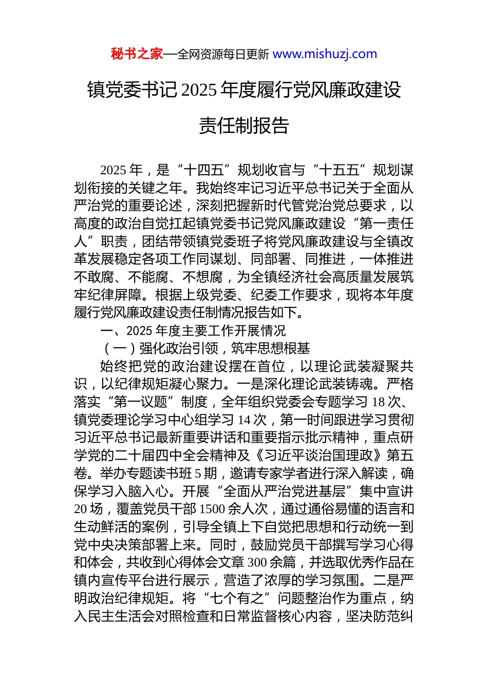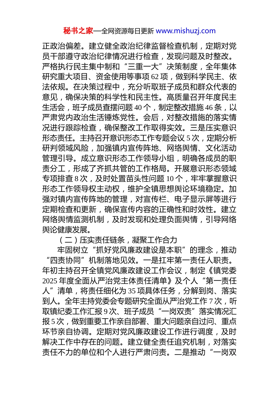 秘书之家—全网资源每日更新 www.mishuzj.com镇党委书记 2025 年度履行党风廉政建设责任制报告2025 年,是“十四五”规划收官与“十五五”规划谋划衔接的关键之年。我始终牢记习近平总书记关于全面从严治党的重要论述,深刻把握新时代管党治党总要求,以高度的政治自觉扛起镇党委书记党风廉政建设“第一责任人”职责,团结带领镇党委班子将党风廉政建设与全镇改革发展稳定各项工作同谋划、同部署、同推进,一体推进不敢腐、不能腐、不想腐,为全镇经济社会高质量发展筑牢纪律屏障。根据上级党委、纪委工作要求,现将本年度履行党风廉政建设责任制情况报告如下。一、2025 年度主要工作开展情况(一)强化政治引领,筑牢思想根基始终把党的政治建设摆在首位,以理论武装凝聚共识,以纪律规矩凝心聚力。一是深化理论武装铸魂。严格落实“第一议题”制度,全年组织党委会专题学习 18 次、镇党委理论学习中心组学习 14 次,第一时间跟进学习贯彻习近平总书记最新重要讲话和重要指示批示精神,重点研学党的二十届四中全会精神及《习近平谈治国理政》第五卷。举办专题读书班 5 期,邀请专家学者进行深入解读,确保学习入脑入心。开展“全面从严治党进基层”集中宣讲20 场,覆盖党员干部 1500 余人次,通过通俗易懂的语言和生动鲜活的案例,引导全镇上下自觉把思想和行动统一到党中央决策部署上来。同时,鼓励党员干部撰写学习心得和体会,共收到心得体会文章 300 余篇,并选取优秀作品在镇内宣传平台进行展示,营造了浓厚的学习氛围。二是严明政治纪律规矩。将“七个有之”问题整治作为重点,纳入民主生活会对照检查和日常监督核心内容,坚决防范纠秘书之家—全网资源每日更新 www.mishuzj.com正政治偏差。建立健全政治纪律监督检查机制,定期对党员干部遵守政治纪律情况进行检查,发现问题及时整改。严格执行民主集中制和“三重一大”决策制度,全年集体研究重大项目、资金使用等事项 62 项,做到科学民主、依法依规。在决策过程中,充分听取班子成员和群众代表的意见,确保决策的科学性和民主性。高质量召开年度民主生活会,班子成员查摆问题 40 个,制定整改措施 46 条,以严肃党内政治生活锤炼党性。会后,对整改措施的落实情况进行跟踪检查,确保整改工作取得实效。三是压实意识形态责任。主持召开意识形态工作专题会议 5 次,定期分析研判领域风险,加强镇内宣传阵地、网络舆情、文化活动管理引导。成立意识形态工作领导小组,明确各成员的职责分工,形成了齐抓共管的工作格局。开展意识形态领域专项排查 8 次,及时处置苗头性问题 10 个,牢牢掌握意识形态工作领导权主动权,维护全镇思想舆论环境稳定。加强对镇内宣传阵地的管理,对宣传栏、电子显示屏等进行定期检查和更新,确保宣传内容的正确性和时效性。建立网络舆情监测机制,及时发现和处理负面舆情,引导网络舆论健康发展。(二)压实责任链条,凝聚工作合力牢固树立“抓好党风廉政建设是本职”的理念,推动“四责协同”机制落地见效。一是扛牢第一责任人职责。年初主持召开全镇党风廉政建设工作会议,制定《镇党委2025 年度全面从严治党主体责任清单》及个人“第一责任人”清单,将责任细化为 35 项具体任务,分解到岗、落实到人。全年主持党委会专题研究全面从严治党工作 7 次,听取镇纪委工作汇报 9 次、班子成员“一岗双责”落实情况汇报 5 次,做到重要工作亲自部署、重大问题亲自过问、重点环节亲自协调。定期对党风廉政建设工作进行调度,及时解决工作中存在的问题。建立健全责任追究机制,对落实责任不力的单位和个人进行严肃问责。二是推动“一岗双秘书之家—全网资源每日更新 www.mishuzj.com责”落实。督促班子成员对照责任清单,既抓业务工作,又抓分管领域党风廉政建设。全年与班子成员、村(社区)及镇直单位“一把手”开展监督谈话、廉政谈话 80 人次,对存在苗头性问题的 26 名干部进行提醒谈话。组织 18名村(社区)和镇直单位党组织负责人述责述廉并接受民主评议,层层传导压力。建立廉政档案,对干部的廉政情况进行动态管理。加强对干部的日常监督,发现问...