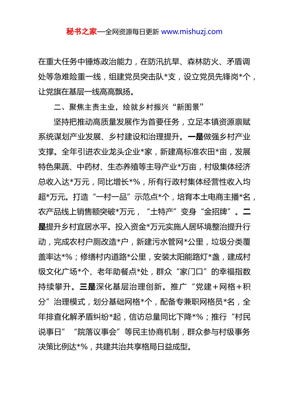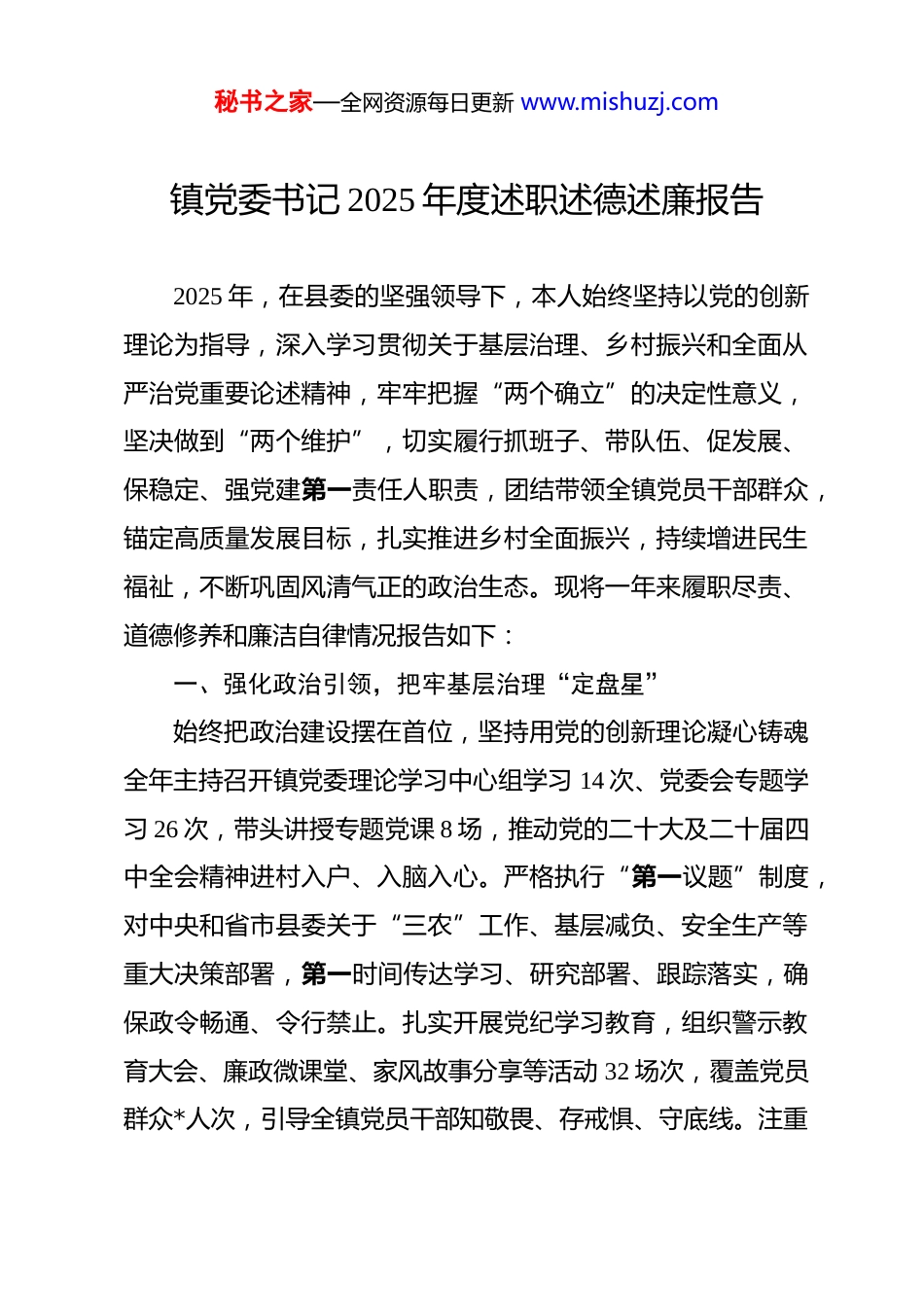 秘书之家—全网资源每日更新 www.mishuzj.com镇党委书记 2025 年度述职述德述廉报告 2025 年,在县委的坚强领导下,本人始终坚持以党的创新理论为指导,深入学习贯彻关于基层治理、乡村振兴和全面从严治党重要论述精神,牢牢把握“两个确立”的决定性意义,坚决做到“两个维护”,切实履行抓班子、带队伍、促发展、保稳定、强党建第一责任人职责,团结带领全镇党员干部群众,锚定高质量发展目标,扎实推进乡村全面振兴,持续增进民生福祉,不断巩固风清气正的政治生态。现将一年来履职尽责、道德修养和廉洁自律情况报告如下:一、强化政治引领,把牢基层治理“定盘星”始终把政治建设摆在首位,坚持用党的创新理论凝心铸魂全年主持召开镇党委理论学习中心组学习 14 次、党委会专题学习 26 次,带头讲授专题党课 8 场,推动党的二十大及二十届四中全会精神进村入户、入脑入心。严格执行“第一议题”制度,对中央和省市县委关于“三农”工作、基层减负、安全生产等重大决策部署,第一时间传达学习、研究部署、跟踪落实,确保政令畅通、令行禁止。扎实开展党纪学习教育,组织警示教育大会、廉政微课堂、家风故事分享等活动 32 场次,覆盖党员群众*人次,引导全镇党员干部知敬畏、存戒惧、守底线。注重秘书之家—全网资源每日更新 www.mishuzj.com在重大任务中锤炼政治能力,在防汛抗旱、森林防火、矛盾调处等急难险重一线,组建党员突击队*支,设立党员先锋岗*个,让党旗在基层一线高高飘扬。二、聚焦主责主业,绘就乡村振兴“新图景”坚持把推动高质量发展作为首要任务,立足本镇资源禀赋系统谋划产业发展、乡村建设和治理提升。一是做强乡村产业支撑。全年引进农业龙头企业*家,新建高标准农田*亩,发展特色果蔬、中药材、生态养殖等主导产业*万亩,村级集体经济总收入达*万元,同比增长*%,所有行政村集体经营性收入均超*万元。打造“一村一品”示范点*个,培育本土电商主播*名,农产品线上销售额突破*万元,“土特产”变身“金招牌”。二是提升乡村宜居水平。投入资金*万元实施人居环境整治提升行动,完成农村户厕改造*户,新建污水管网*公里,垃圾分类覆盖率达*%;修缮村内道路*公里,安装太阳能路灯*盏,建成村级文化广场*个、老年助餐点*处,群众“家门口”的幸福指数持续攀升。三是深化基层治理创新。推广“党建+网格+积分”治理模式,划分基础网格*个,配备专兼职网格员*名,全年排查化解矛盾纠纷*起,信访总量同比下降*%;推行“村民说事日”“院落议事会”等民主协商机制,群众参与村级事务决策比例达*%,共建共治共享格局日益成型。秘书之家—全网资源每日更新 www.mishuzj.com三、厚植为民情怀,办好群众关切“暖心事”始终站稳人民立场,把群众急难愁盼作为工作的出发点和落脚点。一是兜牢基本民生底线。动态监测脱贫不稳定户、边缘易致贫户*户*人,落实产业帮扶、公益性岗位等措施*项,守住了不发生规模性返贫的底线。发放低保、特困、临时救助等资金*万元,惠及困难群众*人次;完成适老化改造*户,新建村级卫生室*个,家庭医生签约服务覆盖率达*%。二是优化公共服务供给。协调争取项目资金*万元,完成镇中心小学教学楼改扩建,新增学位*个;推动镇卫生院与县医院建立远程诊疗协作,群众常见病、慢性病实现“小病不出镇”。三是畅通民意反馈渠道。常态化开展“民情恳谈”“敲门行动”,全年走访群众*户,收集意见建议*条,办结率*%;针对群众反映强烈的灌溉用水难问题,协调实施小型水利设施维修工程*处,保障了*亩农田春耕生产用水,赢得群众广泛好评。四、夯实组织根基,锻造坚强有力“主心骨”牢固树立大抓基层鲜明导向,推动基层党组织全面进步、全面过硬。一是建强战斗堡垒。顺利完成*个村(社区)“两委”届中分析研判,调整不胜任村干部*名;新建产业链党支部*个、流动党员党支部*个,整顿软弱涣散党组织*个,基层党组织按期换届率、组织覆盖率均达 100%。深化“双培双带”工秘书之家—全网资源每日更新 www.mishuzj.com程,全年发展 35 岁以下年轻党员*名,其中致富能手、返乡大学生占比*%。二是激发队伍活力。实施“头雁领航·群雁齐飞”...