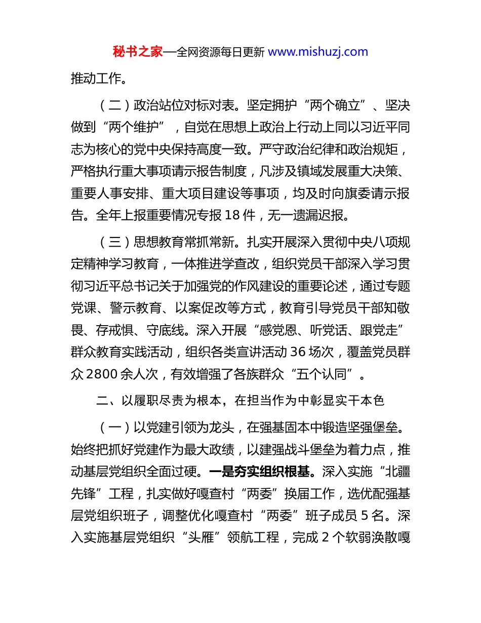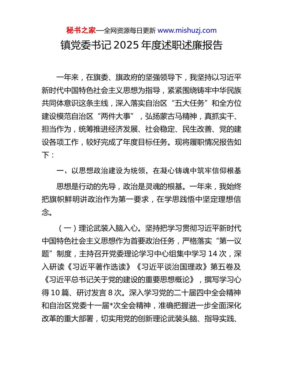 秘书之家—全网资源每日更新 www.mishuzj.com镇党委书记 2025 年度述职述廉报告一年来,在旗委、旗政府的坚强领导下,我坚持以习近平新时代中国特色社会主义思想为指导,紧紧围绕铸牢中华民族共同体意识这条主线,深入落实自治区“五大任务”和全方位建设模范自治区“两件大事”,弘扬蒙古马精神,真抓实干、担当作为,统筹推进经济发展、社会稳定、民生改善、党的建设各项工作,较好完成了年度目标任务。现将履职情况报告如下:一、以思想政治建设为统领,在凝心铸魂中筑牢信仰根基思想是行动的先导,政治是灵魂的根基。一年来,我始终把旗帜鲜明讲政治作为第一要求,在学思践悟中坚定理想信念。(一)理论武装入脑入心。坚持把学习贯彻习近平新时代中国特色社会主义思想作为首要政治任务,严格落实“第一议题”制度,主持召开党委理论学习中心组集中学习 14 次,深入研读《习近平著作选读》《习近平谈治国理政》第五卷及《习近平总书记关于党的建设的重要思想概论》,撰写学习心得 10 篇、研讨发言 8 次。深入学习党的二十届四中全会精神和自治区党委十一届*次全会精神,准确把握进一步全面深化改革的重大部署,切实用党的创新理论武装头脑、指导实践、秘书之家—全网资源每日更新 www.mishuzj.com推动工作。(二)政治站位对标对表。坚定拥护“两个确立”、坚决做到“两个维护”,自觉在思想上政治上行动上同以习近平同志为核心的党中央保持高度一致。严守政治纪律和政治规矩,严格执行重大事项请示报告制度,凡涉及镇域发展重大决策、重要人事安排、重大项目建设等事项,均及时向旗委请示报告。全年上报重要情况专报 18 件,无一遗漏迟报。(三)思想教育常抓常新。扎实开展深入贯彻中央八项规定精神学习教育,一体推进学查改,组织党员干部深入学习贯彻习近平总书记关于加强党的作风建设的重要论述,通过专题党课、警示教育、以案促改等方式,教育引导党员干部知敬畏、存戒惧、守底线。深入开展“感党恩、听党话、跟党走”群众教育实践活动,组织各类宣讲活动 36 场次,覆盖党员群众 2800 余人次,有效增强了各族群众“五个认同”。二、以履职尽责为根本,在担当作为中彰显实干本色(一)以党建引领为龙头,在强基固本中锻造坚强堡垒。始终把抓好党建作为最大政绩,以建强战斗堡垒为着力点,推动基层党组织全面过硬。一是夯实组织根基。深入实施“北疆先锋”工程,扎实做好嘎查村“两委”换届工作,选优配强基层党组织班子,调整优化嘎查村“两委”班子成员 5 名。深入实施基层党组织“头雁”领航工程,完成 2 个软弱涣散嘎秘书之家—全网资源每日更新 www.mishuzj.com查村整顿提升,党组织战斗力明显增强。规范落实“三会一课”、主题党日等制度,党支部标准化规范化水平持续提升。二是建强骨干队伍。选优配强驻村第一书记 3 名、驻村工作队员 6 名,实现帮扶力量全覆盖。深入实施村级后备干部“育苗计划”,储备后备力量 22 名,培养入党积极分子 28名,发展党员 10 名。组织嘎查村干部参加旗级培训 5 期、镇级培训 8 期,累计培训 260 人次,基层干部履职能力明显提升。三是创新党建载体。探索推行“党建+网格+服务”模式,将全镇划分为 32 个网格,配备网格员 64 名,实现党建引领基层治理精细化。打造党建示范点 3 个,创建自治区级“六有”示范嘎查村 2 个。深化“党群服务中心”功能建设,推行“一站式”便民服务,全年办理群众事项 2100 件,群众满意率达 99.2%。(二)以产业振兴为引擎,在兴业富民中厚植发展根基。紧紧围绕自治区“加快建设国家重要农畜产品生产基地”战略定位,因地制宜推动产业发展提质增效。一是稳固农牧业基本盘。严守耕地保护红线,完成高标准农田建设 1.5 万亩,打造“吨粮田”示范区 2000 亩,粮食播种面积稳定在 9.2 万亩,粮食产量达到 4600 万斤。深入实施畜牧业“单产提升工程”,新建标准化舍饲棚圈 2.2 万平方米,推广良种肉牛冻精配种 1200 头,牲畜年度出栏量达到 6.8 万头只。二是培育特色优势产业。依托资源禀赋,大力发展“一村一品”,培育壮秘书之家—全网资源...