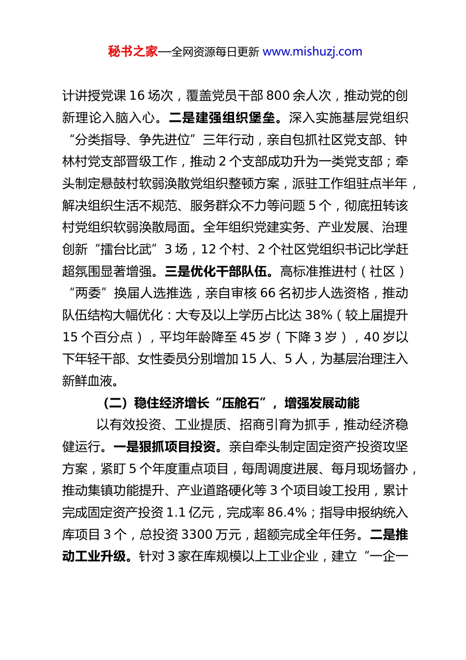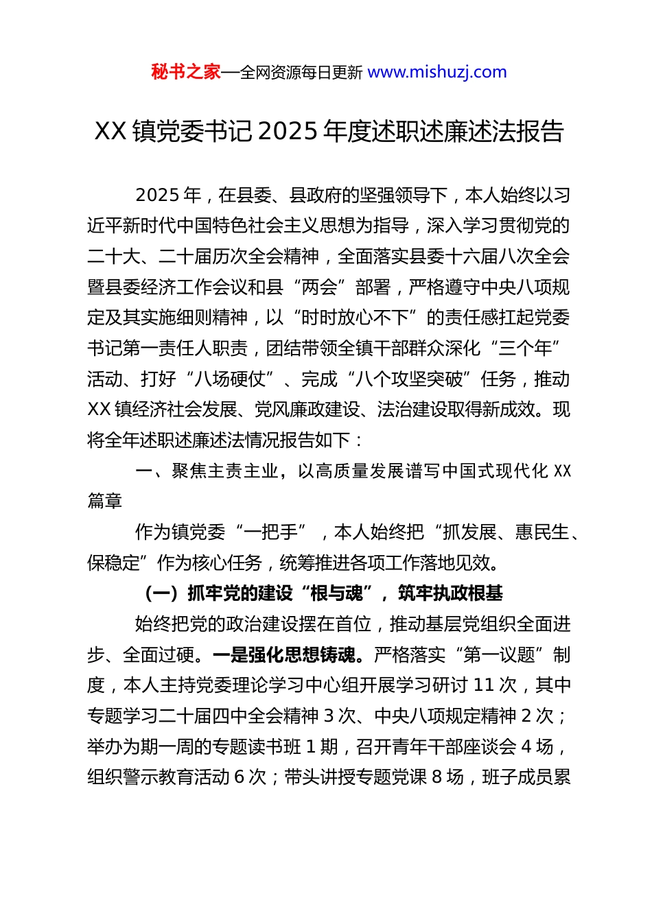 秘书之家—全网资源每日更新 www.mishuzj.comXX 镇党委书记 2025 年度述职述廉述法报告2025 年,在县委、县政府的坚强领导下,本人始终以习近平新时代中国特色社会主义思想为指导,深入学习贯彻党的二十大、二十届历次全会精神,全面落实县委十六届八次全会暨县委经济工作会议和县“两会”部署,严格遵守中央八项规定及其实施细则精神,以“时时放心不下”的责任感扛起党委书记第一责任人职责,团结带领全镇干部群众深化“三个年”活动、打好“八场硬仗”、完成“八个攻坚突破”任务,推动XX 镇经济社会发展、党风廉政建设、法治建设取得新成效。现将全年述职述廉述法情况报告如下:一、聚焦主责主业,以高质量发展谱写中国式现代化 XX篇章作为镇党委“一把手”,本人始终把“抓发展、惠民生、保稳定”作为核心任务,统筹推进各项工作落地见效。(一)抓牢党的建设“根与魂”,筑牢执政根基始终把党的政治建设摆在首位,推动基层党组织全面进步、全面过硬。一是强化思想铸魂。严格落实“第一议题”制度,本人主持党委理论学习中心组开展学习研讨 11 次,其中专题学习二十届四中全会精神 3 次、中央八项规定精神 2 次;举办为期一周的专题读书班 1 期,召开青年干部座谈会 4 场,组织警示教育活动 6 次;带头讲授专题党课 8 场,班子成员累秘书之家—全网资源每日更新 www.mishuzj.com计讲授党课 16 场次,覆盖党员干部 800 余人次,推动党的创新理论入脑入心。二是建强组织堡垒。深入实施基层党组织“分类指导、争先进位”三年行动,亲自包抓社区党支部、钟林村党支部晋级工作,推动 2 个支部成功升为一类党支部;牵头制定悬鼓村软弱涣散党组织整顿方案,派驻工作组驻点半年,解决组织生活不规范、服务群众不力等问题 5 个,彻底扭转该村党组织软弱涣散局面。全年组织党建实务、产业发展、治理创新“擂台比武”3 场,12 个村、2 个社区党组织书记比学赶超氛围显著增强。三是优化干部队伍。高标准推进村(社区)“两委”换届人选推选,亲自审核 66 名初步人选资格,推动队伍结构大幅优化:大专及以上学历占比达 38%(较上届提升15 个百分点),平均年龄降至 45 岁(下降 3 岁),40 岁以下年轻干部、女性委员分别增加 15 人、5 人,为基层治理注入新鲜血液。(二)稳住经济增长“压舱石”,增强发展动能以有效投资、工业提质、招商引育为抓手,推动经济稳健运行。一是狠抓项目投资。亲自牵头制定固定资产投资攻坚方案,紧盯 5 个年度重点项目,每周调度进展、每月现场督办,推动集镇功能提升、产业道路硬化等 3 个项目竣工投用,累计完成固定资产投资 1.1 亿元,完成率 86.4%;指导申报纳统入库项目 3 个,总投资 3300 万元,超额完成全年任务。二是推动工业升级。针对 3 家在库规模以上工业企业,建立“一企一秘书之家—全网资源每日更新 www.mishuzj.com策”帮扶机制,本人带队走访企业 12 次,协调解决原材料运输、产品销路等问题 7 个。2025 年 1-11 月,3 家企业实现工业产值 7750.8 万元,同比增长 21%,增速位居全县前列,实体经济支撑作用持续巩固。三是激发市场活力。坚持“招商引资+内生培育”双轮驱动,本人牵头策划包装重点招商项目 10个,带队赴外招商 6 次,成功签约落地项目 3 个,实际使用内资 3912 万元,完成年度任务的 112%;培育新增“五上”企业 1 家、限额以上贸易个体户 2 家。深入开展“助企暖企”行动,组织镇村干部走访经营主体 120 余家,协调银行解决小微企业融资需求 1243.5 万元,为 38 家经营主体兑现惠企资金507.5 万元,营商环境满意度达 98%。(三)打造产业融合“新引擎”,拓宽增收渠道深耕富硒茶首位产业,推动农旅融合、三产联动。一是守牢粮食安全底线。坚决扛起粮食安全政治责任,本人牵头落实耕地保护制度,组织开展撂荒耕地整治 2 次,稳定粮食播种面积 3.62 万亩;推广良种良法 12 项,组织农技人员下田指导80 余次,全年粮食总产量达 6418 吨,超额完成县级任务。二是壮大特色产业集群。以富硒茶为核心,实施茶园标准化管护6500...