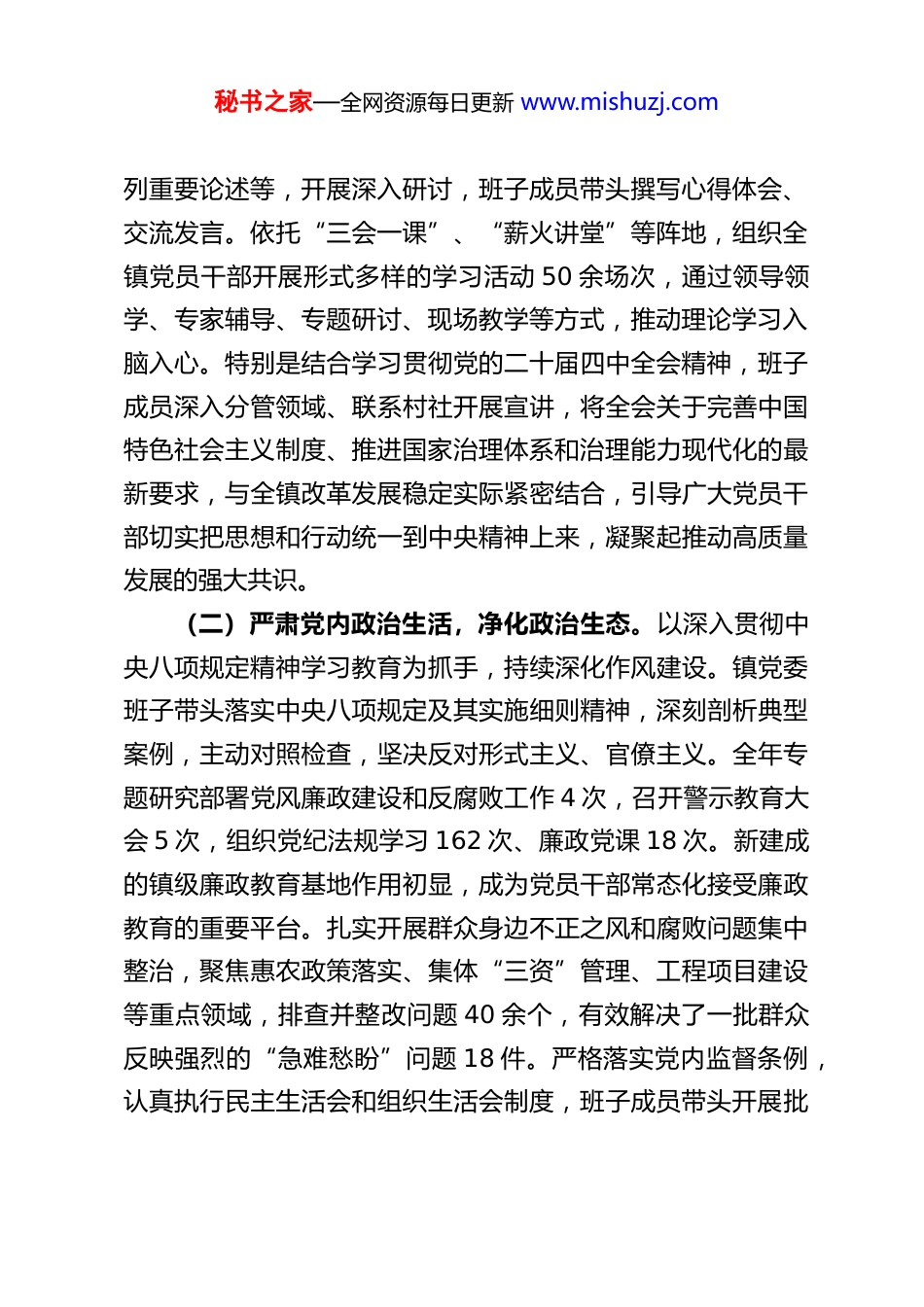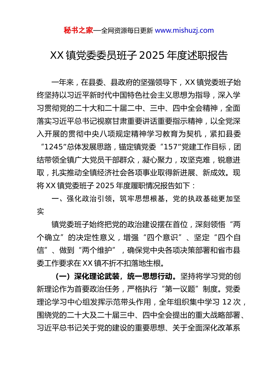 秘书之家—全网资源每日更新 www.mishuzj.comXX 镇党委委员班子 2025 年度述职报告一年来,在县委、县政府的坚强领导下,XX 镇党委班子始终坚持以习近平新时代中国特色社会主义思想为指导,深入学习贯彻党的二十大和二十届二中、三中、四中全会精神,全面落实习近平总书记视察甘肃重要讲话重要指示精神,以全党深入开展的贯彻中央八项规定精神学习教育为契机,紧扣县委“1245”总体发展思路,锚定镇党委“157”党建工作目标,团结带领全镇广大党员干部群众,凝心聚力,攻坚克难,锐意进取,扎实推动全镇经济社会各项事业取得新进展、新成效。现将 XX 镇党委班子 2025 年度履职情况报告如下:一、强化政治引领,筑牢思想根基,党的执政基础更加坚实镇党委班子始终把党的政治建设摆在首位,深刻领悟“两个确立”的决定性意义,增强“四个意识”、坚定“四个自信”、做到“两个维护”,确保党中央各项决策部署和省市县委工作要求在 XX 镇不折不扣落地生根。(一)深化理论武装,统一思想行动。坚持将学习党的创新理论作为首要政治任务,严格执行“第一议题”制度。党委理论学习中心组发挥示范带头作用,全年组织集中学习 12 次,围绕党的二十大及二十届三中、四中全会提出的重大战略部署、习近平总书记关于党的建设的重要思想、关于全面深化改革系秘书之家—全网资源每日更新 www.mishuzj.com列重要论述等,开展深入研讨,班子成员带头撰写心得体会、交流发言。依托“三会一课”、“薪火讲堂”等阵地,组织全镇党员干部开展形式多样的学习活动 50 余场次,通过领导领学、专家辅导、专题研讨、现场教学等方式,推动理论学习入脑入心。特别是结合学习贯彻党的二十届四中全会精神,班子成员深入分管领域、联系村社开展宣讲,将全会关于完善中国特色社会主义制度、推进国家治理体系和治理能力现代化的最新要求,与全镇改革发展稳定实际紧密结合,引导广大党员干部切实把思想和行动统一到中央精神上来,凝聚起推动高质量发展的强大共识。(二)严肃党内政治生活,净化政治生态。以深入贯彻中央八项规定精神学习教育为抓手,持续深化作风建设。镇党委班子带头落实中央八项规定及其实施细则精神,深刻剖析典型案例,主动对照检查,坚决反对形式主义、官僚主义。全年专题研究部署党风廉政建设和反腐败工作 4 次,召开警示教育大会 5 次,组织党纪法规学习 162 次、廉政党课 18 次。新建成的镇级廉政教育基地作用初显,成为党员干部常态化接受廉政教育的重要平台。扎实开展群众身边不正之风和腐败问题集中整治,聚焦惠农政策落实、集体“三资”管理、工程项目建设等重点领域,排查并整改问题 40 余个,有效解决了一批群众反映强烈的“急难愁盼”问题 18 件。严格落实党内监督条例,认真执行民主生活会和组织生活会制度,班子成员带头开展批秘书之家—全网资源每日更新 www.mishuzj.com评与自我批评,自觉接受组织和群众监督,推动党内政治生活更加严肃规范。(三)夯实基层基础,建强战斗堡垒。牢固树立大抓基层的鲜明导向,持续用力抓基层、打基础。严格落实党建联系点制度,班子成员定期深入各村(社)指导工作,对 14 个村党组织实行分类指导、精准施策,顺利完成软弱涣散党组织整顿提升。优化升级村级党群服务中心功能,使其真正成为服务党员群众的主阵地。加强村干部队伍建设,从严落实值班坐班等管理制度,完成专职化村党组织书记招录和后备干部储备工作。严格党员发展程序,优化党员队伍结构,分层分类开展党员教育培训实现全覆盖,加强流动党员管理。健全乡土人才培养、联系、服务机制,为乡村振兴提供人才支撑。着力打造“薪火工程”党建品牌体系,深入挖掘龙洞村红色资源,打造“薪火龙洞”教育基地,将政治建设、组织建设、队伍建设、产业发展、基层治理、服务群众等关键领域有机融合,努力形成可复制、可推广的基层党建“XX 经验”,切实把党的组织优势转化为发展优势。二、聚焦安全稳定,深化主动创稳,社会治理效能显著提升镇党委班子坚决扛起维护安全稳定的政治责任,坚持和发展新时代“枫桥经验”,深入推进主动创稳行动,努力建设更高水平的...
