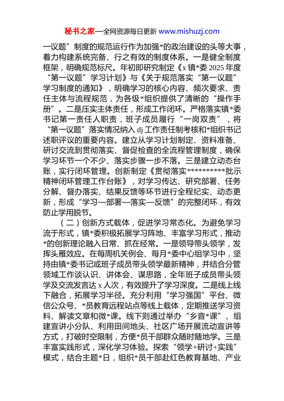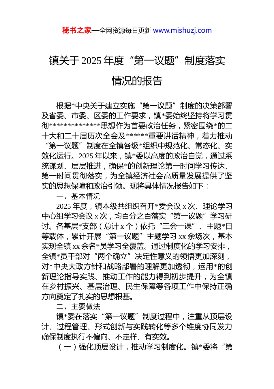 秘书之家—全网资源每日更新 www.mishuzj.com镇关于 2025 年度“第一议题”制度落实情况的报告根据*中央关于建立实施“第一议题”制度的决策部署及省委、市委、区委的工作要求,镇*委始终坚持将学习贯彻**************思想作为首要政治任务,紧密围绕*的二十大和二十届历次全会及******重要讲话精神,着力推动“第一议题”制度在全镇各级*组织中规范化、常态化、实效化运行。2025 年以来,镇*委以高度的政治自觉,通过系统谋划、层层推进,确保*的创新理论第一时间学习传达、第一时间贯彻落实,为全镇经济社会高质量发展提供了坚实的思想保障和政治引领。现将具体情况报告如下:一、基本情况2025 年度,镇本级共组织召开*委会议 x 次、理论学习中心组学习会议 x 次,均百分之百落实“第一议题”学习研讨。各基层*支部(总计 x 个)依托“三会一课”、主题*日等载体,累计开展“第一议题”主题学习 xx 余场次,基本实现全镇 xx 余名*员学习全覆盖。通过制度化的学习安排,全镇*员干部对“两个确立”决定性意义的领悟更加深刻,对*中央大政方针和战略部署的理解更加透彻,运用*的创新理论指导实践、推动工作的能力得到初步提升,为全镇在乡村振兴、基层治理、民生保障等各项工作中保持正确方向奠定了扎实的思想根基。二、主要做法镇*委在落实“第一议题”制度过程中,注重从顶层设计、过程管理、形式创新与实践转化等多个维度协同发力确保制度执行不偏向、不走样、有实效。(一)强化顶层设计,推动学习制度化。镇*委将“第秘书之家—全网资源每日更新 www.mishuzj.com一议题”制度的规范运行作为加强*的政治建设的头等大事,着力构建系统完备、行之有效的制度体系。一是健全制度框架,明确规范标尺。年初即研究制定《x 镇*委 2025 年度“第一议题”学习计划》与《关于规范落实“第一议题”学习制度的通知》,明确学习的核心内容、频次要求、责任主体与流程规范,为各级*组织提供了清晰的“操作手册”。二是压实主体责任,形成工作闭环。严格落实镇*委书记第一责任人职责,班子成员履行“一岗双责”,将“第一议题”落实情况纳入 dj 工作责任制考核和*组织书记述职评议的重要内容。建立从学习计划制定、资料准备、研讨交流到贯彻落实、督促检查的全流程管理制度,确保学习环节一个不少、落实步骤一步不落。三是建立动态台账,实行闭环管理。创新制定《贯彻落实**********批示精神闭环管理工作台账》,对学习传达、研究部署、任务分解、督办落实、结果反馈等环节进行全程纪实、动态更新,形成“学习—部署—落实—反馈”的完整闭环,有效防止学用脱节。(二)创新方式载体,促进学习常态化。为避免学习流于形式,镇*委积极拓展学习阵地、丰富学习形式,推动*的创新理论融入日常、抓在经常。一是领导带头领学,发挥头雁效应。在每周机关例会、每月*委中心组学习中,坚持由镇*委书记或班子成员带头领学最新精神,并结合分管领域工作谈认识、讲体会、谋思路,全年班子成员带头领学及交流发言达 x 人次,有效提升了学习深度。二是线上线下融合,拓展学习半径。充分利用“学习强国”平台、微信公众号、*员教育远程站点等线上载体,定期推送学习资料、解读文章和微*课。线下则通过举办“乡音*课”、组建宣讲小分队、利用田间地头、社区广场开展流动宣讲等方式,打破时空限制,方便*员干部群众随时随地学。三是丰富实践形式,深化学习体验。探索“领学+研讨+实践”模式,结合主题*日,组织*员干部赴红色教育基地、产业秘书之家—全网资源每日更新 www.mishuzj.com发展一线、乡村振兴示范点开展实地研学 x 次,将学习课堂延伸到现场,在沉浸式体验中推动学思用贯通。(三)注重深学细悟,确保学习规范化。镇*委着力在提升学习质量和效果上下功夫,坚决杜绝学习过程中的形式主义、浅尝辄止现象。一是规范学习流程,做足会前功夫。明确规定,“第一议题”学习主题需经*委会审议确定,学习资料至少提前 1 个工作日发放至与会人员,要求提前研读、深入思考,确保会上研讨能聚焦主题、切中要害。二是严肃学习纪律,做实会议记录。为各支部统一配发专用会议记录本,明确...