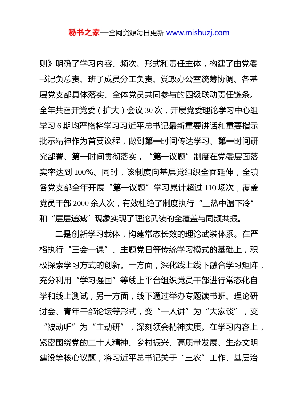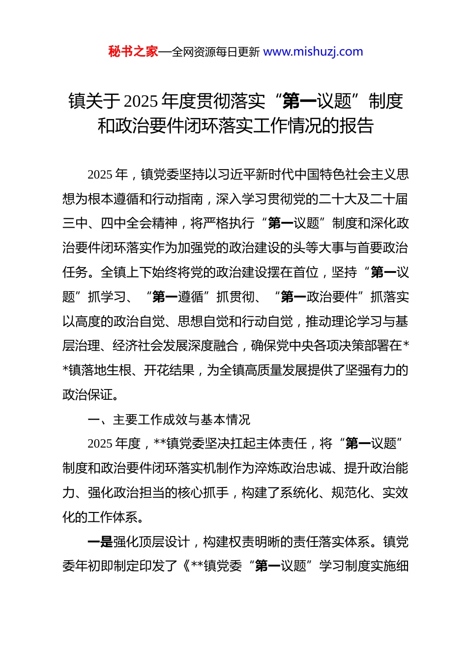 秘书之家—全网资源每日更新 www.mishuzj.com镇关于 2025 年度贯彻落实“第一议题”制度和政治要件闭环落实工作情况的报告 2025 年,镇党委坚持以习近平新时代中国特色社会主义思想为根本遵循和行动指南,深入学习贯彻党的二十大及二十届三中、四中全会精神,将严格执行“第一议题”制度和深化政治要件闭环落实作为加强党的政治建设的头等大事与首要政治任务。全镇上下始终将党的政治建设摆在首位,坚持“第一议题”抓学习、“第一遵循”抓贯彻、“第一政治要件”抓落实以高度的政治自觉、思想自觉和行动自觉,推动理论学习与基层治理、经济社会发展深度融合,确保党中央各项决策部署在**镇落地生根、开花结果,为全镇高质量发展提供了坚强有力的政治保证。一、主要工作成效与基本情况2025 年度,**镇党委坚决扛起主体责任,将“第一议题”制度和政治要件闭环落实机制作为淬炼政治忠诚、提升政治能力、强化政治担当的核心抓手,构建了系统化、规范化、实效化的工作体系。一是强化顶层设计,构建权责明晰的责任落实体系。镇党委年初即制定印发了《**镇党委“第一议题”学习制度实施细秘书之家—全网资源每日更新 www.mishuzj.com则》明确了学习内容、频次、形式和责任主体,构建了由党委书记负总责、班子成员分工负责、党政办公室统筹协调、各基层党支部具体落实、全体党员共同参与的四级联动责任链条。全年共召开党委(扩大)会议 30 次,开展党委理论学习中心组学习 6 期均严格将学习习近平总书记最新重要讲话和重要指示批示精神作为首要议程,做到第一时间传达学习、第一时间研究部署、第一时间贯彻落实,“第一议题”制度在党委层面落实率达到 100%。同时,该制度向基层党组织全面延伸,全镇各党支部全年开展“第一议题”学习累计超过 110 场次,覆盖党员干部 2000 余人次,有效杜绝了制度执行“上热中温下冷”和“层层递减”现象实现了理论武装的全覆盖与同频共振。二是创新学习载体,构建常态长效的理论武装体系。在严格执行“三会一课”、主题党日等传统学习模式的基础上,积极探索学习方式的创新。一方面,深化线上线下融合学习矩阵,充分利用“学习强国”等线上平台组织党员干部进行常态化自学和线上测试,另一方面,线下通过举办专题读书班、理论研讨会、青年干部论坛等形式,变“一人讲”为“大家谈”,变“被动听”为“主动研”,深刻领会精神实质。在学习内容上,紧密围绕党的二十大精神、乡村振兴、高质量发展、生态文明建设等核心议题,将习近平总书记关于“三农”工作、基层治秘书之家—全网资源每日更新 www.mishuzj.com理、产业发展等重要论述作为必学内容,编印学习资料汇编,确保学习的系统性与针对性。三是健全闭环机制,构建贯通到底的贯彻落实体系。为确保习近平总书记重要指示批示精神和党中央决策部署事事有回音、件件有着落,**镇探索建立了“学习—研究—部署—执行—督办—反馈”的政治要件闭环管理机制。该机制以清单化管理为基础,将“第一议题”学习内容与镇党委年度重点工作、重大项目紧密结合,形成政治要件任务清单、责任清单和时限清单。党委会议学习研讨后,立即由党政办公室牵头,将形成的决议事项分解到具体的分管领导、责任部门和责任人,实行项目化推进。在执行过程中,镇纪委和督查室组成联合督导组,通过“四不两直”方式,对政治要件的落实进度、质量和效果进行全过程跟踪问效,实行“月调度、季通报、年考核”,确保压力传导到位。整个流程借助“网格通”APP 等数字化手段辅助管理,建立电子台账,实现了对政治要件办理全过程的动态跟踪与监督,形成了权责清晰、流程规范、监督有力、办结高效的管理闭环。四是聚焦学用结合,构建赋能发展的成果转化体系。**镇党委始终坚持理论联系实际的马克思主义学风,将“第一议题”学习的落脚点放在解决实际问题、推动高质量发展上。在秘书之家—全网资源每日更新 www.mishuzj.com党建引领乡村振兴方面,通过深入学习“千万工程”经验,成功推动了高竹村“白叶一号”茶园等特色产业发展,并积极探索“党建引领+”模式,促进茶产业与旅游、文化产业融合发展,有效带动了村集体经...