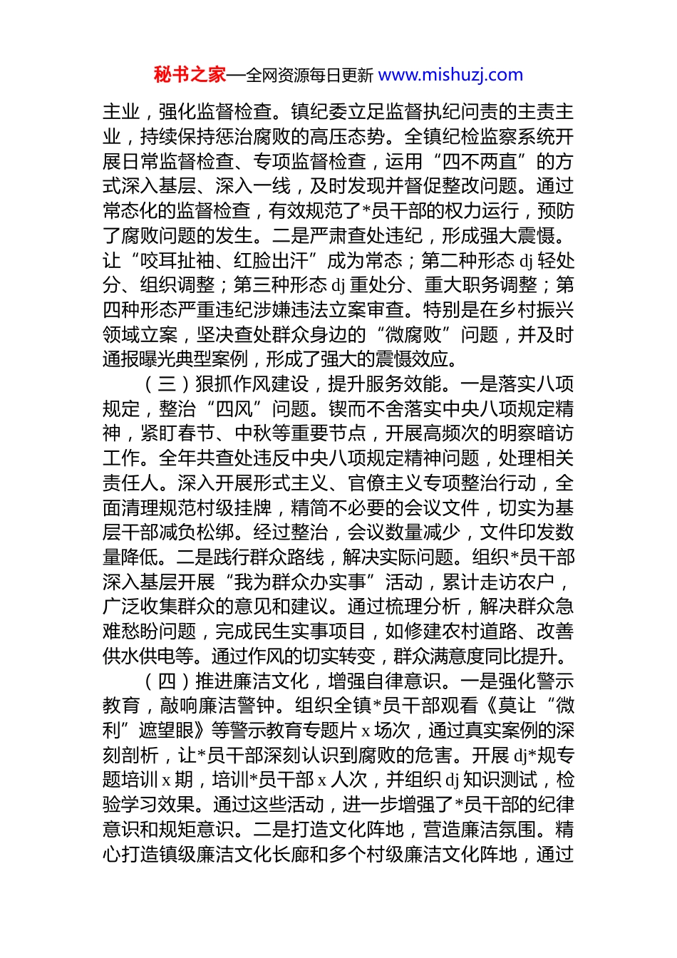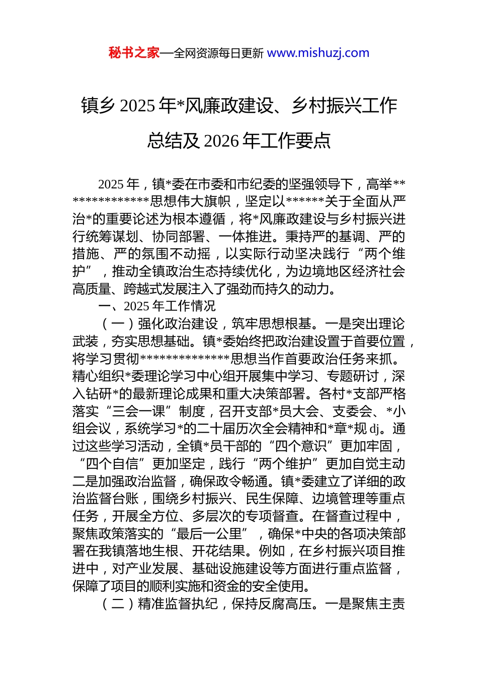 秘书之家—全网资源每日更新 www.mishuzj.com镇乡 2025 年*风廉政建设、乡村振兴工作总结及 2026 年工作要点2025 年,镇*委在市委和市纪委的坚强领导下,高举**************思想伟大旗帜,坚定以******关于全面从严治*的重要论述为根本遵循,将*风廉政建设与乡村振兴进行统筹谋划、协同部署、一体推进。秉持严的基调、严的措施、严的氛围不动摇,以实际行动坚决践行“两个维护”,推动全镇政治生态持续优化,为边境地区经济社会高质量、跨越式发展注入了强劲而持久的动力。一、2025 年工作情况(一)强化政治建设,筑牢思想根基。一是突出理论武装,夯实思想基础。镇*委始终把政治建设置于首要位置,将学习贯彻**************思想当作首要政治任务来抓。精心组织*委理论学习中心组开展集中学习、专题研讨,深入钻研*的最新理论成果和重大决策部署。各村*支部严格落实“三会一课”制度,召开支部*员大会、支委会、*小组会议,系统学习*的二十届历次全会精神和*章*规 dj。通过这些学习活动,全镇*员干部的“四个意识”更加牢固,“四个自信”更加坚定,践行“两个维护”更加自觉主动二是加强政治监督,确保政令畅通。镇*委建立了详细的政治监督台账,围绕乡村振兴、民生保障、边境管理等重点任务,开展全方位、多层次的专项督查。在督查过程中,聚焦政策落实的“最后一公里”,确保*中央的各项决策部署在我镇落地生根、开花结果。例如,在乡村振兴项目推进中,对产业发展、基础设施建设等方面进行重点监督,保障了项目的顺利实施和资金的安全使用。(二)精准监督执纪,保持反腐高压。一是聚焦主责秘书之家—全网资源每日更新 www.mishuzj.com主业,强化监督检查。镇纪委立足监督执纪问责的主责主业,持续保持惩治腐败的高压态势。全镇纪检监察系统开展日常监督检查、专项监督检查,运用“四不两直”的方式深入基层、深入一线,及时发现并督促整改问题。通过常态化的监督检查,有效规范了*员干部的权力运行,预防了腐败问题的发生。二是严肃查处违纪,形成强大震慑。让“咬耳扯袖、红脸出汗”成为常态;第二种形态 dj 轻处分、组织调整;第三种形态 dj 重处分、重大职务调整;第四种形态严重违纪涉嫌违法立案审查。特别是在乡村振兴领域立案,坚决查处群众身边的“微腐败”问题,并及时通报曝光典型案例,形成了强大的震慑效应。(三)狠抓作风建设,提升服务效能。一是落实八项规定,整治“四风”问题。锲而不舍落实中央八项规定精神,紧盯春节、中秋等重要节点,开展高频次的明察暗访工作。全年共查处违反中央八项规定精神问题,处理相关责任人。深入开展形式主义、官僚主义专项整治行动,全面清理规范村级挂牌,精简不必要的会议文件,切实为基层干部减负松绑。经过整治,会议数量减少,文件印发数量降低。二是践行群众路线,解决实际问题。组织*员干部深入基层开展“我为群众办实事”活动,累计走访农户,广泛收集群众的意见和建议。通过梳理分析,解决群众急难愁盼问题,完成民生实事项目,如修建农村道路、改善供水供电等。通过作风的切实转变,群众满意度同比提升。(四)推进廉洁文化,增强自律意识。一是强化警示教育,敲响廉洁警钟。组织全镇*员干部观看《莫让“微利”遮望眼》等警示教育专题片 x 场次,通过真实案例的深刻剖析,让*员干部深刻认识到腐败的危害。开展 dj*规专题培训 x 期,培训*员干部 x 人次,并组织 dj 知识测试,检验学习效果。通过这些活动,进一步增强了*员干部的纪律意识和规矩意识。二是打造文化阵地,营造廉洁氛围。精心打造镇级廉洁文化长廊和多个村级廉洁文化阵地,通过秘书之家—全网资源每日更新 www.mishuzj.com图文并茂的展示形式,传播廉洁理念和文化。开展丰富多彩的廉洁文化活动,如廉洁主题演讲比赛、书法绘画展览等,吸引了广大群众的积极参与。建立新任村干部任前廉政谈话制度,对 x 名新任村干部开展廉政谈话和廉政知识测试,确保他们在新的岗位上廉洁从政、履职尽责。(五)护航乡村振兴,推动产业发展。一是嵌入廉政监督,保障项目安全。坚持将*风廉政建设深度嵌入乡村振兴的全过程,确保项目资金安全、...