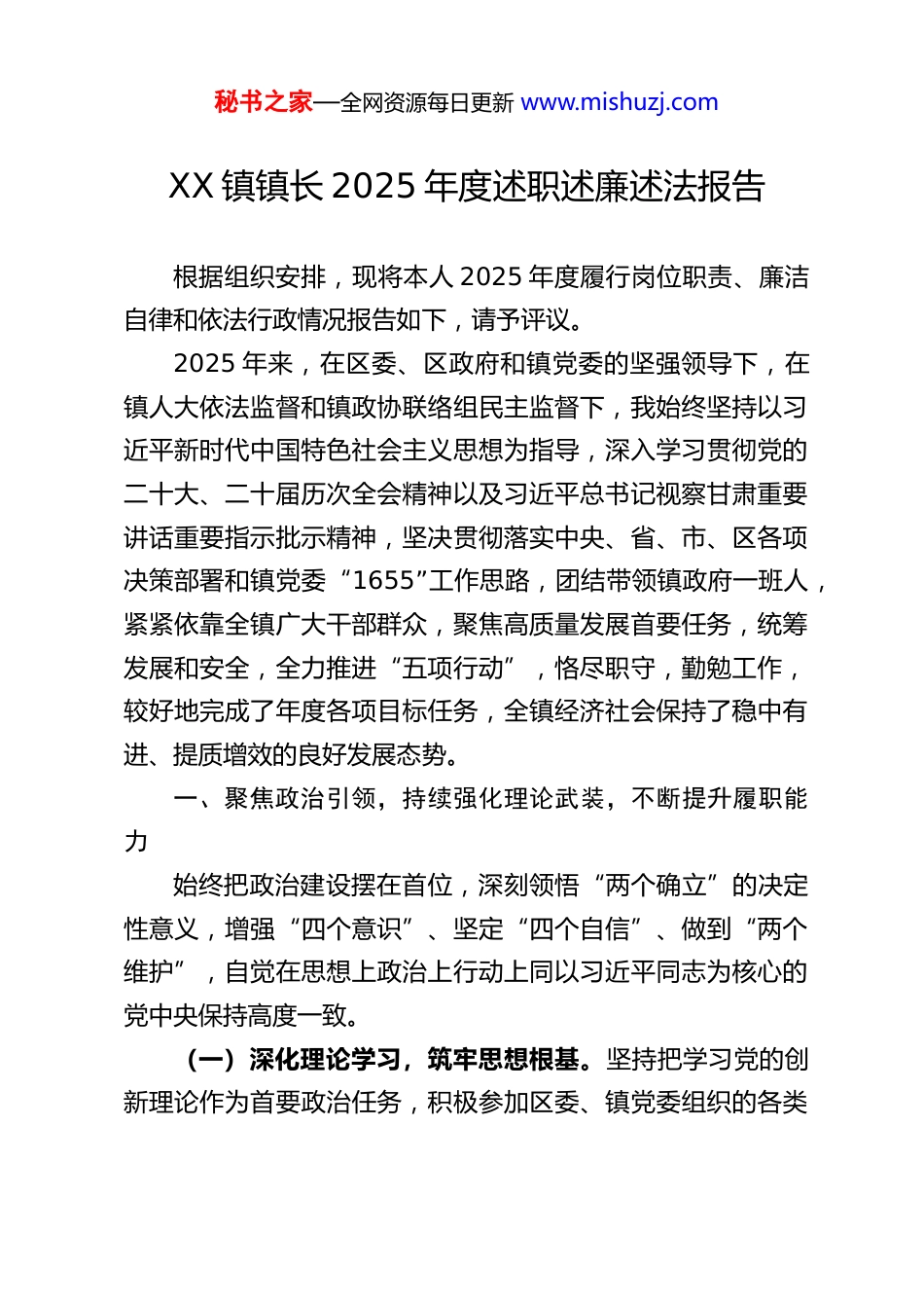 秘书之家—全网资源每日更新 www.mishuzj.comXX 镇镇长 2025 年度述职述廉述法报告根据组织安排,现将本人 2025 年度履行岗位职责、廉洁自律和依法行政情况报告如下,请予评议。2025 年来,在区委、区政府和镇党委的坚强领导下,在镇人大依法监督和镇政协联络组民主监督下,我始终坚持以习近平新时代中国特色社会主义思想为指导,深入学习贯彻党的二十大、二十届历次全会精神以及习近平总书记视察甘肃重要讲话重要指示批示精神,坚决贯彻落实中央、省、市、区各项决策部署和镇党委“1655”工作思路,团结带领镇政府一班人,紧紧依靠全镇广大干部群众,聚焦高质量发展首要任务,统筹发展和安全,全力推进“五项行动”,恪尽职守,勤勉工作,较好地完成了年度各项目标任务,全镇经济社会保持了稳中有进、提质增效的良好发展态势。一、聚焦政治引领,持续强化理论武装,不断提升履职能力始终把政治建设摆在首位,深刻领悟“两个确立”的决定性意义,增强“四个意识”、坚定“四个自信”、做到“两个维护”,自觉在思想上政治上行动上同以习近平同志为核心的党中央保持高度一致。(一)深化理论学习,筑牢思想根基。坚持把学习党的创新理论作为首要政治任务,积极参加区委、镇党委组织的各类秘书之家—全网资源每日更新 www.mishuzj.com学习活动,带头落实党委理论学习中心组学习制度。重点深入学习领会党的二十届四中全会精神,深刻把握推进中国式现代化对基层治理提出的新要求,深刻理解发展全过程人民民主、坚持和完善人民代表大会制度、全面推进依法治国等重大部署,努力将学习成果转化为谋划推动 XX 镇高质量发展的思路举措和实际成效。全年主持或参加政府系统专题学习、研讨交流 30余次,撰写心得体会和调研报告 6 篇,不断用党的最新理论成果武装头脑、指导实践、推动工作。(二)严守政治纪律,坚决贯彻落实。坚决维护党中央权威和集中统一领导,确保中央大政方针和省、市、区决策部署在 XX 镇不折不扣落地生根。严格执行重大事项请示报告制度,自觉维护镇党委班子团结,坚决执行镇党委的各项决议决定。在政府工作中,坚持民主集中制,凡属重大决策、重要干部任免、重大项目安排和大额度资金使用等事项,均提交镇政府常务会议或镇长办公会议集体研究决定,确保决策科学民主、依法合规。(三)深入开展主题教育,持续巩固成果。按照上级统一部署,带头参加并组织政府系统党员干部持续巩固拓展主题教育成果,建立健全长效机制。坚持学思用贯通、知信行统一,把学习成效体现到解决实际问题、推动具体工作上,着力破解影响和制约 XX 镇发展的突出矛盾和群众急难愁盼问题。二、聚焦高质量发展,全力攻坚克难,经济社会发展取得秘书之家—全网资源每日更新 www.mishuzj.com新成效紧紧围绕镇党委确定的目标任务,锚定产业强镇建设,全力以赴抓项目、兴产业、惠民生、保稳定,推动全镇经济社会发展迈上新台阶。(一)经济运行稳中提质。坚持项目为王,狠抓招商引资和项目建设。全年开工建设各类项目 20 个,完成固定资产投资 1.55 亿元,招商引资到位资金 3.95 亿元,争取各类专项资金 145 万元,为经济发展注入了强劲动力。高质量完成镇域“十五五”规划编制工作,谋划储备重大项目 56 个,配合上级完成了国土空间总体规划编制,为长远发展奠定了坚实基础。(二)产业结构优化升级。一是农业基础持续巩固。坚决扛牢粮食安全政治责任,完成粮食种植面积 6.72 万亩,小麦、玉米制种均超额完成目标任务。大力推进高标准农田建设,新建高标准农田 6000 亩,配套完善水利设施,农业综合生产能力稳步提升。创新水量交易制度,保障了 6 轮次农业灌溉有序进行,玉米制种款兑付比例超过 80%,有效保护了农民利益。养殖业发展迅速,新改扩建标准化养殖场 2 个,全镇畜禽饲养总量达到 91.1 万头只。特色产业规模不断壮大,洋葱、孜然、高山林果等种植面积稳定在较高水平,成为农民增收的重要渠道。二是工业集群逐步壮大。依托农产品加工物流园区,加大招商引资力度,园区入驻企业达到 19 家,年产值突破 10 亿元秘书之家—全网资源每日更新 www.mish...
