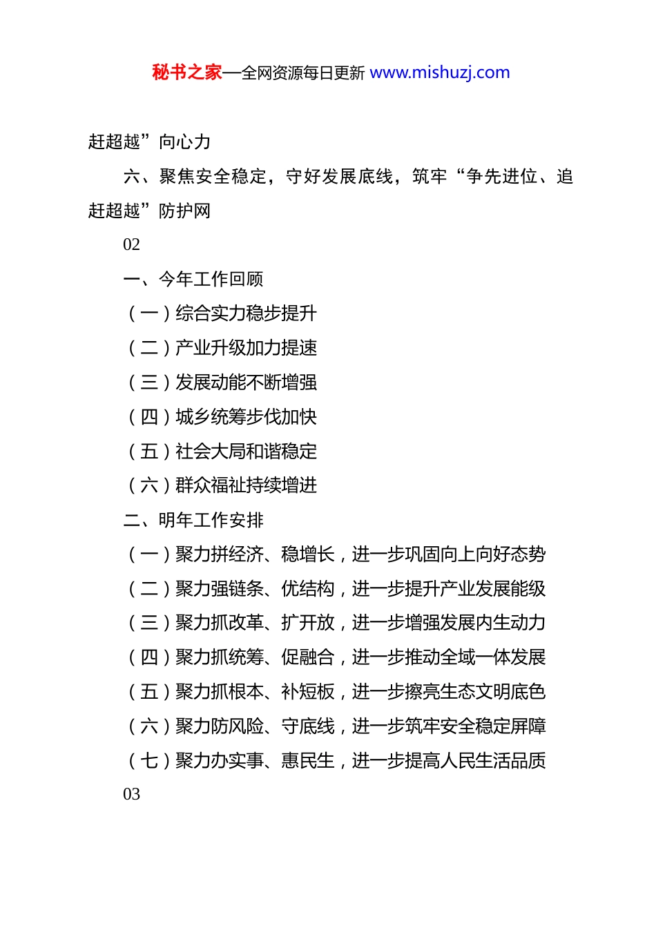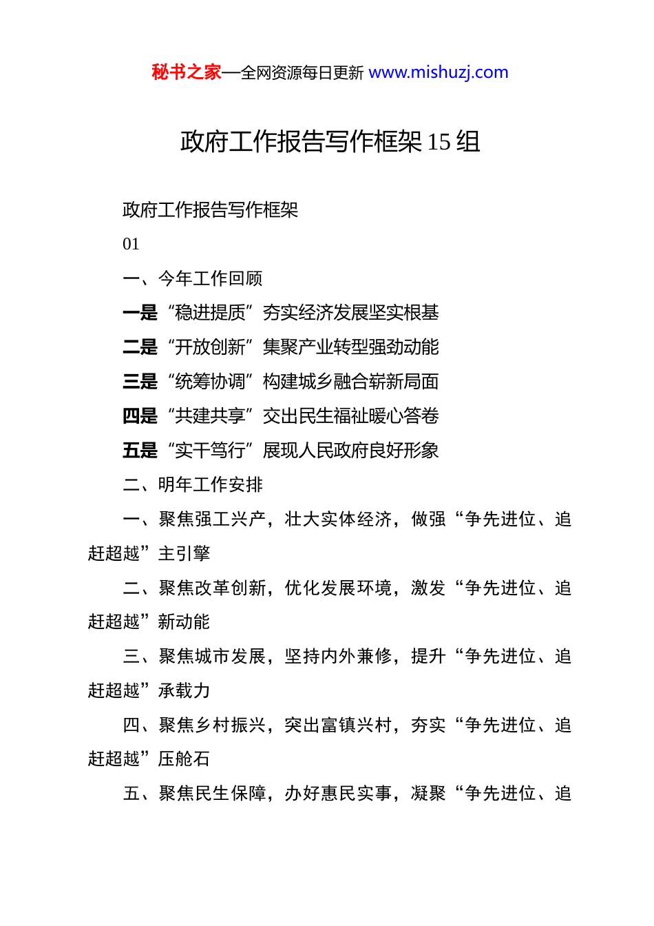 秘书之家—全网资源每日更新 www.mishuzj.com政府工作报告写作框架 15 组 政府工作报告写作框架01一、今年工作回顾一是“稳进提质”夯实经济发展坚实根基二是“开放创新”集聚产业转型强劲动能三是“统筹协调”构建城乡融合崭新局面四是“共建共享”交出民生福祉暖心答卷五是“实干笃行”展现人民政府良好形象二、明年工作安排一、聚焦强工兴产,壮大实体经济,做强“争先进位、追赶超越”主引擎二、聚焦改革创新,优化发展环境,激发“争先进位、追赶超越”新动能三、聚焦城市发展,坚持内外兼修,提升“争先进位、追赶超越”承载力四、聚焦乡村振兴,突出富镇兴村,夯实“争先进位、追赶超越”压舱石五、聚焦民生保障,办好惠民实事,凝聚“争先进位、追秘书之家—全网资源每日更新 www.mishuzj.com赶超越”向心力六、聚焦安全稳定,守好发展底线,筑牢“争先进位、追赶超越”防护网02一、今年工作回顾(一)综合实力稳步提升(二)产业升级加力提速(三)发展动能不断增强(四)城乡统筹步伐加快(五)社会大局和谐稳定(六)群众福祉持续增进二、明年工作安排(一)聚力拼经济、稳增长,进一步巩固向上向好态势(二)聚力强链条、优结构,进一步提升产业发展能级(三)聚力抓改革、扩开放,进一步增强发展内生动力(四)聚力抓统筹、促融合,进一步推动全域一体发展(五)聚力抓根本、补短板,进一步擦亮生态文明底色(六)聚力防风险、守底线,进一步筑牢安全稳定屏障(七)聚力办实事、惠民生,进一步提高人民生活品质03秘书之家—全网资源每日更新 www.mishuzj.com一、今年工作回顾过去一年,我们全力以赴稳增长、促发展,综合实力再攀新高过去一年,我们凝心聚力抓创新、强产业,发展势能加速汇聚过去一年,我们坚持不懈强基础、补短板,城乡建设扩容提质过去一年,我们久久为功推改革、扩开放,发展环境持续优化过去一年,我们用心用情惠民生、增福祉,群众生活更加美好过去一年,我们坚定不移防风险、保安全,社会大局和谐稳定过去一年,我们持之以恒优服务、提效能,政府建设扎实推进二、明年工作安排(一)夯实基本盘,厚植新优势,在促进产业做优做强上提速加力(二)攻坚主战场,增强驱动力,在挖掘释放需求潜力上提速加力秘书之家—全网资源每日更新 www.mishuzj.com(三)激发原动力,拓展新空间,在深化改革扩大开放上提速加力(四)增强承载力,提升宜居度,在加快建设人民城市上提速加力(五)描绘新图景,拓宽致富路,在全面推进乡村振兴上提速加力(六)织牢保障网,提升幸福感,在持续增进民生福祉上提速加力(七)拧牢责任阀,下足真功夫,在筑牢安全发展底线上提速加力04一、今年工作回顾(一)经济运行稳中快进(二)产业发展提级扩能(三)创新驱动活力迸发(四)城市能级加快提升(五)乡村振兴成果丰硕(六)民生福祉更加殷实(七)社会大局和谐稳定(八)政府履职务实高效秘书之家—全网资源每日更新 www.mishuzj.com二、明年工作安排(一)全力以赴推动经济平稳增长(二)凝心聚力推动产业做优做强(三)抢抓机遇推动城市能级提升(四)统筹资源推动乡村全面振兴(五)坚定不移推动改革走深走实(六)用心用力推动民生持续改善(七)守正创新推动文化繁荣发展(八)常抓不懈推动“一排底线”持续稳固05一、今年工作回顾(一)工业经济加力突破(二)项目建设提速增效(三)城市品质不断提升(四)乡村振兴纵深推进(五)改革活力加速释放(六)民生福祉不断改善(七)社会大局和谐稳定(八)行政效能持续提升二、明年工作安排秘书之家—全网资源每日更新 www.mishuzj.com(一)更大力度推进稳增长,集聚高质量发展新动能(二)更大力度发展工业经济,打造高质量发展主引擎(三)更大力度增强城市功能,夯实高质量发展新支撑(四)更大力度推动乡村振兴,谱写高质量发展新篇章(五)更大力度全面深化改革,增添高质量发展新动力(六)更大力度增进民生福祉,共享高质量发展新成果(七)更大力度防范化解风险,筑牢高质量发展安全网06一、今年工作回顾(一)跨越发展实现新突破(二)产业升级催生新动能(三)深化改革释放新活力(四)城市面...