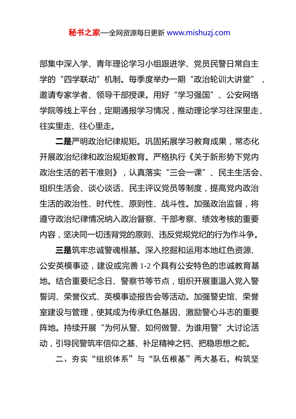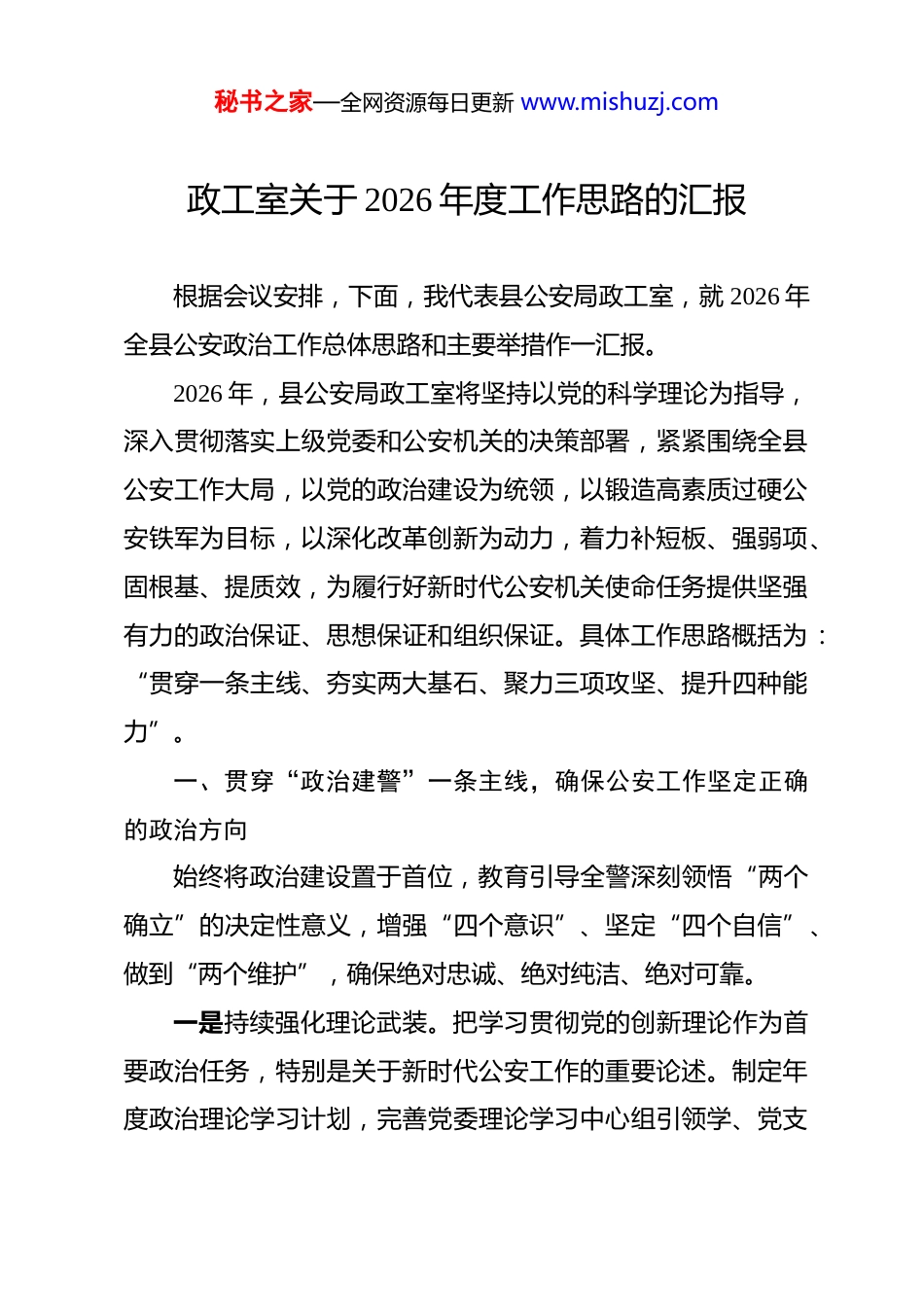 秘书之家—全网资源每日更新 www.mishuzj.com政工室关于 2026 年度工作思路的汇报 根据会议安排,下面,我代表县公安局政工室,就 2026 年全县公安政治工作总体思路和主要举措作一汇报。2026 年,县公安局政工室将坚持以党的科学理论为指导,深入贯彻落实上级党委和公安机关的决策部署,紧紧围绕全县公安工作大局,以党的政治建设为统领,以锻造高素质过硬公安铁军为目标,以深化改革创新为动力,着力补短板、强弱项、固根基、提质效,为履行好新时代公安机关使命任务提供坚强有力的政治保证、思想保证和组织保证。具体工作思路概括为:“贯穿一条主线、夯实两大基石、聚力三项攻坚、提升四种能力”。一、贯穿“政治建警”一条主线,确保公安工作坚定正确的政治方向始终将政治建设置于首位,教育引导全警深刻领悟“两个确立”的决定性意义,增强“四个意识”、坚定“四个自信”、做到“两个维护”,确保绝对忠诚、绝对纯洁、绝对可靠。一是持续强化理论武装。把学习贯彻党的创新理论作为首要政治任务,特别是关于新时代公安工作的重要论述。制定年度政治理论学习计划,完善党委理论学习中心组引领学、党支秘书之家—全网资源每日更新 www.mishuzj.com部集中深入学、青年理论学习小组跟进学、党员民警日常自主学的“四学联动”机制。每季度举办一期“政治轮训大讲堂”,邀请专家学者、领导干部授课。用好“学习强国”、公安网络学院等线上平台,定期通报学习情况,推动理论学习往深里走、往实里走、往心里走。二是严明政治纪律规矩。巩固拓展学习教育成果,常态化开展政治纪律和政治规矩教育。严格执行《关于新形势下党内政治生活的若干准则》,认真落实“三会一课”、民主生活会、组织生活会、谈心谈话、民主评议党员等制度,提高党内政治生活的政治性、时代性、原则性、战斗性。加强政治监督,将遵守政治纪律情况纳入政治督察、干部考察、绩效考核的重要内容,坚决同一切违背党的原则、违反党规党纪的行为作斗争。三是筑牢忠诚警魂根基。深入挖掘和运用本地红色资源、公安英模事迹,建设或完善 1-2 个具有公安特色的忠诚教育基地。结合重要纪念日、警察节等节点,组织开展重温入党入警誓词、荣誉仪式、英模事迹报告会等活动。加强警史馆、荣誉室建设与管理,使其成为传承红色基因、激励警心斗志的重要阵地。持续开展“为何从警、如何做警、为谁用警”大讨论活动,引导民警筑牢信仰之基、补足精神之钙、把稳思想之舵。二、夯实“组织体系”与“队伍根基”两大基石,构筑坚秘书之家—全网资源每日更新 www.mishuzj.com强有力的战斗堡垒聚焦组织功能提升和队伍结构优化,不断增强基层党组织的政治功能和组织功能,打造一支结构合理、素质优良、充满活力的公安队伍。(一)实施组织体系优化工程一是建强支部战斗堡垒。深入贯彻党支部工作条例,持续推进党支部标准化规范化建设。开展“最强党支部”创建提质行动,制定动态评估标准,年内力争新增 3-5 个市级以上“示范党支部”或“四强党支部”。优化基层党组织设置,探索在任务较重的警种部门、专案组、执勤点等建立临时党组织,确保党的组织和工作全覆盖。严格落实党组织换届提醒督促机制,选优配强支部班子特别是支部书记。二是压实党建工作责任。完善县局党委、机关党委(党总支)、党支部三级党建责任清单,细化量化考核指标。严格执行党组织书记抓基层党建工作述职评议考核制度,强化结果运用,将评议考核结果与领导班子和领导干部考核评价、评先评优、选拔任用挂钩。每季度召开一次党建工作领导小组会议或党建形势分析会,研究解决突出问题。落实政工干部联系指导基层党建工作制度,定期下沉督导。三是激发组织生活活力。在坚持基本形式、完成规定动作秘书之家—全网资源每日更新 www.mishuzj.com的基础上,创新“主题党日+”模式,探索开展“政治生日”“情景党课”“红色践学”“警营开放日·党建专场”等特色活动,增强组织生活的吸引力和感染力。推广使用“智慧党建”平台,实现组织生活在线管理、在线记录、在线督导。建立组织生活落实情况定期通报和约谈机制。(二)实施队伍根基固本工程一是精准科学选贤...