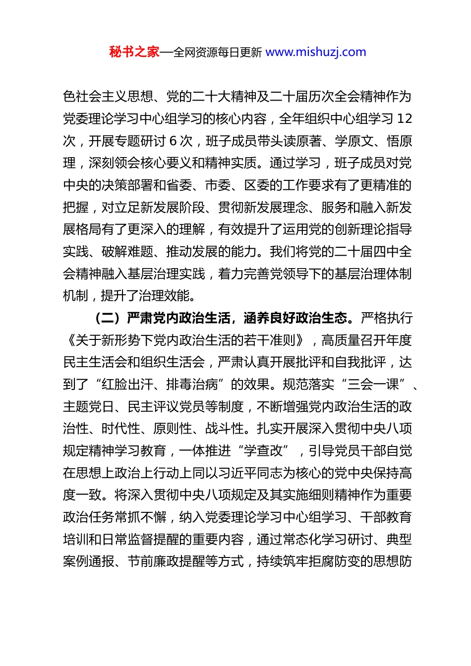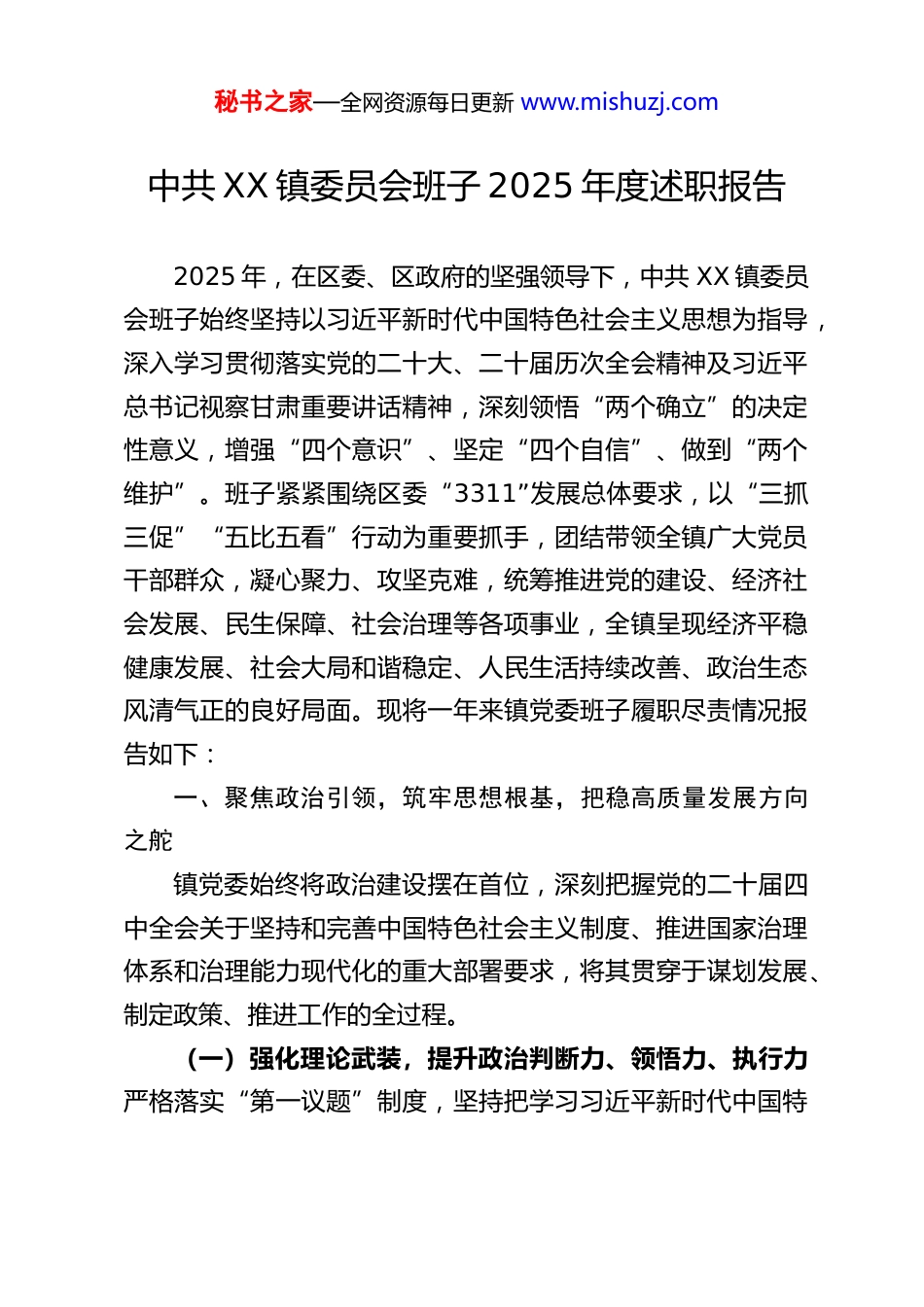 秘书之家—全网资源每日更新 www.mishuzj.com中共 XX 镇委员会班子 2025 年度述职报告2025 年,在区委、区政府的坚强领导下,中共 XX 镇委员会班子始终坚持以习近平新时代中国特色社会主义思想为指导,深入学习贯彻落实党的二十大、二十届历次全会精神及习近平总书记视察甘肃重要讲话精神,深刻领悟“两个确立”的决定性意义,增强“四个意识”、坚定“四个自信”、做到“两个维护”。班子紧紧围绕区委“3311”发展总体要求,以“三抓三促”“五比五看”行动为重要抓手,团结带领全镇广大党员干部群众,凝心聚力、攻坚克难,统筹推进党的建设、经济社会发展、民生保障、社会治理等各项事业,全镇呈现经济平稳健康发展、社会大局和谐稳定、人民生活持续改善、政治生态风清气正的良好局面。现将一年来镇党委班子履职尽责情况报告如下:一、聚焦政治引领,筑牢思想根基,把稳高质量发展方向之舵镇党委始终将政治建设摆在首位,深刻把握党的二十届四中全会关于坚持和完善中国特色社会主义制度、推进国家治理体系和治理能力现代化的重大部署要求,将其贯穿于谋划发展、制定政策、推进工作的全过程。(一)强化理论武装,提升政治判断力、领悟力、执行力严格落实“第一议题”制度,坚持把学习习近平新时代中国特秘书之家—全网资源每日更新 www.mishuzj.com色社会主义思想、党的二十大精神及二十届历次全会精神作为党委理论学习中心组学习的核心内容,全年组织中心组学习 12次,开展专题研讨 6 次,班子成员带头读原著、学原文、悟原理,深刻领会核心要义和精神实质。通过学习,班子成员对党中央的决策部署和省委、市委、区委的工作要求有了更精准的把握,对立足新发展阶段、贯彻新发展理念、服务和融入新发展格局有了更深入的理解,有效提升了运用党的创新理论指导实践、破解难题、推动发展的能力。我们将党的二十届四中全会精神融入基层治理实践,着力完善党领导下的基层治理体制机制,提升了治理效能。(二)严肃党内政治生活,涵养良好政治生态。严格执行《关于新形势下党内政治生活的若干准则》,高质量召开年度民主生活会和组织生活会,严肃认真开展批评和自我批评,达到了“红脸出汗、排毒治病”的效果。规范落实“三会一课”、主题党日、民主评议党员等制度,不断增强党内政治生活的政治性、时代性、原则性、战斗性。扎实开展深入贯彻中央八项规定精神学习教育,一体推进“学查改”,引导党员干部自觉在思想上政治上行动上同以习近平同志为核心的党中央保持高度一致。将深入贯彻中央八项规定及其实施细则精神作为重要政治任务常抓不懈,纳入党委理论学习中心组学习、干部教育培训和日常监督提醒的重要内容,通过常态化学习研讨、典型案例通报、节前廉政提醒等方式,持续筑牢拒腐防变的思想防秘书之家—全网资源每日更新 www.mishuzj.com线,力戒形式主义、官僚主义,推动作风建设走深走实。(三)夯实组织基础,锻造坚强战斗堡垒。牢固树立大抓基层的鲜明导向,深入实施基层党建提质增效行动。精心培育村党组织书记后备人选 42 人,优化调整村干部 27 人,动态培养入党积极分子 26 人,规范发展预备党员 8 人,为基层党组织注入新鲜血液。全面推行“村均百亩田”发展模式和闲置资源盘活利用,积极探索多元化发展路径,全镇村集体经济收入实现稳步增长,党建引领集体经济发展的能力显著增强。纵深推进全面从严治党,以“零容忍”态度持续整治群众身边的不正之风和腐败问题,全年开展警示教育 4 场次,强化对农村集体“三资”的规范监管,着力解决损害群众利益的突出问题,推动基层政治生态持续向好。二、聚焦中心任务,聚力攻坚突破,夯实高质量发展稳固之基镇党委班子始终牢记发展是第一要务,坚决扛起巩固拓展脱贫攻坚成果同乡村振兴有效衔接的政治责任,牢牢守住保障国家粮食安全和不发生规模性返贫两条底线,全力推动经济社会持续健康发展。(一)坚决守牢底线任务,巩固拓展脱贫成果。始终将防止规模性返贫作为底线任务紧抓在手,健全并常态化运行防返贫动态监测和帮扶机制,大力推广运用“一键申报”系统,对重点群体进行全覆盖排查,精准监测收入支...