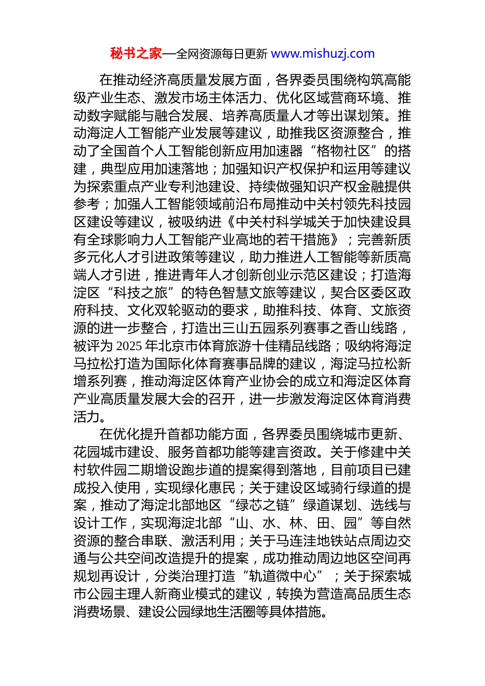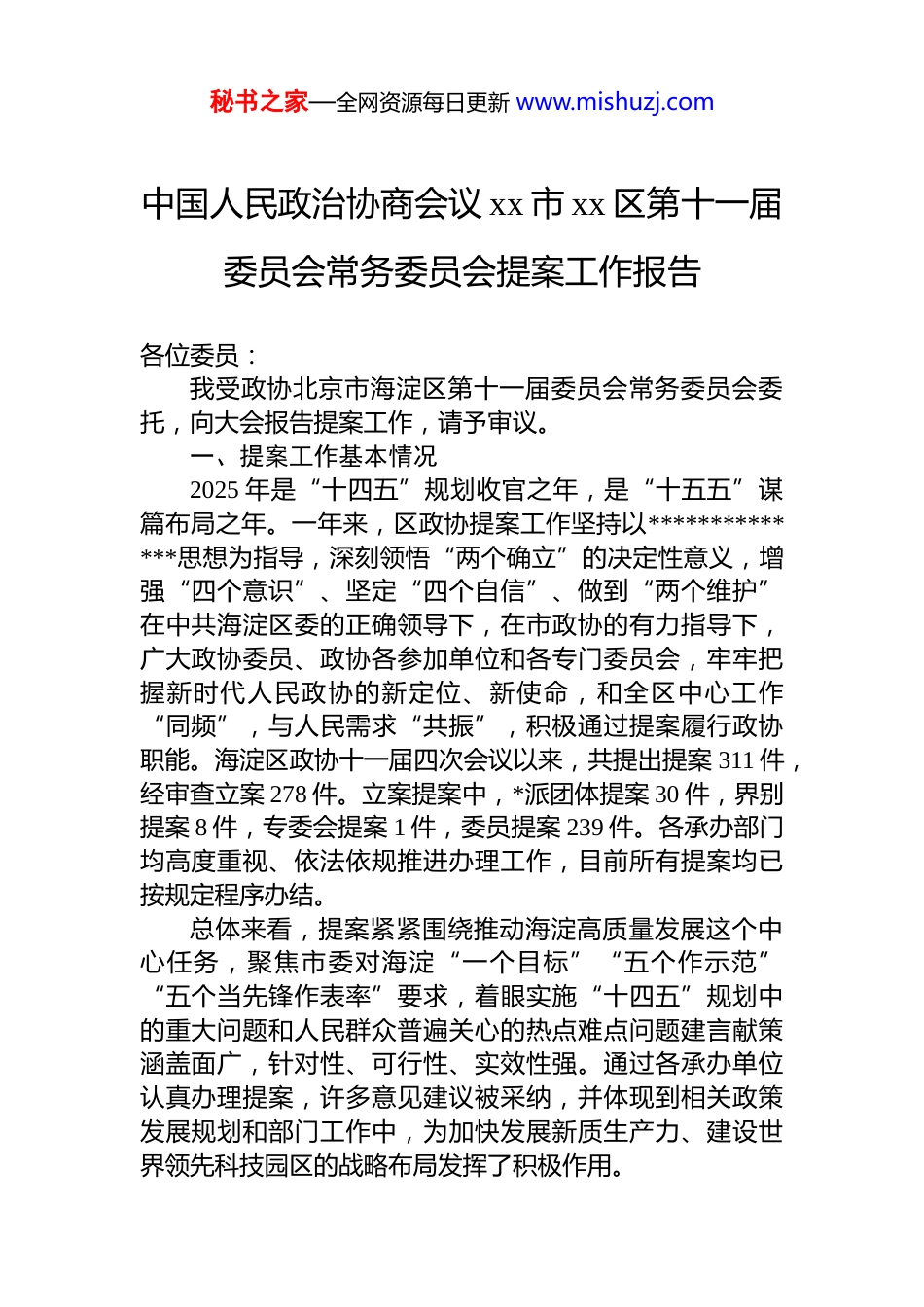 秘书之家—全网资源每日更新 www.mishuzj.com中国人民政治协商会议 xx 市 xx 区第十一届委员会常务委员会提案工作报告各位委员:我受政协北京市海淀区第十一届委员会常务委员会委托,向大会报告提案工作,请予审议。一、提案工作基本情况2025 年是“十四五”规划收官之年,是“十五五”谋篇布局之年。一年来,区政协提案工作坚持以**************思想为指导,深刻领悟“两个确立”的决定性意义,增强“四个意识”、坚定“四个自信”、做到“两个维护”在中共海淀区委的正确领导下,在市政协的有力指导下,广大政协委员、政协各参加单位和各专门委员会,牢牢把握新时代人民政协的新定位、新使命,和全区中心工作“同频”,与人民需求“共振”,积极通过提案履行政协职能。海淀区政协十一届四次会议以来,共提出提案 311 件,经审查立案 278 件。立案提案中,*派团体提案 30 件,界别提案 8 件,专委会提案 1 件,委员提案 239 件。各承办部门均高度重视、依法依规推进办理工作,目前所有提案均已按规定程序办结。总体来看,提案紧紧围绕推动海淀高质量发展这个中心任务,聚焦市委对海淀“一个目标”“五个作示范”“五个当先锋作表率”要求,着眼实施“十四五”规划中的重大问题和人民群众普遍关心的热点难点问题建言献策涵盖面广,针对性、可行性、实效性强。通过各承办单位认真办理提案,许多意见建议被采纳,并体现到相关政策发展规划和部门工作中,为加快发展新质生产力、建设世界领先科技园区的战略布局发挥了积极作用。秘书之家—全网资源每日更新 www.mishuzj.com在推动经济高质量发展方面,各界委员围绕构筑高能级产业生态、激发市场主体活力、优化区域营商环境、推动数字赋能与融合发展、培养高质量人才等出谋划策。推动海淀人工智能产业发展等建议,助推我区资源整合,推动了全国首个人工智能创新应用加速器“格物社区”的搭建,典型应用加速落地;加强知识产权保护和运用等建议为探索重点产业专利池建设、持续做强知识产权金融提供参考;加强人工智能领域前沿布局推动中关村领先科技园区建设等建议,被吸纳进《中关村科学城关于加快建设具有全球影响力人工智能产业高地的若干措施》;完善新质多元化人才引进政策等建议,助力推进人工智能等新质高端人才引进,推进青年人才创新创业示范区建设;打造海淀区“科技之旅”的特色智慧文旅等建议,契合区委区政府科技、文化双轮驱动的要求,助推科技、体育、文旅资源的进一步整合,打造出三山五园系列赛事之香山线路,被评为 2025 年北京市体育旅游十佳精品线路;吸纳将海淀马拉松打造为国际化体育赛事品牌的建议,海淀马拉松新增系列赛,推动海淀区体育产业协会的成立和海淀区体育产业高质量发展大会的召开,进一步激发海淀区体育消费活力。在优化提升首都功能方面,各界委员围绕城市更新、花园城市建设、服务首都功能等建言资政。关于修建中关村软件园二期增设跑步道的提案得到落地,目前项目已建成投入使用,实现绿化惠民;关于建设区域骑行绿道的提案,推动了海淀北部地区“绿芯之链”绿道谋划、选线与设计工作,实现海淀北部“山、水、林、田、园”等自然资源的整合串联、激活利用;关于马连洼地铁站点周边交通与公共空间改造提升的提案,成功推动周边地区空间再规划再设计,分类治理打造“轨道微中心”;关于探索城市公园主理人新商业模式的建议,转换为营造高品质生态消费场景、建设公园绿地生活圈等具体措施。秘书之家—全网资源每日更新 www.mishuzj.com在服务和保障民生方面,各界委员围绕强化“一老一小”服务保障、加强城市精细化治理、推动城乡融合发展等履职尽责。进一步提升基层医疗服务能力等建议,加速推进了社区卫生服务机构资源配置布局的优化工作,北部地区海淀街道社区卫生服务中心实体化运行,推进 4 所社区卫生服务站开业运营,南部城区服务承载力得到提升,北部地区服务可及性得到完善;支持区内养老社区建设等建议,吸纳进《海淀区养老服务专项规划(2024-2035)》,完善养老政策支持体系建设;区属经营性物业创新发展等建议,为我区出台区属国有企业土地房产出租事宜调整事...