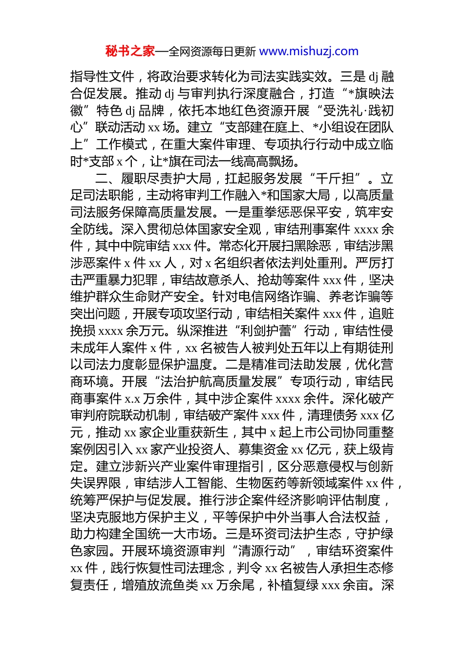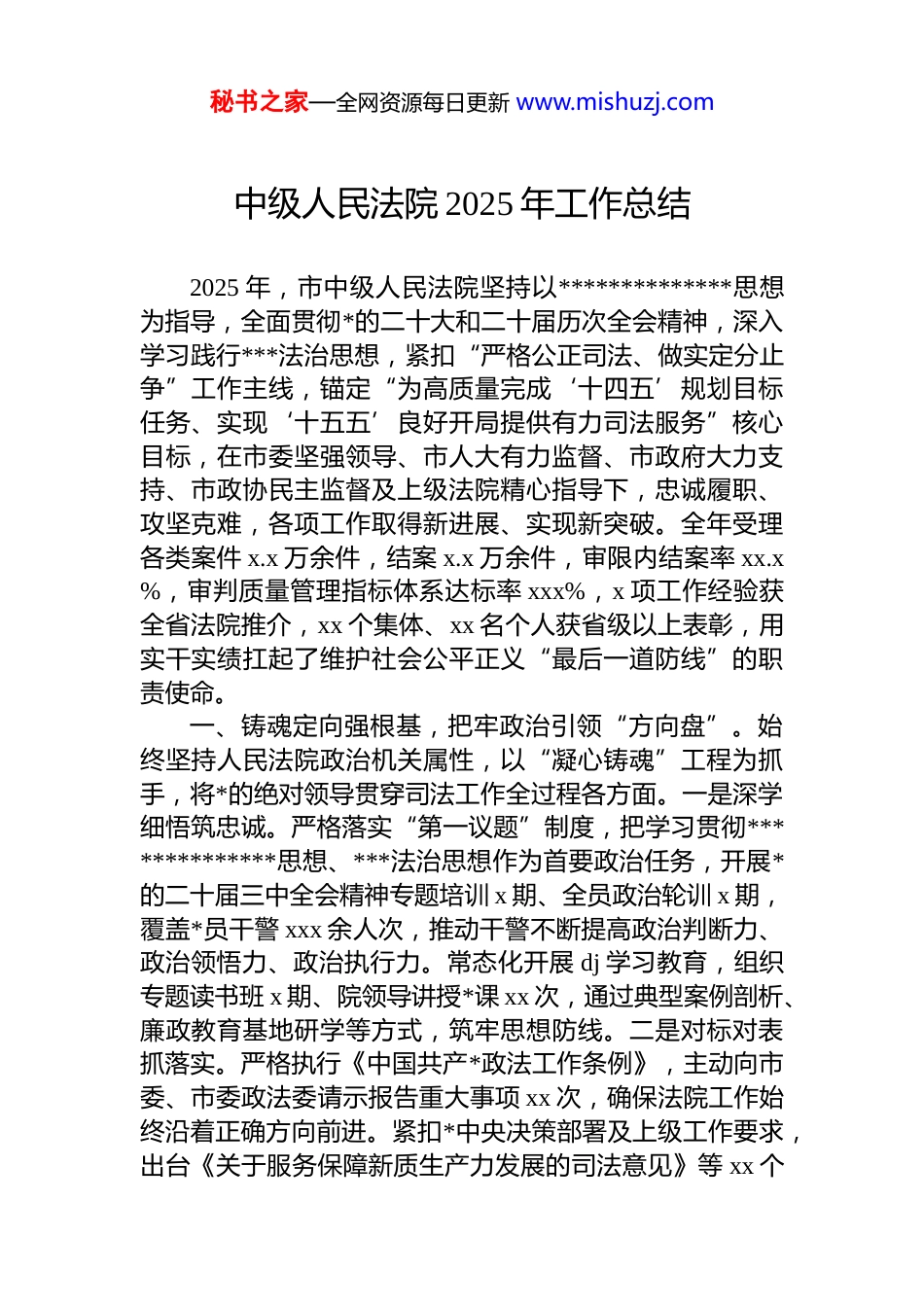 秘书之家—全网资源每日更新 www.mishuzj.com中级人民法院 2025 年工作总结2025 年,市中级人民法院坚持以**************思想为指导,全面贯彻*的二十大和二十届历次全会精神,深入学习践行***法治思想,紧扣“严格公正司法、做实定分止争”工作主线,锚定“为高质量完成‘十四五’规划目标任务、实现‘十五五’良好开局提供有力司法服务”核心目标,在市委坚强领导、市人大有力监督、市政府大力支持、市政协民主监督及上级法院精心指导下,忠诚履职、攻坚克难,各项工作取得新进展、实现新突破。全年受理各类案件 x.x 万余件,结案 x.x 万余件,审限内结案率 xx.x%,审判质量管理指标体系达标率 xxx%,x 项工作经验获全省法院推介,xx 个集体、xx 名个人获省级以上表彰,用实干实绩扛起了维护社会公平正义“最后一道防线”的职责使命。一、铸魂定向强根基,把牢政治引领“方向盘”。始终坚持人民法院政治机关属性,以“凝心铸魂”工程为抓手,将*的绝对领导贯穿司法工作全过程各方面。一是深学细悟筑忠诚。严格落实“第一议题”制度,把学习贯彻**************思想、***法治思想作为首要政治任务,开展*的二十届三中全会精神专题培训 x 期、全员政治轮训 x 期,覆盖*员干警 xxx 余人次,推动干警不断提高政治判断力、政治领悟力、政治执行力。常态化开展 dj 学习教育,组织专题读书班 x 期、院领导讲授*课 xx 次,通过典型案例剖析、廉政教育基地研学等方式,筑牢思想防线。二是对标对表抓落实。严格执行《中国共产*政法工作条例》,主动向市委、市委政法委请示报告重大事项 xx 次,确保法院工作始终沿着正确方向前进。紧扣*中央决策部署及上级工作要求,出台《关于服务保障新质生产力发展的司法意见》等 xx 个秘书之家—全网资源每日更新 www.mishuzj.com指导性文件,将政治要求转化为司法实践实效。三是 dj 融合促发展。推动 dj 与审判执行深度融合,打造“*旗映法徽”特色 dj 品牌,依托本地红色资源开展“受洗礼·践初心”联动活动 xx 场。建立“支部建在庭上、*小组设在团队上”工作模式,在重大案件审理、专项执行行动中成立临时*支部 x 个,让*旗在司法一线高高飘扬。二、履职尽责护大局,扛起服务发展“千斤担”。立足司法职能,主动将审判工作融入*和国家大局,以高质量司法服务保障高质量发展。一是重拳惩恶保平安,筑牢安全防线。深入贯彻总体国家安全观,审结刑事案件 xxxx 余件,其中中院审结 xxx 件。常态化开展扫黑除恶,审结涉黑涉恶案件 x 件 xx 人,对 x 名组织者依法判处重刑。严厉打击严重暴力犯罪,审结故意杀人、抢劫等案件 xxx 件,坚决维护群众生命财产安全。针对电信网络诈骗、养老诈骗等突出问题,开展专项攻坚行动,审结相关案件 xxx 件,追赃挽损 xxxx 余万元。纵深推进“利剑护蕾”行动,审结性侵未成年人案件 x 件,xx 名被告人被判处五年以上有期徒刑以司法力度彰显保护温度。二是精准司法助发展,优化营商环境。开展“法治护航高质量发展”专项行动,审结民商事案件 x.x 万余件,其中涉企案件 xxxx 余件。深化破产审判府院联动机制,审结破产案件 xxx 件,清理债务 xxx 亿元,推动 xx 家企业重获新生,其中 x 起上市公司协同重整案例因引入 xx 家产业投资人、募集资金 xx 亿元,获上级肯定。建立涉新兴产业案件审理指引,区分恶意侵权与创新失误界限,审结涉人工智能、生物医药等新领域案件 xx 件,统筹严保护与促发展。推行涉企案件经济影响评估制度,坚决克服地方保护主义,平等保护中外当事人合法权益,助力构建全国统一大市场。三是环资司法护生态,守护绿色家园。开展环境资源审判“清源行动”,审结环资案件xx 件,践行恢复性司法理念,判令 xx 名被告人承担生态修复责任,增殖放流鱼类 xx 万余尾,补植复绿 xxx 余亩。深秘书之家—全网资源每日更新 www.mishuzj.com化跨区域司法协作,与周边地市法院签署生态保护司法协议,设立 x 个生态司法保护基地,发布 xx 起典型案例,形成“审理一案、教育一片、治理一域”的良好效果。三、司法为民解民...