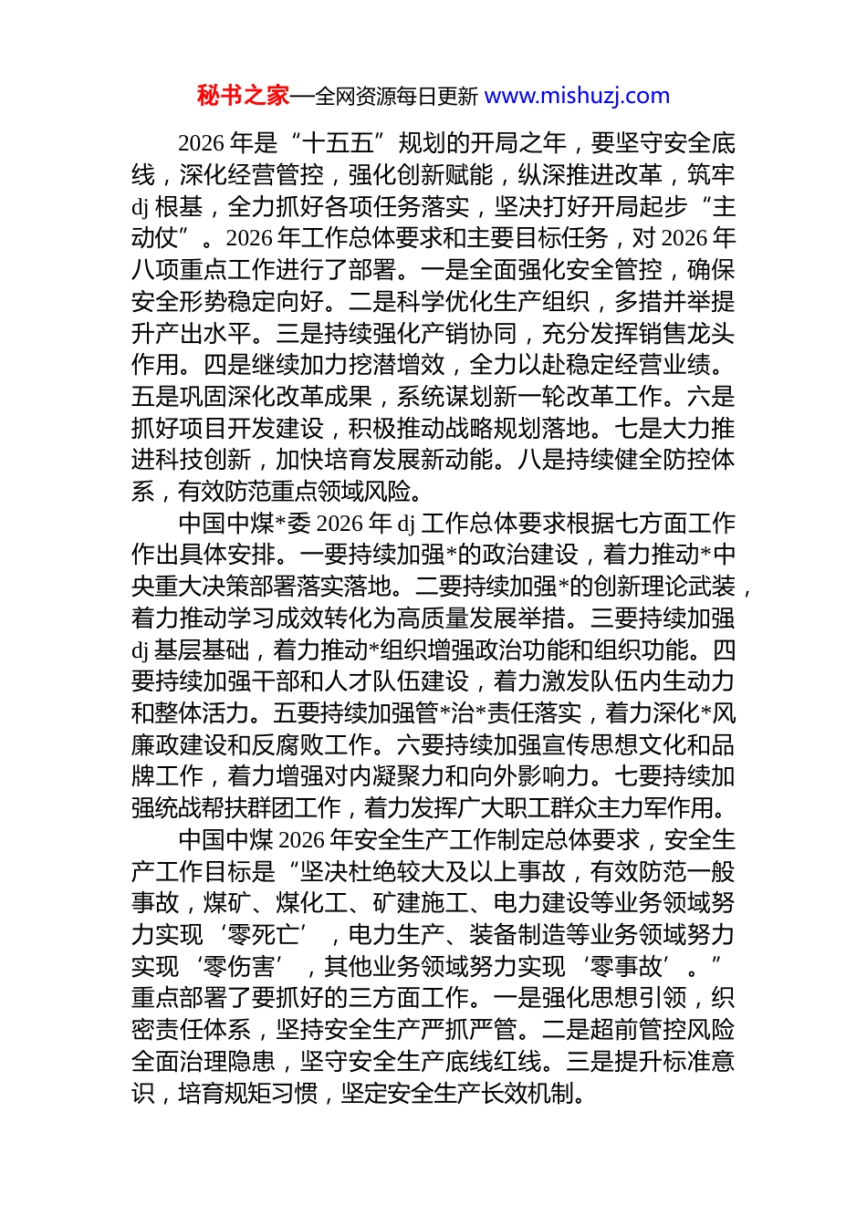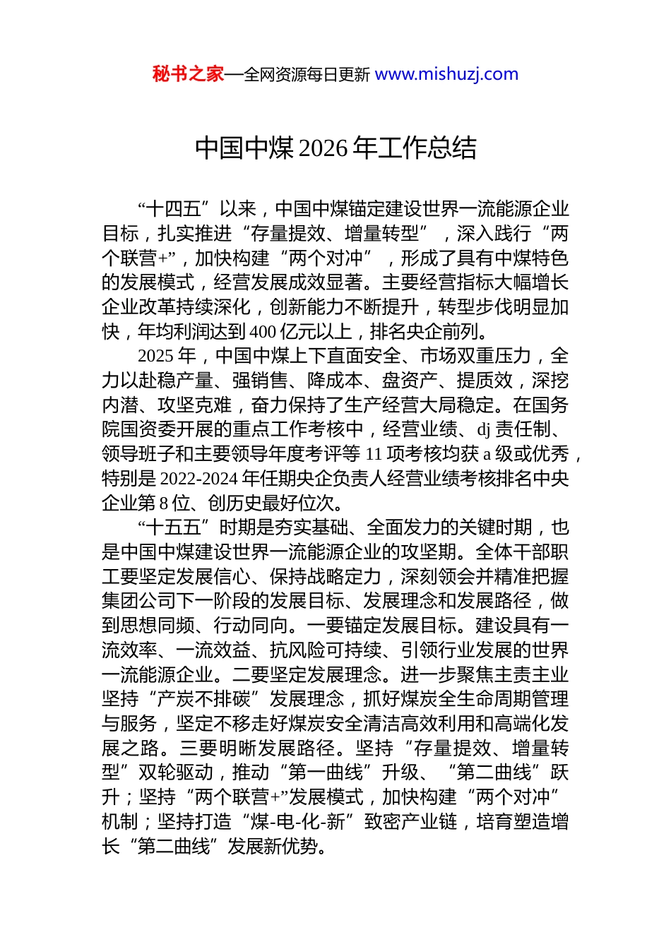 秘书之家—全网资源每日更新 www.mishuzj.com 中国中煤 2026 年工作总结“十四五”以来,中国中煤锚定建设世界一流能源企业目标,扎实推进“存量提效、增量转型”,深入践行“两个联营+”,加快构建“两个对冲”,形成了具有中煤特色的发展模式,经营发展成效显著。主要经营指标大幅增长企业改革持续深化,创新能力不断提升,转型步伐明显加快,年均利润达到 400 亿元以上,排名央企前列。2025 年,中国中煤上下直面安全、市场双重压力,全力以赴稳产量、强销售、降成本、盘资产、提质效,深挖内潜、攻坚克难,奋力保持了生产经营大局稳定。在国务院国资委开展的重点工作考核中,经营业绩、dj 责任制、领导班子和主要领导年度考评等 11 项考核均获 a 级或优秀,特别是 2022-2024 年任期央企负责人经营业绩考核排名中央企业第 8 位、创历史最好位次。“十五五”时期是夯实基础、全面发力的关键时期,也是中国中煤建设世界一流能源企业的攻坚期。全体干部职工要坚定发展信心、保持战略定力,深刻领会并精准把握集团公司下一阶段的发展目标、发展理念和发展路径,做到思想同频、行动同向。一要锚定发展目标。建设具有一流效率、一流效益、抗风险可持续、引领行业发展的世界一流能源企业。二要坚定发展理念。进一步聚焦主责主业坚持“产炭不排碳”发展理念,抓好煤炭全生命周期管理与服务,坚定不移走好煤炭安全清洁高效利用和高端化发展之路。三要明晰发展路径。坚持“存量提效、增量转型”双轮驱动,推动“第一曲线”升级、“第二曲线”跃升;坚持“两个联营+”发展模式,加快构建“两个对冲”机制;坚持打造“煤-电-化-新”致密产业链,培育塑造增长“第二曲线”发展新优势。秘书之家—全网资源每日更新 www.mishuzj.com2026 年是“十五五”规划的开局之年,要坚守安全底线,深化经营管控,强化创新赋能,纵深推进改革,筑牢dj 根基,全力抓好各项任务落实,坚决打好开局起步“主动仗”。2026 年工作总体要求和主要目标任务,对 2026 年八项重点工作进行了部署。一是全面强化安全管控,确保安全形势稳定向好。二是科学优化生产组织,多措并举提升产出水平。三是持续强化产销协同,充分发挥销售龙头作用。四是继续加力挖潜增效,全力以赴稳定经营业绩。五是巩固深化改革成果,系统谋划新一轮改革工作。六是抓好项目开发建设,积极推动战略规划落地。七是大力推进科技创新,加快培育发展新动能。八是持续健全防控体系,有效防范重点领域风险。中国中煤*委 2026 年 dj 工作总体要求根据七方面工作作出具体安排。一要持续加强*的政治建设,着力推动*中央重大决策部署落实落地。二要持续加强*的创新理论武装,着力推动学习成效转化为高质量发展举措。三要持续加强dj 基层基础,着力推动*组织增强政治功能和组织功能。四要持续加强干部和人才队伍建设,着力激发队伍内生动力和整体活力。五要持续加强管*治*责任落实,着力深化*风廉政建设和反腐败工作。六要持续加强宣传思想文化和品牌工作,着力增强对内凝聚力和向外影响力。七要持续加强统战帮扶群团工作,着力发挥广大职工群众主力军作用。中国中煤 2026 年安全生产工作制定总体要求,安全生产工作目标是“坚决杜绝较大及以上事故,有效防范一般事故,煤矿、煤化工、矿建施工、电力建设等业务领域努力实现‘零死亡’,电力生产、装备制造等业务领域努力实现‘零伤害’,其他业务领域努力实现‘零事故’。”重点部署了要抓好的三方面工作。一是强化思想引领,织密责任体系,坚持安全生产严抓严管。二是超前管控风险全面治理隐患,坚守安全生产底线红线。三是提升标准意识,培育规矩习惯,坚定安全生产长效机制。秘书之家—全网资源每日更新 www.mishuzj.com