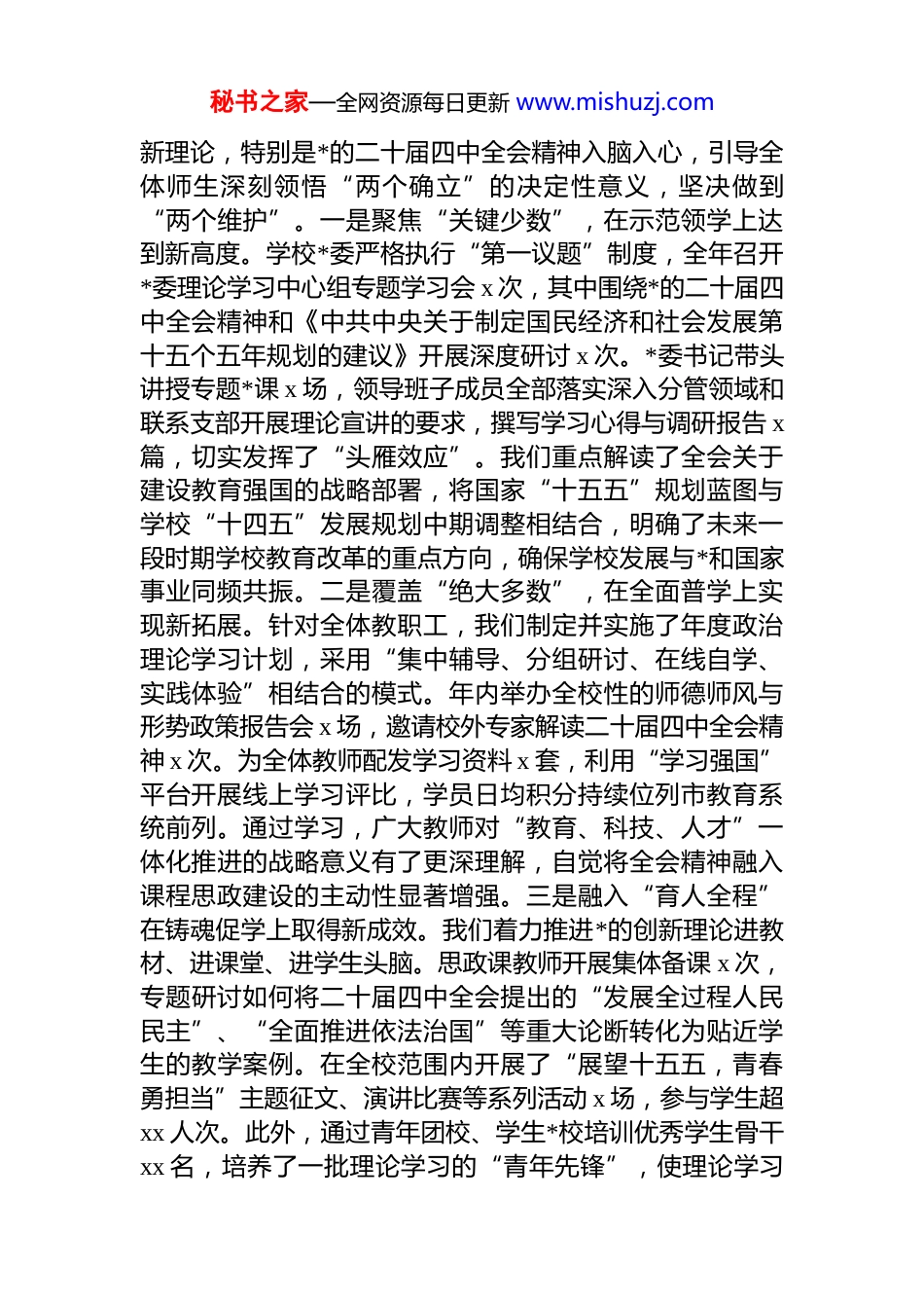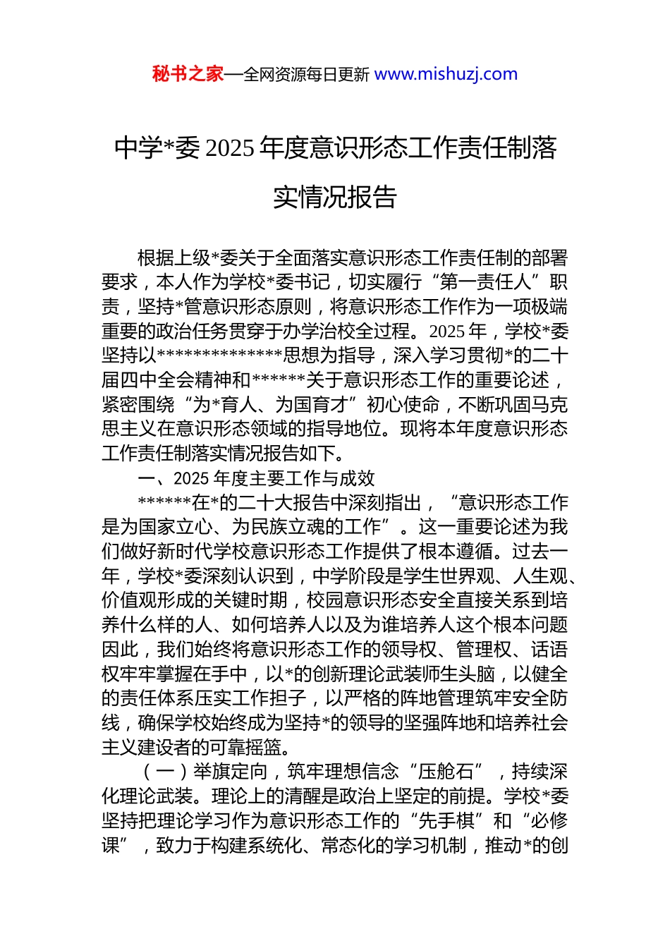 秘书之家—全网资源每日更新 www.mishuzj.com中学*委 2025 年度意识形态工作责任制落实情况报告根据上级*委关于全面落实意识形态工作责任制的部署要求,本人作为学校*委书记,切实履行“第一责任人”职责,坚持*管意识形态原则,将意识形态工作作为一项极端重要的政治任务贯穿于办学治校全过程。2025 年,学校*委坚持以**************思想为指导,深入学习贯彻*的二十届四中全会精神和******关于意识形态工作的重要论述,紧密围绕“为*育人、为国育才”初心使命,不断巩固马克思主义在意识形态领域的指导地位。现将本年度意识形态工作责任制落实情况报告如下。一、2025 年度主要工作与成效******在*的二十大报告中深刻指出,“意识形态工作是为国家立心、为民族立魂的工作”。这一重要论述为我们做好新时代学校意识形态工作提供了根本遵循。过去一年,学校*委深刻认识到,中学阶段是学生世界观、人生观、价值观形成的关键时期,校园意识形态安全直接关系到培养什么样的人、如何培养人以及为谁培养人这个根本问题因此,我们始终将意识形态工作的领导权、管理权、话语权牢牢掌握在手中,以*的创新理论武装师生头脑,以健全的责任体系压实工作担子,以严格的阵地管理筑牢安全防线,确保学校始终成为坚持*的领导的坚强阵地和培养社会主义建设者的可靠摇篮。(一)举旗定向,筑牢理想信念“压舱石”,持续深化理论武装。理论上的清醒是政治上坚定的前提。学校*委坚持把理论学习作为意识形态工作的“先手棋”和“必修课”,致力于构建系统化、常态化的学习机制,推动*的创秘书之家—全网资源每日更新 www.mishuzj.com新理论,特别是*的二十届四中全会精神入脑入心,引导全体师生深刻领悟“两个确立”的决定性意义,坚决做到“两个维护”。一是聚焦“关键少数”,在示范领学上达到新高度。学校*委严格执行“第一议题”制度,全年召开*委理论学习中心组专题学习会 x 次,其中围绕*的二十届四中全会精神和《中共中央关于制定国民经济和社会发展第十五个五年规划的建议》开展深度研讨 x 次。*委书记带头讲授专题*课 x 场,领导班子成员全部落实深入分管领域和联系支部开展理论宣讲的要求,撰写学习心得与调研报告 x篇,切实发挥了“头雁效应”。我们重点解读了全会关于建设教育强国的战略部署,将国家“十五五”规划蓝图与学校“十四五”发展规划中期调整相结合,明确了未来一段时期学校教育改革的重点方向,确保学校发展与*和国家事业同频共振。二是覆盖“绝大多数”,在全面普学上实现新拓展。针对全体教职工,我们制定并实施了年度政治理论学习计划,采用“集中辅导、分组研讨、在线自学、实践体验”相结合的模式。年内举办全校性的师德师风与形势政策报告会 x 场,邀请校外专家解读二十届四中全会精神 x 次。为全体教师配发学习资料 x 套,利用“学习强国”平台开展线上学习评比,学员日均积分持续位列市教育系统前列。通过学习,广大教师对“教育、科技、人才”一体化推进的战略意义有了更深理解,自觉将全会精神融入课程思政建设的主动性显著增强。三是融入“育人全程”在铸魂促学上取得新成效。我们着力推进*的创新理论进教材、进课堂、进学生头脑。思政课教师开展集体备课 x 次,专题研讨如何将二十届四中全会提出的“发展全过程人民民主”、“全面推进依法治国”等重大论断转化为贴近学生的教学案例。在全校范围内开展了“展望十五五,青春勇担当”主题征文、演讲比赛等系列活动 x 场,参与学生超xx 人次。此外,通过青年团校、学生*校培训优秀学生骨干xx 名,培养了一批理论学习的“青年先锋”,使理论学习秘书之家—全网资源每日更新 www.mishuzj.com在青年学生中呈现出从“被动接受”到“主动探寻”的可喜转变。(二)立柱架梁,织密责任落实“制度网”,全面强化阵地管控。制度管根本、管长远。学校*委牢固树立“抓意识形态工作是本职、不抓是失职、抓不好是渎职”的理念,通过完善制度体系和责任链条,将意识形态工作要求精准嵌入教育教学、管理服务各环节,实现对各类阵地的可管可控,坚决防范化解各类风险隐患。一是健全责任体系,压实“一岗双责...