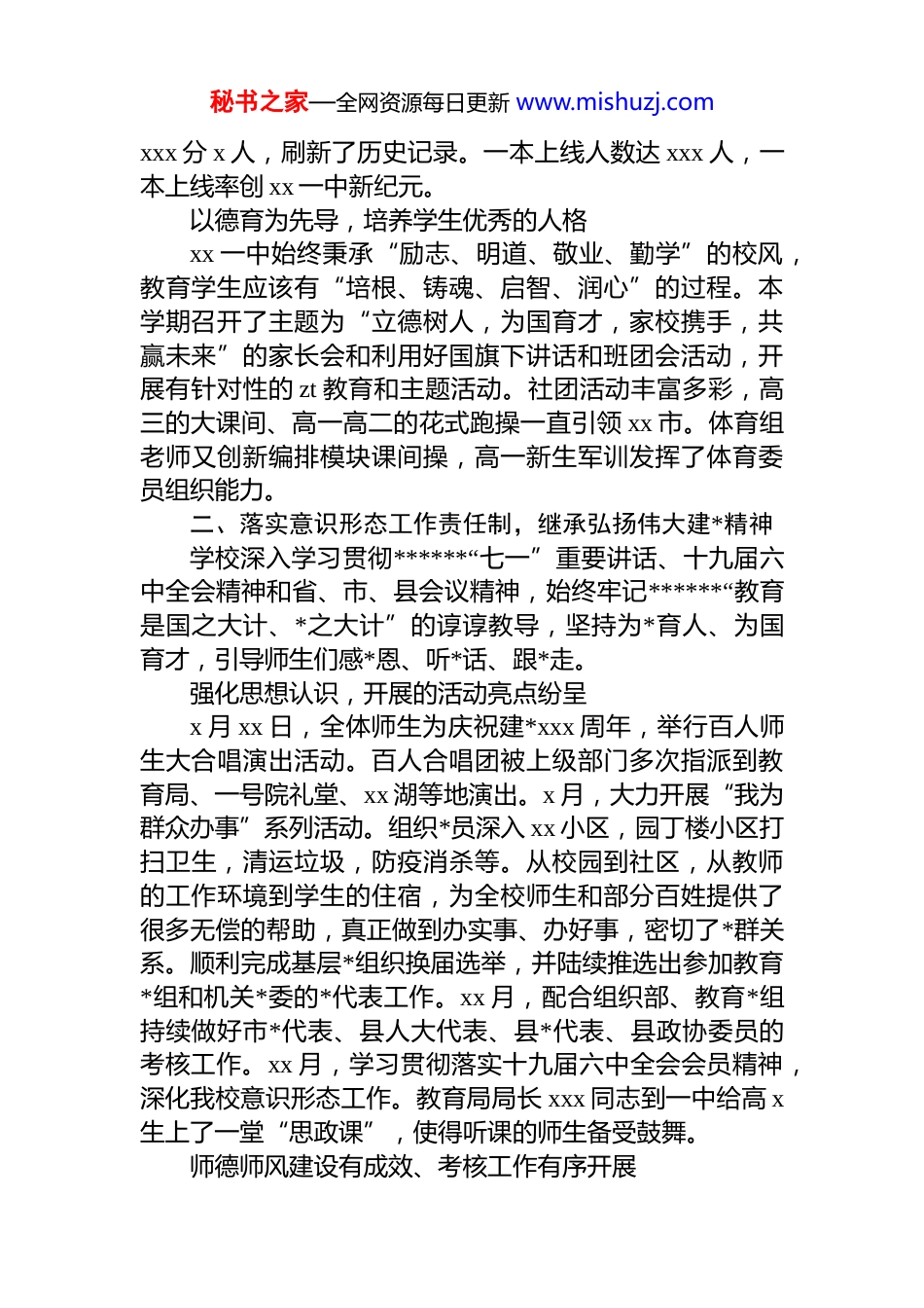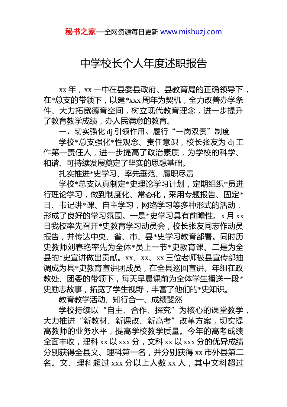 秘书之家—全网资源每日更新 www.mishuzj.com中学校长个人年度述职报告xx 年,xx 一中在县委县政府、县教育局的正确领导下,在*总支的带领下,以建*xxx 周年为契机,全力改善办学条件、大力拓宽德育空间,树立现代教育理念,进一步提升了教育教学成绩,办人民满意的教育。一、切实强化 dj 引领作用、履行“一岗双责”制度学校*总支强化*性观念、责任意识,校长张友为 dj 工作第一责任人,进一步提高了政治素质,为学校的科学、和谐、可持续发展奠定了坚实的思想基础。扎实推进*史学习、率先垂范、履职尽责学校*总支认真制定*史理论学习计划,定期组织*员进行理论学习,做到制度化、常态化,采用专题报告、固定*日、书记讲*课、自主学习,网络学习等多种形式的活动,形成了良好的学习氛围。一是*史学习具有前瞻性。x 月 xx日我校率先召开*史教育学习动员会,校长张友同志作动员报告,并传达中央、省、市、县*史学习教育部署。同时历史教师刘春艳率先为全体*员上一节*史教育课。二是为全县的*史宣讲做出贡献。xx、xx、xx 三位老师被县宣传部抽调成为县*史教育宣讲团成员,在全县巡回宣讲。年组在政教处、团委的带领下,每天早晨课前为全体学生播送一段*史励志故事,拓宽了学生视野,丰富了他们的*史知识。教育教学活动、知行合一、成绩斐然学校持续以“自主、合作、探究”为核心的课堂教学,大力推进“新教材、新课改、新高考”改革方案,切实提高教师的业务水平,提高学校教学质量。今年的高考成绩全面丰收,理科 xx 以 xxx 分,文科 xx 以 xxx 分的优异成绩分别获得全县文、理科第一名,并分别获得 xx 市外县第二名。文、理科超过 xxx 分以上人数 xx 人,其中文科超过秘书之家—全网资源每日更新 www.mishuzj.comxxx 分 x 人,刷新了历史记录。一本上线人数达 xxx 人,一本上线率创 xx 一中新纪元。以德育为先导,培养学生优秀的人格xx 一中始终秉承“励志、明道、敬业、勤学”的校风,教育学生应该有“培根、铸魂、启智、润心”的过程。本学期召开了主题为“立德树人,为国育才,家校携手,共赢未来”的家长会和利用好国旗下讲话和班团会活动,开展有针对性的 zt 教育和主题活动。社团活动丰富多彩,高三的大课间、高一高二的花式跑操一直引领 xx 市。体育组老师又创新编排模块课间操,高一新生军训发挥了体育委员组织能力。二、落实意识形态工作责任制,继承弘扬伟大建*精神学校深入学习贯彻******“七一”重要讲话、十九届六中全会精神和省、市、县会议精神,始终牢记******“教育是国之大计、*之大计”的谆谆教导,坚持为*育人、为国育才,引导师生们感*恩、听*话、跟*走。强化思想认识,开展的活动亮点纷呈x 月 xx 日,全体师生为庆祝建*xxx 周年,举行百人师生大合唱演出活动。百人合唱团被上级部门多次指派到教育局、一号院礼堂、xx 湖等地演出。x 月,大力开展“我为群众办事”系列活动。组织*员深入 xx 小区,园丁楼小区打扫卫生,清运垃圾,防疫消杀等。从校园到社区,从教师的工作环境到学生的住宿,为全校师生和部分百姓提供了很多无偿的帮助,真正做到办实事、办好事,密切了*群关系。顺利完成基层*组织换届选举,并陆续推选出参加教育*组和机关*委的*代表工作。xx 月,配合组织部、教育*组持续做好市*代表、县人大代表、县*代表、县政协委员的考核工作。xx 月,学习贯彻落实十九届六中全会会员精神,深化我校意识形态工作。教育局局长 xxx 同志到一中给高 x生上了一堂“思政课”,使得听课的师生备受鼓舞。师德师风建设有成效、考核工作有序开展秘书之家—全网资源每日更新 www.mishuzj.com实行师德师风建设责任制和责任追究制度,对违反师德规范的要予以批评教育,情节严重的要给予行政处分。同时开展师德师风演讲活动,挖掘身边的教师先进及感人的事迹。不断端正从教思想,增强教师责任意识,做到为人师表。加强教师考核工作,对教师德、能、勤、绩进行细化考核,学期汇总,有序排列,促进教师适应竞争,形成比学赶超的良好氛围。三、持之以恒抓好班子政治建设,推进作风建设围绕增强“四个意识”加强学校政...
