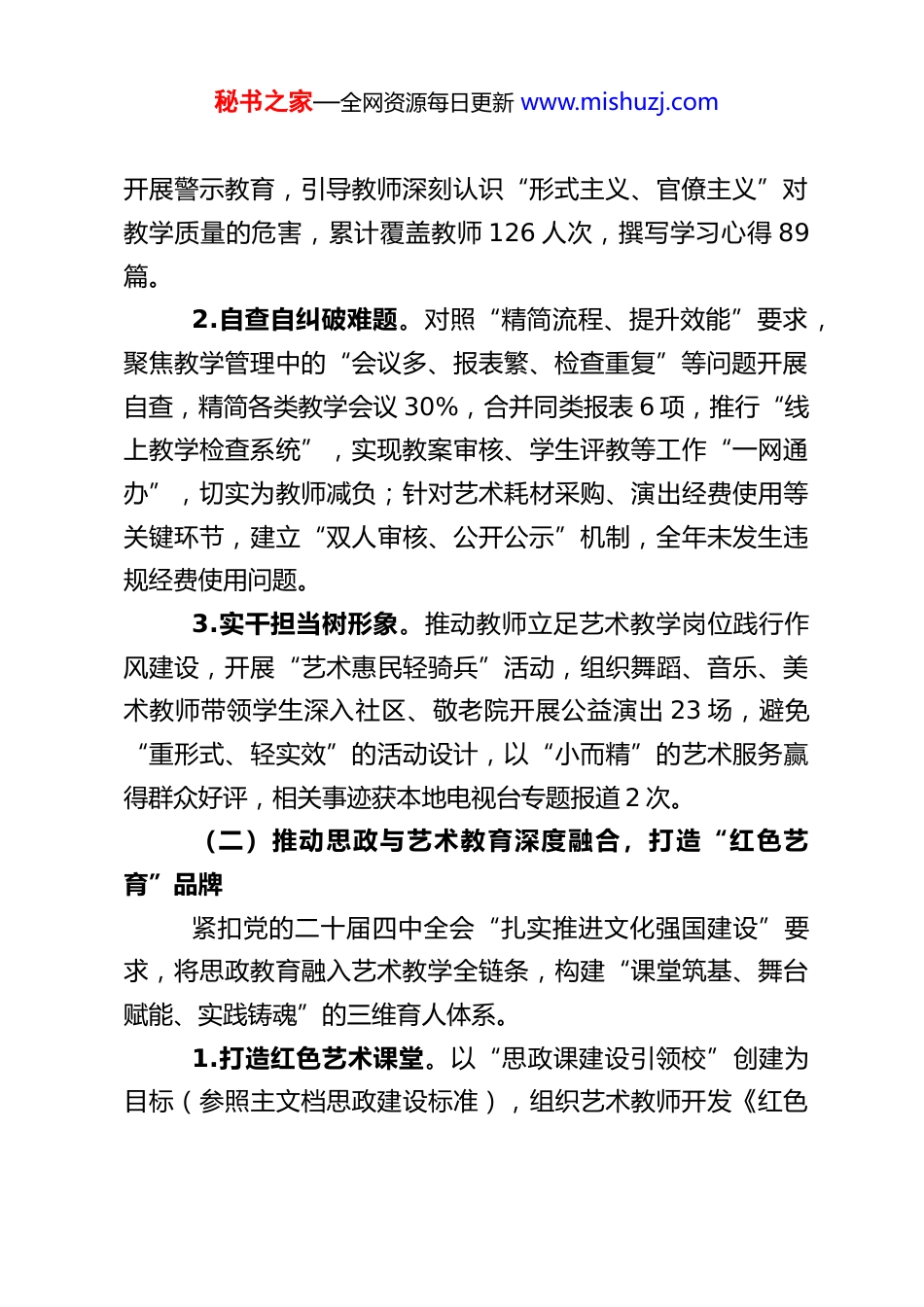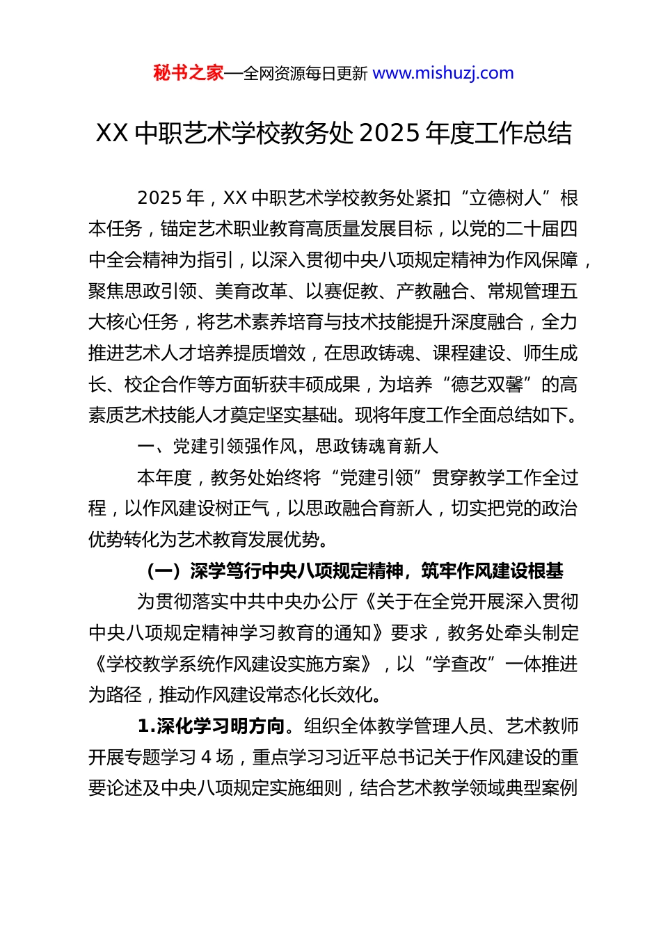 秘书之家—全网资源每日更新 www.mishuzj.comXX 中职艺术学校教务处 2025 年度工作总结2025 年,XX 中职艺术学校教务处紧扣“立德树人”根本任务,锚定艺术职业教育高质量发展目标,以党的二十届四中全会精神为指引,以深入贯彻中央八项规定精神为作风保障,聚焦思政引领、美育改革、以赛促教、产教融合、常规管理五大核心任务,将艺术素养培育与技术技能提升深度融合,全力推进艺术人才培养提质增效,在思政铸魂、课程建设、师生成长、校企合作等方面斩获丰硕成果,为培养“德艺双馨”的高素质艺术技能人才奠定坚实基础。现将年度工作全面总结如下。一、党建引领强作风,思政铸魂育新人本年度,教务处始终将“党建引领”贯穿教学工作全过程,以作风建设树正气,以思政融合育新人,切实把党的政治优势转化为艺术教育发展优势。(一)深学笃行中央八项规定精神,筑牢作风建设根基为贯彻落实中共中央办公厅《关于在全党开展深入贯彻中央八项规定精神学习教育的通知》要求,教务处牵头制定《学校教学系统作风建设实施方案》,以“学查改”一体推进为路径,推动作风建设常态化长效化。 1.深化学习明方向。组织全体教学管理人员、艺术教师开展专题学习 4 场,重点学习习近平总书记关于作风建设的重要论述及中央八项规定实施细则,结合艺术教学领域典型案例秘书之家—全网资源每日更新 www.mishuzj.com开展警示教育,引导教师深刻认识“形式主义、官僚主义”对教学质量的危害,累计覆盖教师 126 人次,撰写学习心得 89篇。 2.自查自纠破难题。对照“精简流程、提升效能”要求,聚焦教学管理中的“会议多、报表繁、检查重复”等问题开展自查,精简各类教学会议 30%,合并同类报表 6 项,推行“线上教学检查系统”,实现教案审核、学生评教等工作“一网通办”,切实为教师减负;针对艺术耗材采购、演出经费使用等关键环节,建立“双人审核、公开公示”机制,全年未发生违规经费使用问题。 3.实干担当树形象。推动教师立足艺术教学岗位践行作风建设,开展“艺术惠民轻骑兵”活动,组织舞蹈、音乐、美术教师带领学生深入社区、敬老院开展公益演出 23 场,避免“重形式、轻实效”的活动设计,以“小而精”的艺术服务赢得群众好评,相关事迹获本地电视台专题报道 2 次。(二)推动思政与艺术教育深度融合,打造“红色艺育”品牌紧扣党的二十届四中全会“扎实推进文化强国建设”要求,将思政教育融入艺术教学全链条,构建“课堂筑基、舞台赋能、实践铸魂”的三维育人体系。 1.打造红色艺术课堂。以“思政课建设引领校”创建为目标(参照主文档思政建设标准),组织艺术教师开发《红色秘书之家—全网资源每日更新 www.mishuzj.com舞蹈赏析》《红色歌曲创作》等 12 门校本课程,深挖地方红色资源——如将本地抗日时期的“战地宣传队”故事改编为情景剧,融入戏剧表演课程;在美术课程中开展“红色主题绘画创作”,学生作品《星火相传》获省级思政类艺术竞赛二等奖。 2.构建全员育人生态。建立“党委统筹、教务处牵头、艺术教师全员参与”的思政工作机制,将“思政教学成效”纳入教师教学业绩考核(参照主文档《教师教学业绩考核办法》),考核指标涵盖“红色课程开发、思政类竞赛指导”等内容,全年教师参与思政教学研讨 28 次,形成省市级思政教育课题 3 项、论文 5 篇,学生思政课满意度达 96%。 3.以实践厚植家国情怀。组织学生参与“庆祝新中国成立 76 周年”文艺汇演、“乡村振兴主题艺术展”等实践活动,其中舞蹈社团编排的《绿水青山》获市级群众文艺汇演金奖;数字媒体专业学生制作的“非遗文化传承”系列短视频,全网播放量超 50 万,助力传统文化传播,践行二十届四中全会“提升社会文明程度”的要求。二、美育改革提质效,课程建设显特色作为中职艺术学校,教务处始终以“美育”为核心抓手,对标《中小学生艺术素质测评办法》(参照东营区、夏津县美育标准),从课程体系、教学模式、师资建设三方面发力,打造具有辨识度的艺术教育品牌。秘书之家—全网资源每日更新 www.mishuzj.com(一)构建“基础+特色+创新”的美育课程体系严格执行国家课...