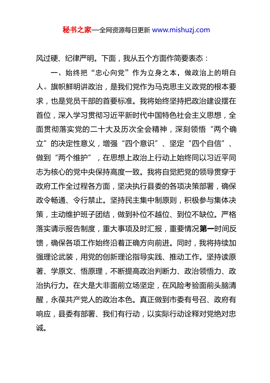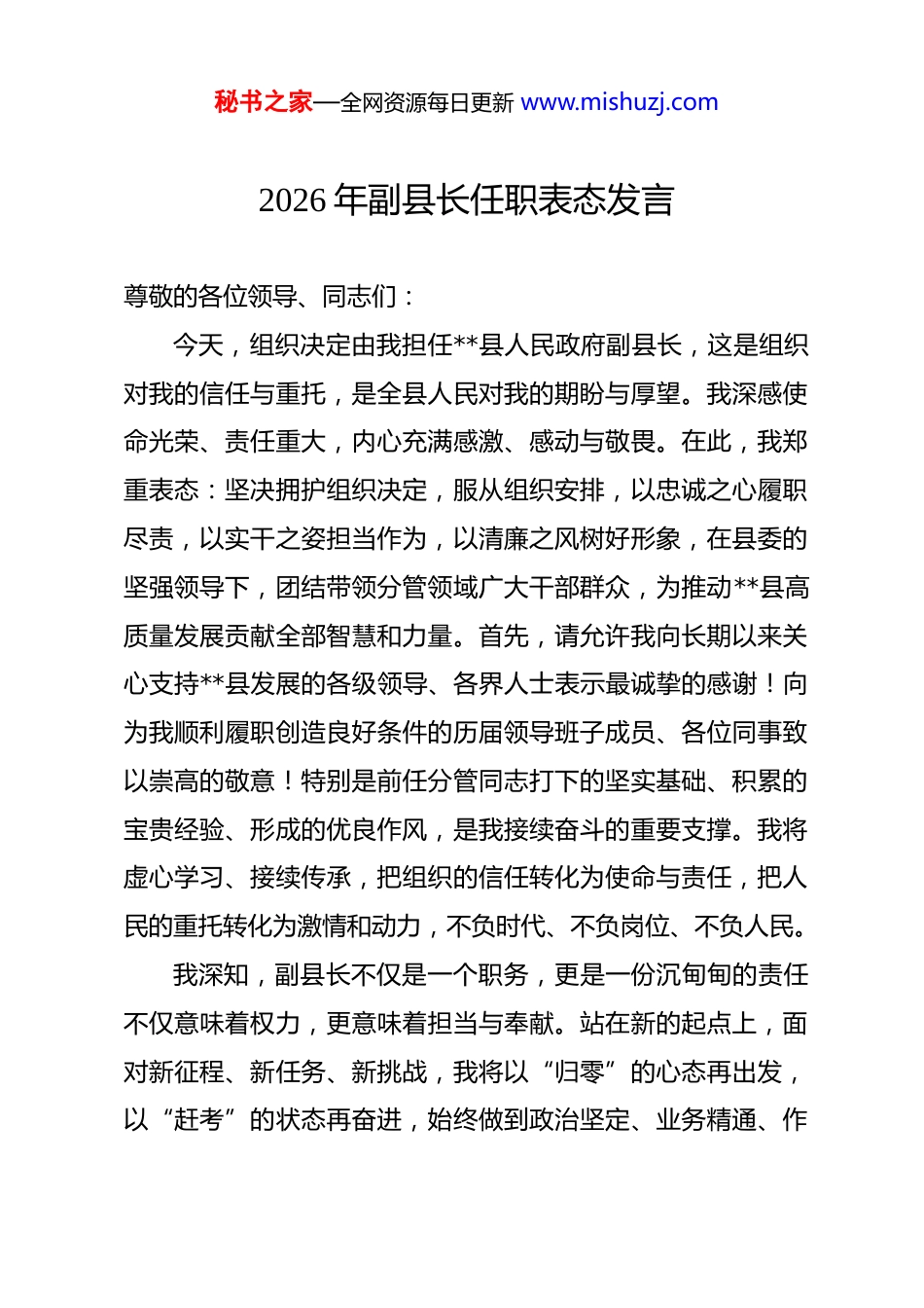 秘书之家—全网资源每日更新 www.mishuzj.com2026 年副县长任职表态发言 尊敬的各位领导、同志们:今天,组织决定由我担任**县人民政府副县长,这是组织对我的信任与重托,是全县人民对我的期盼与厚望。我深感使命光荣、责任重大,内心充满感激、感动与敬畏。在此,我郑重表态:坚决拥护组织决定,服从组织安排,以忠诚之心履职尽责,以实干之姿担当作为,以清廉之风树好形象,在县委的坚强领导下,团结带领分管领域广大干部群众,为推动**县高质量发展贡献全部智慧和力量。首先,请允许我向长期以来关心支持**县发展的各级领导、各界人士表示最诚挚的感谢!向为我顺利履职创造良好条件的历届领导班子成员、各位同事致以崇高的敬意!特别是前任分管同志打下的坚实基础、积累的宝贵经验、形成的优良作风,是我接续奋斗的重要支撑。我将虚心学习、接续传承,把组织的信任转化为使命与责任,把人民的重托转化为激情和动力,不负时代、不负岗位、不负人民。我深知,副县长不仅是一个职务,更是一份沉甸甸的责任不仅意味着权力,更意味着担当与奉献。站在新的起点上,面对新征程、新任务、新挑战,我将以“归零”的心态再出发,以“赶考”的状态再奋进,始终做到政治坚定、业务精通、作秘书之家—全网资源每日更新 www.mishuzj.com风过硬、纪律严明。下面,我从五个方面作简要表态:一、始终把“忠心向党”作为立身之本,做政治上的明白人。旗帜鲜明讲政治,是我们党作为马克思主义政党的根本要求,也是党员干部的首要标准。我将始终坚持把政治建设摆在首位,深入学习贯彻习近平新时代中国特色社会主义思想,全面贯彻落实党的二十大及历次全会精神,深刻领悟“两个确立”的决定性意义,增强“四个意识”、坚定“四个自信”、做到“两个维护”,在思想上政治上行动上始终同以习近平同志为核心的党中央保持高度一致。我将自觉把党的领导贯穿于政府工作全过程各方面,坚决执行县委的各项决策部署,确保政令畅通、令行禁止。坚持民主集中制原则,积极参与集体决策,主动维护班子团结,做到补位不越位、到位不缺位。严格落实请示报告制度,重大事项及时汇报,重要情况第一时间反馈,确保各项工作始终沿着正确方向前进。同时,我将持续加强理论武装,用党的创新理论指导实践、推动工作。坚持读原著、学原文、悟原理,不断提高政治判断力、政治领悟力、政治执行力。在大是大非面前立场坚定,在风险考验面前头脑清醒,永葆共产党人的政治本色。真正做到市委有号召、政府有响应,县委有部署、我们有行动,以实际行动诠释对党绝对忠诚。秘书之家—全网资源每日更新 www.mishuzj.com二、始终把“一往无前担当”作为成事之基,做服务大局的实干家。空谈误国,实干兴邦。作为新任副县长,我深知唯有实干才能成就事业,唯有担当才能赢得未来。当前,**县正处于转型升级、爬坡过坎的关键时期,既面临难得的发展机遇,也面临诸多困难挑战。我将以“功成不必在我”的精神境界和“功成必定有我”的历史担当,聚焦县委、县政府确定的中心任务和发展目标,全力以赴抓好分管领域的各项工作。围绕“高质量发展”这一首要任务,我将紧扣县域经济发展实际,立足资源禀赋和产业基础,着力在以下几个方面下功夫:一是聚力产业升级,夯实发展根基。聚焦现代农业提质增效,加快推进高标准农田建设,大力发展特色种养业、农产品精深加工和农村电商,打造一批具有地域特色的农业品牌。积极培育新兴产业,支持传统产业智能化、绿色化改造,推动产业链延伸、价值链提升。强化招商引资“一号工程”,紧盯重点区域、重点领域,精准对接优质项目,力争引进一批带动性强、科技含量高、发展前景好的重大项目落地见效。二是聚力项目建设,增强发展后劲。牢固树立“项目为王”理念,健全完善重点项目包保责任制,全过程跟踪服务,全流程优化审批,全要素保障供给,推动在建项目早竣工、签约项目早开工、谋划项目早落地。特别要在交通基础设施、水利设施、能源保障等领域加秘书之家—全网资源每日更新 www.mishuzj.com大投入力度,补齐发展短板,提升承载能力。三是聚力改革创新,激发内生动力。深化“放管服”改革,持续推...