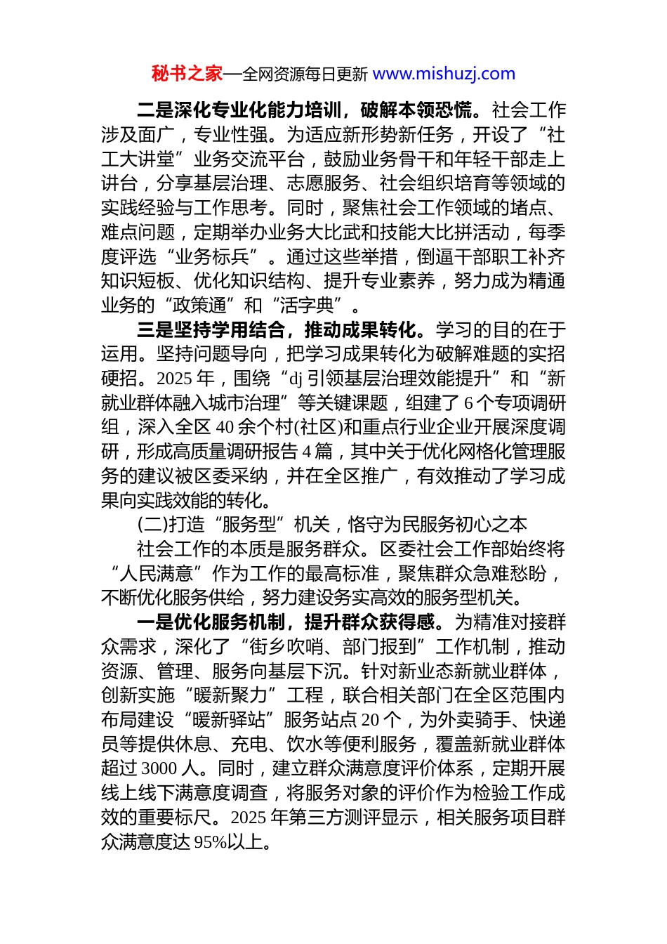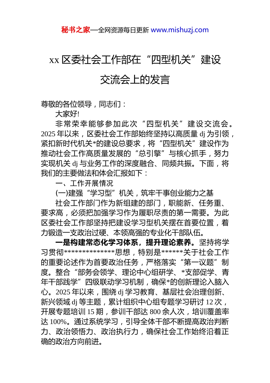 秘书之家—全网资源每日更新 www.mishuzj.comxx 区委社会工作部在“四型机关”建设交流会上的发言尊敬的各位领导,同志们:大家好!非常荣幸能够参加此次“四型机关”建设交流会 。2025 年以来,区委社会工作部始终坚持以高质量 dj 为引领,紧扣新时代机关*的建设总要求,将“四型机关”建设作为推动社会工作高质量发展的“总引擎”与核心抓手,努力实现机关 dj 与业务工作的深度融合、同频共振。下面,将我们的主要做法和体会汇报如下:一、工作开展情况(一)建强“学习型”机关,筑牢干事创业能力之基社会工作部门作为新组建的部门,职能新、任务重、要求高,必须把加强学习作为履职尽责的第一需要。为此区委社会工作部坚持把建设学习型机关摆在首要位置,着力锻造一支政治过硬、本领高强的专业化干部队伍。一是构建常态化学习体系,提升理论素养。坚持将学习贯彻**************思想,特别是******关于社会工作的重要论述作为首要政治任务,严格落实“第一议题”制度。整合“部务会领学、理论中心组研学、*支部促学、青年干部践学”四级联动学习机制,确保*的创新理论入脑入心。2025 年以来,围绕 dj 学习教育、基层社会治理创新、新兴领域 dj 等主题,累计组织中心组专题学习研讨 12 次,开展专题培训 15 期,参训干部达 800 余人次,培训覆盖率达 100%。通过系统学习,引导全体干部不断提高政治判断力、政治领悟力、政治执行力,确保社会工作始终沿着正确的政治方向前进。秘书之家—全网资源每日更新 www.mishuzj.com二是深化专业化能力培训,破解本领恐慌。社会工作涉及面广,专业性强。为适应新形势新任务,开设了“社工大讲堂”业务交流平台,鼓励业务骨干和年轻干部走上讲台,分享基层治理、志愿服务、社会组织培育等领域的实践经验与工作思考。同时,聚焦社会工作领域的堵点、难点问题,定期举办业务大比武和技能大比拼活动,每季度评选“业务标兵”。通过这些举措,倒逼干部职工补齐知识短板、优化知识结构、提升专业素养,努力成为精通业务的“政策通”和“活字典”。三是坚持学用结合,推动成果转化。学习的目的在于运用。坚持问题导向,把学习成果转化为破解难题的实招硬招。2025 年,围绕“dj 引领基层治理效能提升”和“新就业群体融入城市治理”等关键课题,组建了 6 个专项调研组,深入全区 40 余个村(社区)和重点行业企业开展深度调研,形成高质量调研报告 4 篇,其中关于优化网格化管理服务的建议被区委采纳,并在全区推广,有效推动了学习成果向实践效能的转化。(二)打造“服务型”机关,恪守为民服务初心之本社会工作的本质是服务群众。区委社会工作部始终将“人民满意”作为工作的最高标准,聚焦群众急难愁盼,不断优化服务供给,努力建设务实高效的服务型机关。一是优化服务机制,提升群众获得感。为精准对接群众需求,深化了“街乡吹哨、部门报到”工作机制,推动资源、管理、服务向基层下沉。针对新业态新就业群体,创新实施“暖新聚力”工程,联合相关部门在全区范围内布局建设“暖新驿站”服务站点 20 个,为外卖骑手、快递员等提供休息、充电、饮水等便利服务,覆盖新就业群体超过 3000 人。同时,建立群众满意度评价体系,定期开展线上线下满意度调查,将服务对象的评价作为检验工作成效的重要标尺。2025 年第三方测评显示,相关服务项目群众满意度达 95%以上。秘书之家—全网资源每日更新 www.mishuzj.com二是聚焦重点群体,提供精准化服务。紧扣“一老一小”等重点群体的服务需求,积极推动社会服务项目化运作。联合民政、卫健等部门,成功申报并实施了“银龄守护”智慧养老服务项目,为全区 500 户特殊困难老年人家庭进行适老化改造,并接入智能化居家养老信息服务平台,提供紧急呼叫、健康监测等服务。针对困境儿童,依托“儿童之家”阵地,引入专业社会工作机构,开展“护苗成长”计划,为 120 名困境儿童提供心理疏导、学业辅导、兴趣培养等常态化关爱服务,切实把*的关怀和温暖送到群众心坎上。三是建强服务队伍,夯实基层力量。服务群众离不开一支高素质的专业队伍。持续加强对社区工作者和志愿者的赋...
