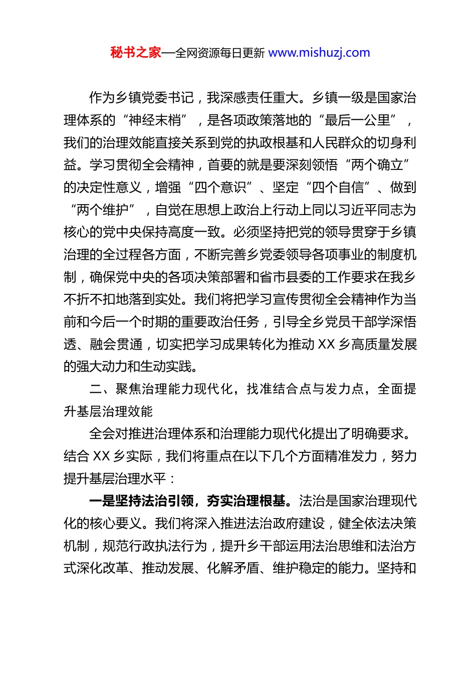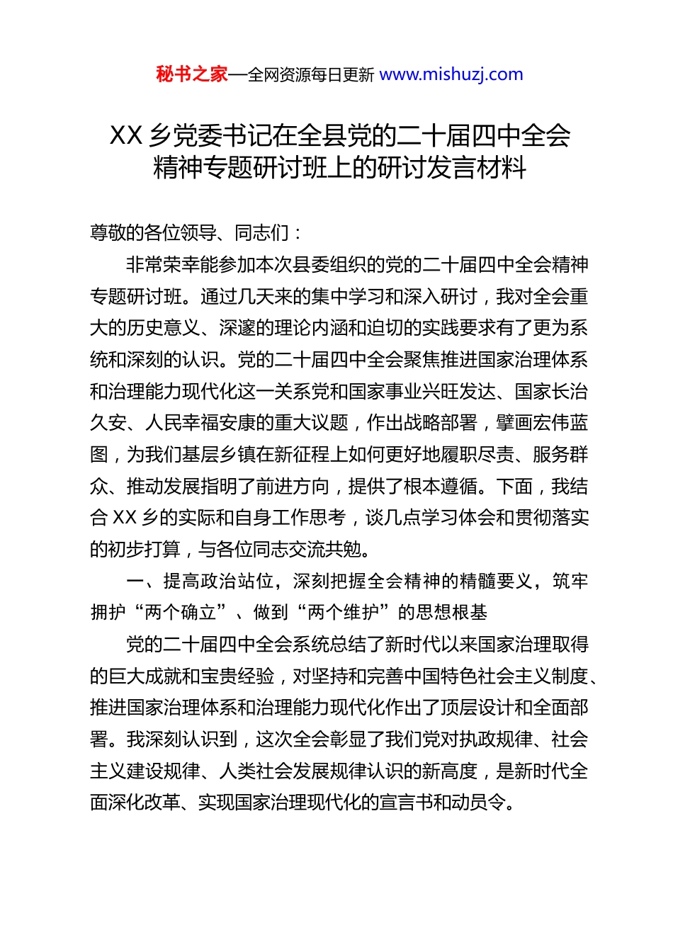 秘书之家—全网资源每日更新 www.mishuzj.comXX 乡党委书记在全县党的二十届四中全会精神专题研讨班上的研讨发言材料尊敬的各位领导、同志们:非常荣幸能参加本次县委组织的党的二十届四中全会精神专题研讨班。通过几天来的集中学习和深入研讨,我对全会重大的历史意义、深邃的理论内涵和迫切的实践要求有了更为系统和深刻的认识。党的二十届四中全会聚焦推进国家治理体系和治理能力现代化这一关系党和国家事业兴旺发达、国家长治久安、人民幸福安康的重大议题,作出战略部署,擘画宏伟蓝图,为我们基层乡镇在新征程上如何更好地履职尽责、服务群众、推动发展指明了前进方向,提供了根本遵循。下面,我结合 XX 乡的实际和自身工作思考,谈几点学习体会和贯彻落实的初步打算,与各位同志交流共勉。一、提高政治站位,深刻把握全会精神的精髓要义,筑牢拥护“两个确立”、做到“两个维护”的思想根基党的二十届四中全会系统总结了新时代以来国家治理取得的巨大成就和宝贵经验,对坚持和完善中国特色社会主义制度、推进国家治理体系和治理能力现代化作出了顶层设计和全面部署。我深刻认识到,这次全会彰显了我们党对执政规律、社会主义建设规律、人类社会发展规律认识的新高度,是新时代全面深化改革、实现国家治理现代化的宣言书和动员令。秘书之家—全网资源每日更新 www.mishuzj.com作为乡镇党委书记,我深感责任重大。乡镇一级是国家治理体系的“神经末梢”,是各项政策落地的“最后一公里”,我们的治理效能直接关系到党的执政根基和人民群众的切身利益。学习贯彻全会精神,首要的就是要深刻领悟“两个确立”的决定性意义,增强“四个意识”、坚定“四个自信”、做到“两个维护”,自觉在思想上政治上行动上同以习近平同志为核心的党中央保持高度一致。必须坚持把党的领导贯穿于乡镇治理的全过程各方面,不断完善乡党委领导各项事业的制度机制,确保党中央的各项决策部署和省市县委的工作要求在我乡不折不扣地落到实处。我们将把学习宣传贯彻全会精神作为当前和今后一个时期的重要政治任务,引导全乡党员干部学深悟透、融会贯通,切实把学习成果转化为推动 XX 乡高质量发展的强大动力和生动实践。二、聚焦治理能力现代化,找准结合点与发力点,全面提升基层治理效能全会对推进治理体系和治理能力现代化提出了明确要求。结合 XX 乡实际,我们将重点在以下几个方面精准发力,努力提升基层治理水平:一是坚持法治引领,夯实治理根基。法治是国家治理现代化的核心要义。我们将深入推进法治政府建设,健全依法决策机制,规范行政执法行为,提升乡干部运用法治思维和法治方式深化改革、推动发展、化解矛盾、维护稳定的能力。坚持和秘书之家—全网资源每日更新 www.mishuzj.com完善人民代表大会制度,全力支持乡人大依法行使监督权、决定权等职权,保障人民当家作主。扎实做好统战和民族宗教工作,促进各民族交往交流交融,凝聚最广泛的共识与合力,共建共享美好家园。二是紧扣民生福祉,提升服务温度。治理现代化的最终目的是为了人民。我们将始终践行以人民为中心的发展思想,持续加大民生投入,着力解决群众急难愁盼问题。聚焦低保、特困、残疾、留守儿童等特殊群体,精准落实各项社会保障和救助政策,兜牢民生底线。优先发展教育事业,坚决守住控辍保学防线,努力让每个孩子都能享有公平而有质量的教育。加快补齐基础设施短板,持续推进农村道路、安全饮水、通信网络等项目建设,不断改善群众生产生活条件。当前,尤其要扎实做好我乡拉扎、工扎等集中安置点的后续扶持工作,确保受灾群众温暖过冬、安心生活。三是强化风险意识,筑牢安全屏障。安全是发展的前提。我们将深刻汲取以往应对自然灾害的经验教训,牢固树立底线思维、极限思维。健全完善涵盖防汛抗旱、地质灾害、公共卫生、安全生产等领域的应急预案体系,加强监测预警、物资储备和应急演练,提升实战能力。稳妥有序推进 2026 年地质灾害避险搬迁工作,切实保障人民群众生命财产安全。同时,加强社会治安综合治理,有效化解各类矛盾纠纷,维护社会和谐稳定。秘书之家—全网资源每日更新 www.mishuzj.com四是健...
