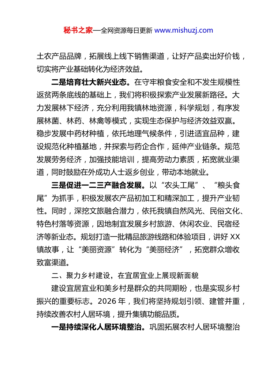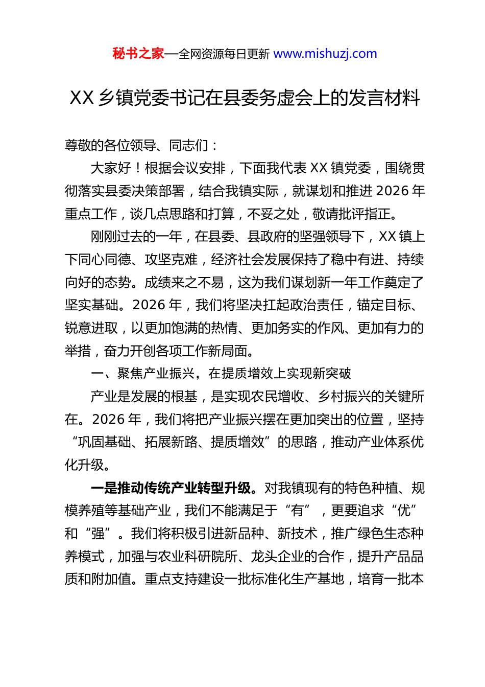 秘书之家—全网资源每日更新 www.mishuzj.comXX 乡镇党委书记在县委务虚会上的发言材料尊敬的各位领导、同志们:大家好!根据会议安排,下面我代表 XX 镇党委,围绕贯彻落实县委决策部署,结合我镇实际,就谋划和推进 2026 年重点工作,谈几点思路和打算,不妥之处,敬请批评指正。刚刚过去的一年,在县委、县政府的坚强领导下,XX 镇上下同心同德、攻坚克难,经济社会发展保持了稳中有进、持续向好的态势。成绩来之不易,这为我们谋划新一年工作奠定了坚实基础。2026 年,我们将坚决扛起政治责任,锚定目标、锐意进取,以更加饱满的热情、更加务实的作风、更加有力的举措,奋力开创各项工作新局面。一、聚焦产业振兴,在提质增效上实现新突破产业是发展的根基,是实现农民增收、乡村振兴的关键所在。2026 年,我们将把产业振兴摆在更加突出的位置,坚持“巩固基础、拓展新路、提质增效”的思路,推动产业体系优化升级。一是推动传统产业转型升级。对我镇现有的特色种植、规模养殖等基础产业,我们不能满足于“有”,更要追求“优”和“强”。我们将积极引进新品种、新技术,推广绿色生态种养模式,加强与农业科研院所、龙头企业的合作,提升产品品质和附加值。重点支持建设一批标准化生产基地,培育一批本秘书之家—全网资源每日更新 www.mishuzj.com土农产品品牌,拓展线上线下销售渠道,让好产品卖出好价钱,切实将产业基础转化为经济效益。二是培育壮大新兴业态。在守牢粮食安全和不发生规模性返贫两条底线的基础上,我们将积极探索产业发展新路径。大力发展林下经济,充分利用我镇林地资源,科学规划,有序发展林菌、林药、林禽等模式,实现生态保护与经济效益双赢。稳步发展中药材种植,依托地理气候条件,引进适宜品种,建设规范化种植基地,并探索与药企合作,延伸产业链条。规范发展劳务经济,加强技能培训,提高劳动力素质,拓宽就业渠道,同时鼓励在外成功人士返乡创业,带动本地就业。三是促进一二三产融合发展。以“农头工尾”、“粮头食尾”为抓手,积极发展农产品初加工和精深加工,提升产业韧性。同时,深挖文旅融合潜力,依托我镇自然风光、民俗文化、特色村落等资源,因地制宜发展乡村旅游、休闲农业、民宿经济等新业态。规划打造一批精品旅游线路和体验项目,讲好 XX镇故事,让“美丽资源”转化为“美丽经济”,拓宽群众增收致富渠道。二、聚力乡村建设,在宜居宜业上展现新面貌建设宜居宜业和美乡村是群众的共同期盼,也是实现乡村振兴的重要标志。2026 年,我们将坚持规划引领、建管并重,持续改善农村人居环境,提升集镇功能品质。一是持续深化人居环境整治。巩固拓展农村人居环境整治秘书之家—全网资源每日更新 www.mishuzj.com提升成果,建立健全长效管护机制。聚焦农村厕所革命、生活垃圾和污水治理、村容村貌提升等关键环节,发动群众积极参与,实现从“一时美”向“持久美”转变。深入开展“美丽庭院”创建等活动,营造人人爱护环境、共建美好家园的浓厚氛围。二是提升集镇综合承载能力。强化集镇规划管理,完善水、电、路、气、讯等基础设施配套。加强集镇环境卫生、市场秩序、交通秩序等方面的精细化治理,提升公共服务水平。探索推进智慧乡镇建设,提高管理效率和服务能力,让集镇更加整洁、有序、便捷,成为服务农民的区域中心。三是加强基础设施和公共服务短板。积极争取项目资金,持续改善农村道路、水利等基础设施条件。推动教育、医疗、养老、文化等公共服务资源向农村倾斜,促进城乡基本公共服务均等化。特别要关注“一老一小”等特殊群体的需求,织密织牢民生保障网。三、筑牢平安基石,在治理有效上构建新格局安全稳定是发展的前提和保障。2026 年,我们将牢固树立底线思维和风险意识,以更高标准、更实举措推进平安 XX建设,确保社会大局和谐稳定。一是常态化开展矛盾纠纷排查化解。坚持和发展新时代“枫桥经验”,健全镇村组三级矛盾纠纷调解网络,发挥好网格员、调解员作用,做到早发现、早介入、早化解。畅通和规秘书之家—全网资源每日更新 www.mishuzj.com范群众诉求表达、利益协调、权益保障通道,努力将矛盾化解在...
