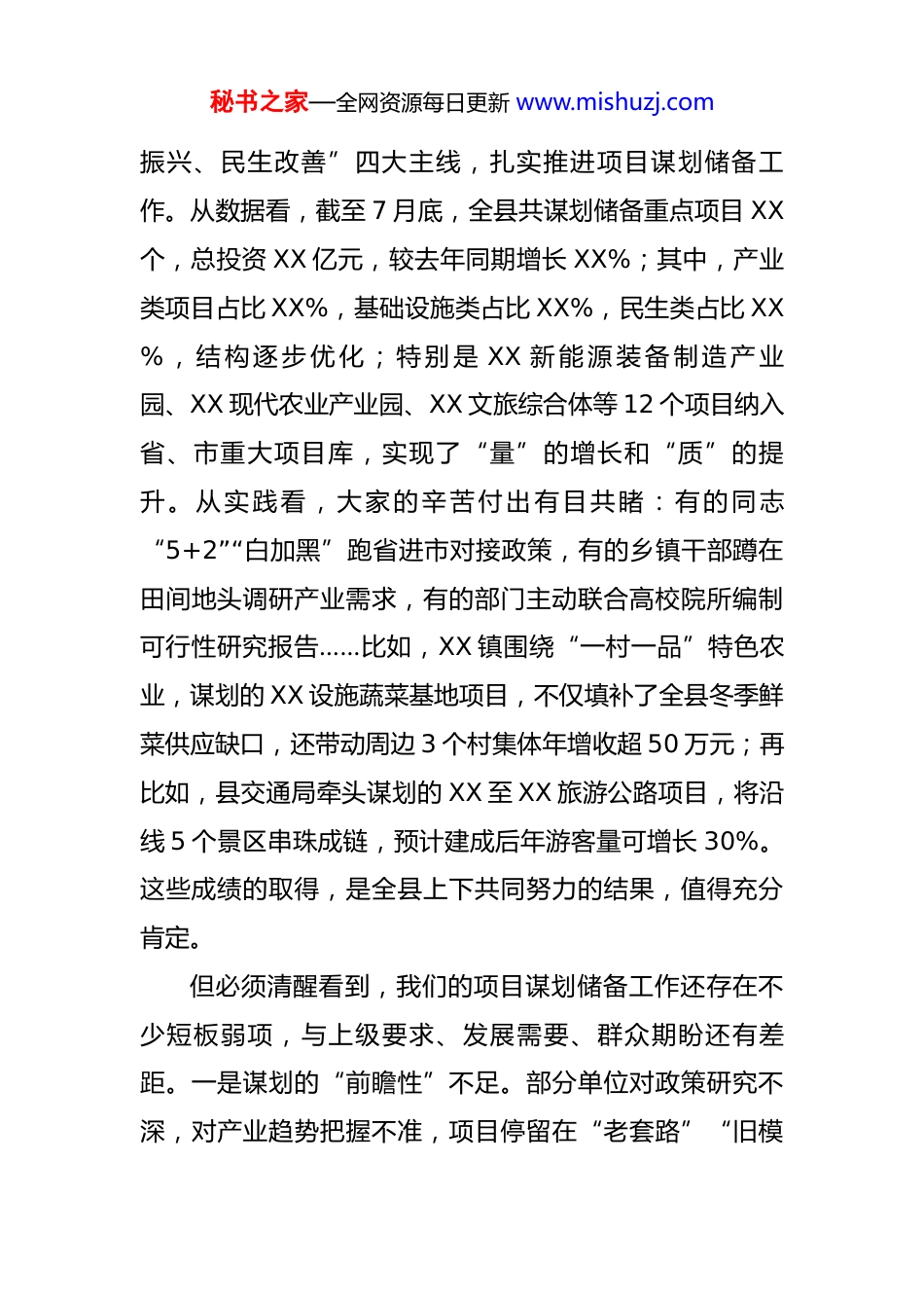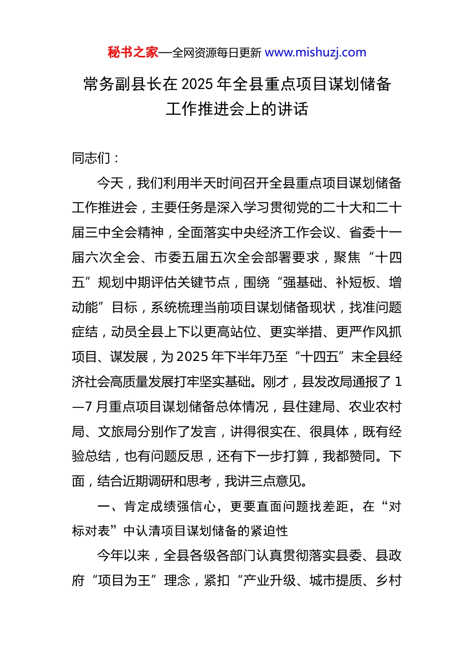 秘书之家—全网资源每日更新 www.mishuzj.com常务副县长在 2025 年全县重点项目谋划储备工作推进会上的讲话 同志们:今天,我们利用半天时间召开全县重点项目谋划储备工作推进会,主要任务是深入学习贯彻党的二十大和二十届三中全会精神,全面落实中央经济工作会议、省委十一届六次全会、市委五届五次全会部署要求,聚焦“十四五”规划中期评估关键节点,围绕“强基础、补短板、增动能”目标,系统梳理当前项目谋划储备现状,找准问题症结,动员全县上下以更高站位、更实举措、更严作风抓项目、谋发展,为 2025 年下半年乃至“十四五”末全县经济社会高质量发展打牢坚实基础。刚才,县发改局通报了 1—7 月重点项目谋划储备总体情况,县住建局、农业农村局、文旅局分别作了发言,讲得很实在、很具体,既有经验总结,也有问题反思,还有下一步打算,我都赞同。下面,结合近期调研和思考,我讲三点意见。一、肯定成绩强信心,更要直面问题找差距,在“对标对表”中认清项目谋划储备的紧迫性今年以来,全县各级各部门认真贯彻落实县委、县政府“项目为王”理念,紧扣“产业升级、城市提质、乡村秘书之家—全网资源每日更新 www.mishuzj.com振兴、民生改善”四大主线,扎实推进项目谋划储备工作。从数据看,截至 7 月底,全县共谋划储备重点项目 XX个,总投资 XX 亿元,较去年同期增长 XX%;其中,产业类项目占比 XX%,基础设施类占比 XX%,民生类占比 XX% , 结 构 逐 步 优 化 ; 特 别 是 XX 新 能 源 装 备 制 造 产 业园、XX 现代农业产业园、XX 文旅综合体等 12 个项目纳入省、市重大项目库,实现了“量”的增长和“质”的提升。从实践看,大家的辛苦付出有目共睹:有的同志“5+2”“白加黑”跑省进市对接政策,有的乡镇干部蹲在田间地头调研产业需求,有的部门主动联合高校院所编制可行性研究报告……比如,XX 镇围绕“一村一品”特色农业,谋划的 XX 设施蔬菜基地项目,不仅填补了全县冬季鲜菜供应缺口,还带动周边 3 个村集体年增收超 50 万元;再比如,县交通局牵头谋划的 XX 至 XX 旅游公路项目,将沿线 5 个景区串珠成链,预计建成后年游客量可增长 30%。这些成绩的取得,是全县上下共同努力的结果,值得充分肯定。但必须清醒看到,我们的项目谋划储备工作还存在不少短板弱项,与上级要求、发展需要、群众期盼还有差距。一是谋划的“前瞻性”不足。部分单位对政策研究不深,对产业趋势把握不准,项目停留在“老套路”“旧模秘书之家—全网资源每日更新 www.mishuzj.com式”上。比如,有的乡镇谋划农业项目,还停留在“种玉米、养牛羊”的传统思路,对智慧农业、预制菜加工等新业态关注不够;有的部门申报基建项目,只算“当前账”,不谋“长远势”,管网、绿化等配套设施设计标准偏低,建成后不久就面临升级改造,造成资源浪费。二是储备的“含金量”不高。从项目库看,真正能支撑县域经济转型升级的“大块头”“高附加值”项目偏少,特别是战略性新兴产业项目占比仅 XX%(低于全市平均水平 XX个百分点);有的项目前期论证不充分,“可行性研究”变成“可批性研究”,土地、环评、资金等要素保障没提前落实用地指标、环评手续不全等问题,导致项目“一报就卡壳、一批就搁浅”。三是推进的“协同性”不强。部分单位存在“重谋划、轻落地”倾向,项目储备与前期推进“两张皮”;有的部门之间信息不通、配合不畅,比如在园区项目落地中,自然资源部门核土地指标、生态环境部门审环评报告、住建部门办施工许可,本应环环相扣,但个别环节出现“踢皮球”,导致项目落地周期延长 2—3个月;还有的乡镇对上级政策“一知半解”,争取项目时“眉毛胡子一把抓”,资源分散,难以形成合力。同志们,项目是经济发展的“生命线”,更是民生改善的“支撑点”。当前,我县正处于“十四五”规划承上秘书之家—全网资源每日更新 www.mishuzj.com启下的关键期、产业转型的攻坚期、城市能级提升的突破期,无论是完成全年 GDP 增长 XX%的目标,还是实现“建设 XX 区域中心城市”的定位,都需要一批大项目、好项目来拉动。...