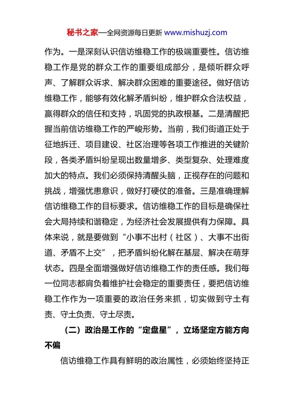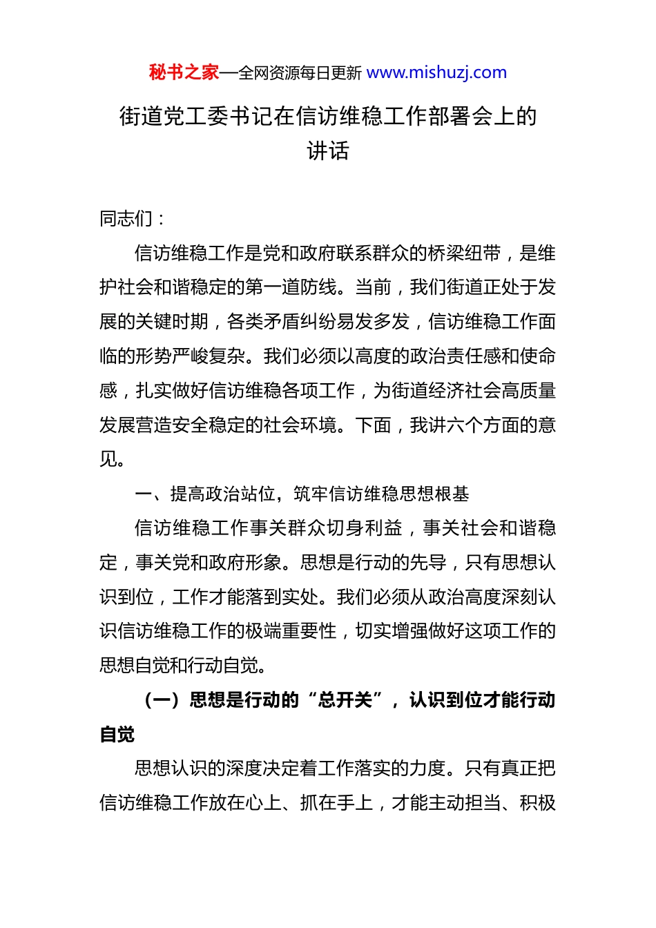 秘书之家—全网资源每日更新 www.mishuzj.com街道党工委书记在信访维稳工作部署会上的讲话 同志们:信访维稳工作是党和政府联系群众的桥梁纽带,是维护社会和谐稳定的第一道防线。当前,我们街道正处于发展的关键时期,各类矛盾纠纷易发多发,信访维稳工作面临的形势严峻复杂。我们必须以高度的政治责任感和使命感,扎实做好信访维稳各项工作,为街道经济社会高质量发展营造安全稳定的社会环境。下面,我讲六个方面的意见。一、提高政治站位,筑牢信访维稳思想根基信访维稳工作事关群众切身利益,事关社会和谐稳定,事关党和政府形象。思想是行动的先导,只有思想认识到位,工作才能落到实处。我们必须从政治高度深刻认识信访维稳工作的极端重要性,切实增强做好这项工作的思想自觉和行动自觉。(一)思想是行动的“总开关”,认识到位才能行动自觉思想认识的深度决定着工作落实的力度。只有真正把信访维稳工作放在心上、抓在手上,才能主动担当、积极秘书之家—全网资源每日更新 www.mishuzj.com作为。一是深刻认识信访维稳工作的极端重要性。信访维稳工作是党的群众工作的重要组成部分,是倾听群众呼声、了解群众诉求、解决群众困难的重要途径。做好信访维稳工作,能够有效化解矛盾纠纷,维护群众合法权益,赢得群众的信任和支持,巩固党的执政根基。二是清醒把握当前信访维稳工作的严峻形势。当前,我们街道正处于征地拆迁、项目建设、社区治理等各项工作推进的关键阶段,各类矛盾纠纷呈现出数量增多、类型复杂、处理难度加大的特点。我们必须保持清醒头脑,正视存在的问题和挑战,增强忧患意识,做好打硬仗的准备。三是准确理解信访维稳工作的目标要求。信访维稳工作的目标是确保社会大局持续和谐稳定,为经济社会发展提供有力保障。具体来说,就是要做到“小事不出村(社区)、大事不出街道、矛盾不上交”,把矛盾纠纷化解在基层、解决在萌芽状态。四是全面增强做好信访维稳工作的责任感。我们每一位同志都肩负着维护社会稳定的重要责任,要把信访维稳工作作为一项重要的政治任务来抓,切实做到守土有责、守土负责、守土尽责。(二)政治是工作的“定盘星”,立场坚定方能方向不偏信访维稳工作具有鲜明的政治属性,必须始终坚持正秘书之家—全网资源每日更新 www.mishuzj.com确的政治方向,站稳政治立场,严守政治纪律和政治规矩。一是坚定政治信仰。要坚持以习近平新时代中国特色社会主义思想为指导,深入学习贯彻习近平总书记关于信访工作、政法工作的重要论述,增强“四个意识”、坚定“四个自信”、做到“两个维护”,始终在思想上政治上行动上同以习近平同志为核心的党中央保持高度一致。二是站稳政治立场。要始终坚持以人民为中心的发展思想,把群众满意作为衡量信访维稳工作的根本标准,切实解决好群众最关心、最直接、最现实的利益问题,不断增强群众的获得感、幸福感、安全感。三是严守政治纪律。要严格遵守党的政治纪律和政治规矩,在信访维稳工作中坚决贯彻执行党中央和上级党委的决策部署,不打折扣、不搞变通,确保政令畅通。四是提升政治能力。要不断提高政治判断力、政治领悟力、政治执行力,善于从政治上分析问题、解决问题,在复杂矛盾和严峻考验面前保持政治定力,牢牢掌握信访维稳工作的主动权。(三)大局是行动的“指南针”,胸怀全局才可谋划长远信访维稳工作是服务大局、保障大局的重要工作,必须放到街道经济社会发展大局中去谋划、去推进。一是围绕发展大局谋划工作。要紧紧围绕街道的中心工作和发展秘书之家—全网资源每日更新 www.mishuzj.com目标,找准信访维稳工作与经济发展、项目建设、城市管理等工作的结合点和着力点,为各项工作顺利推进保驾护航。二是服务稳定大局开展工作。要充分认识到稳定是发展的前提和基础,把维护社会稳定作为信访维稳工作的首要任务,全力化解各类矛盾纠纷,消除不稳定因素,为街道发展创造良好环境。三是立足长远大局推进工作。要树立长远眼光,既要解决当前信访维稳工作中存在的突出问题,又要建立健全长效机制,从根本上预防和减少矛盾纠纷的发生,实现信访维稳工作的常态化、规范化、长效化。四是统筹全局...